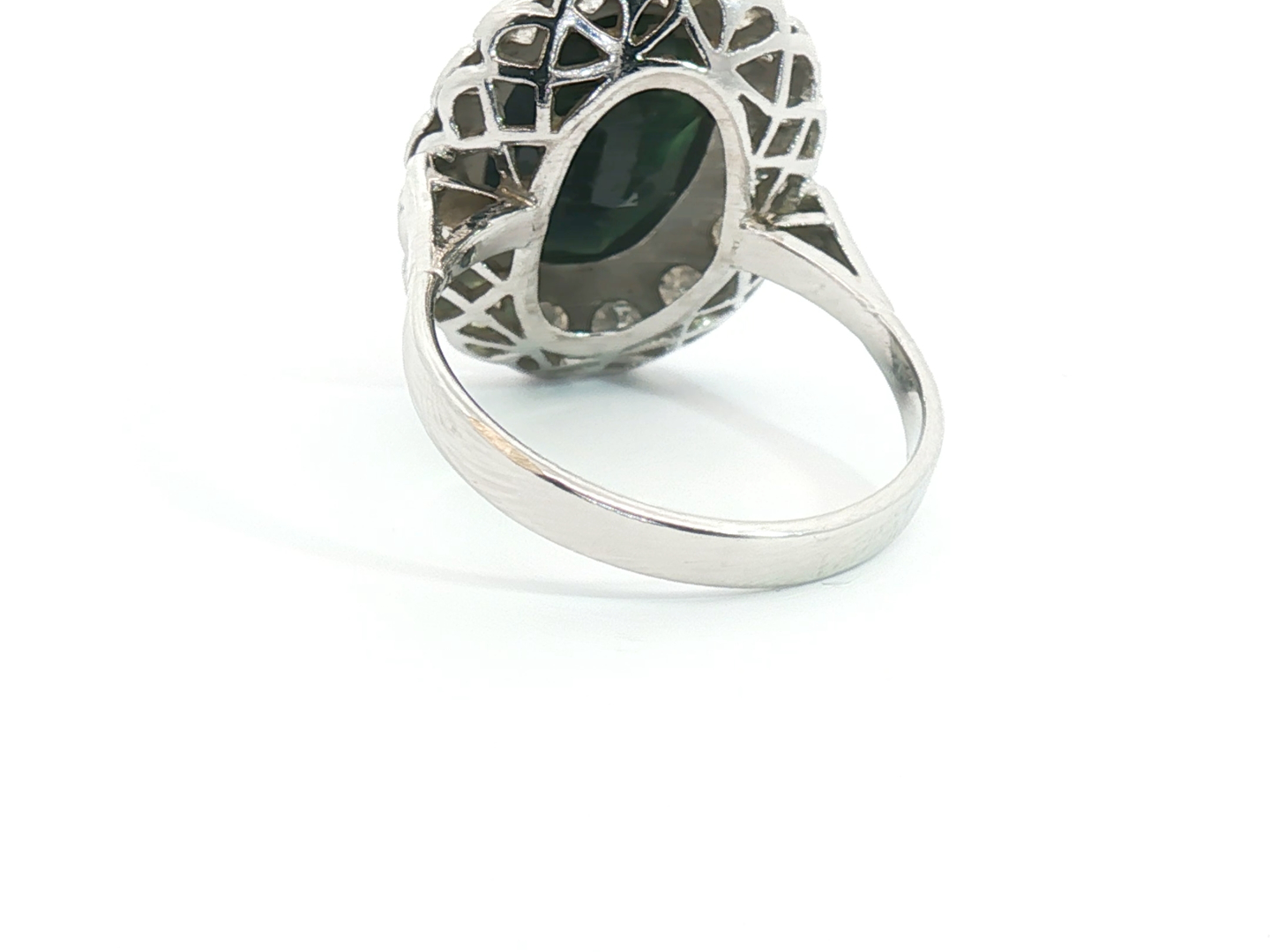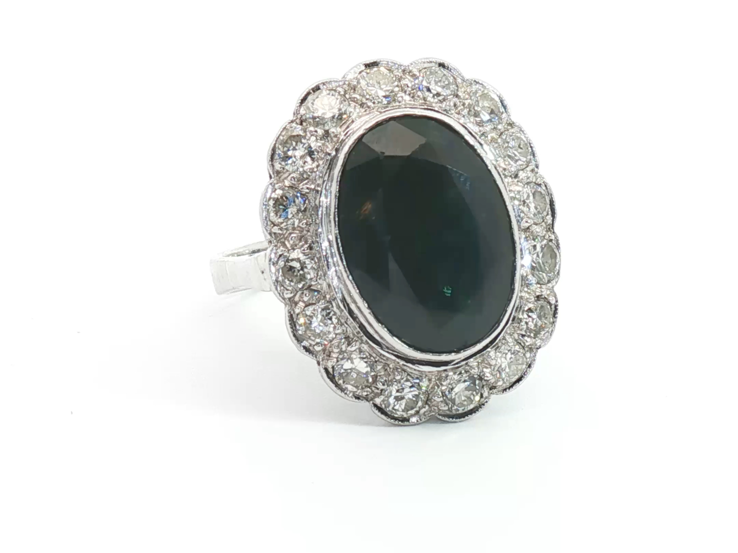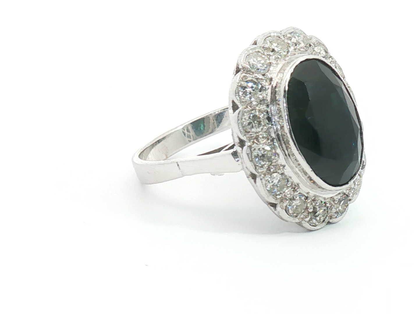Ring circa 1930 met een mooie saffier, omringd door 16 witte diamanten: +-1.20ct, kleur: H-I en zuiverheid: VS. Ingezet in wit goud 18kt. Afmetingen ring: +-20 mm op 16 mm