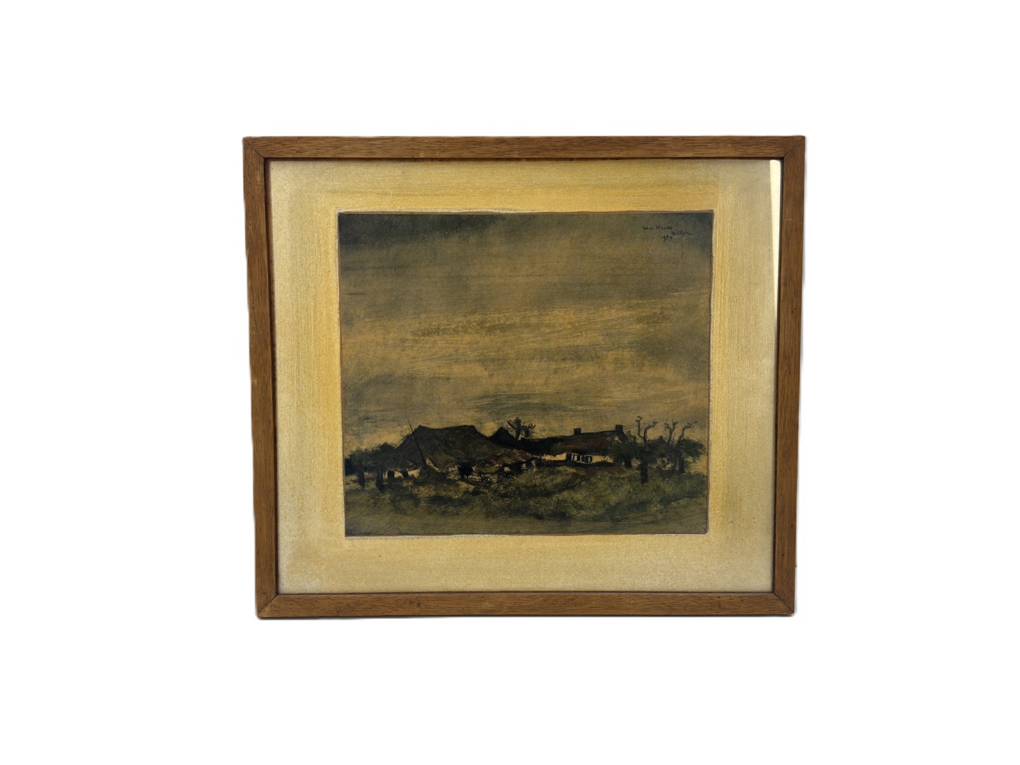 Schilderij olie op paneel getekend: W. Van Hecke, Gemengde technieken: olie + aquarel op papier. 'Hoevezicht'. Afmetingen: 22cm x 26cm