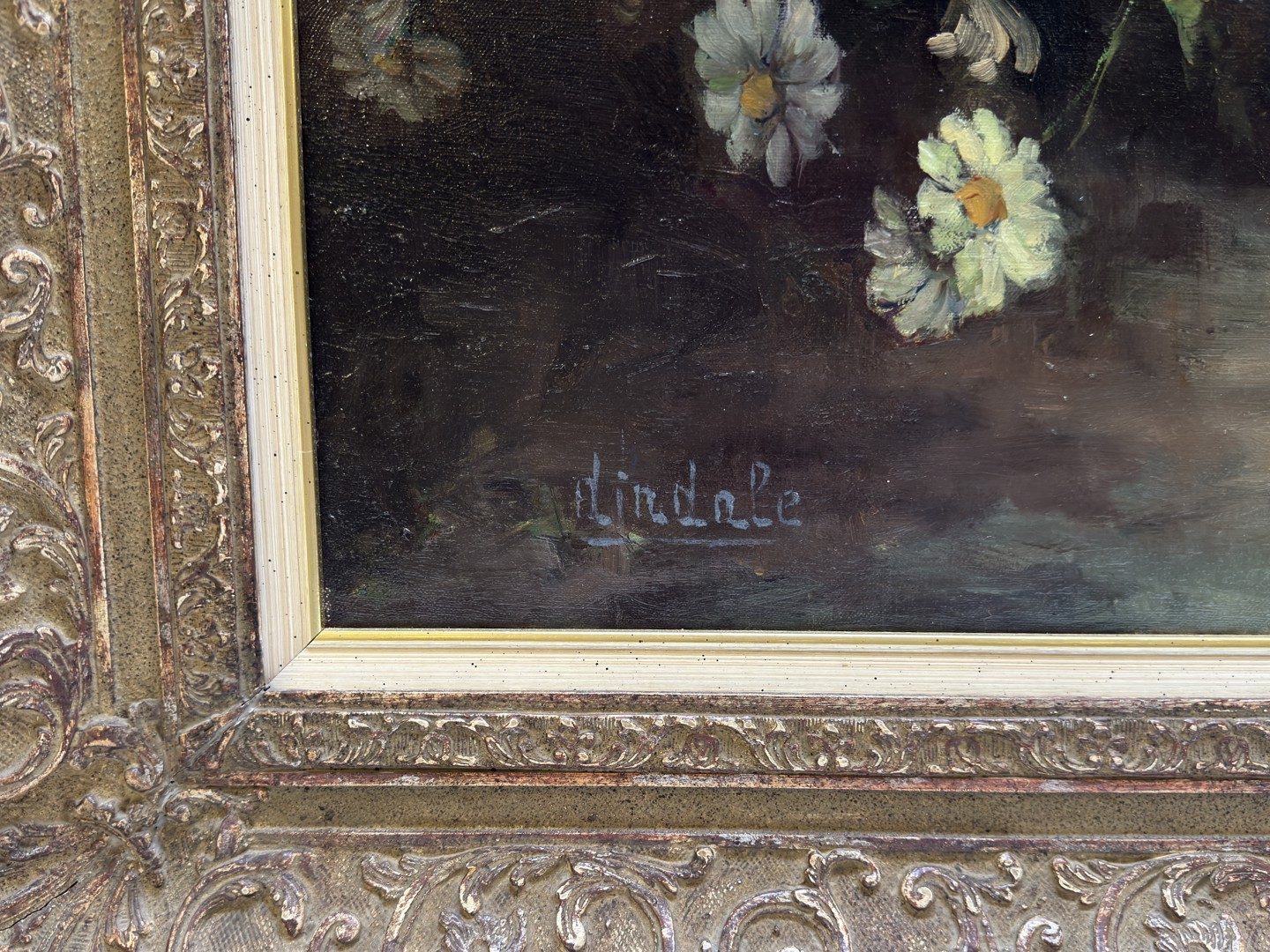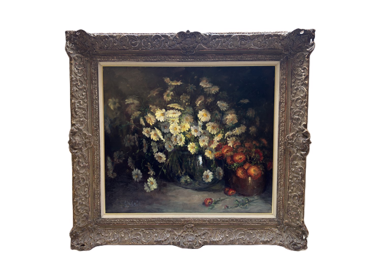 Schilderij olie op doek getekend: Dindale-Etienne, circa 1950. 'Bloemstilleven'. Afmetingen: 70cm x 80cm en met kader: 100cm x 110cm