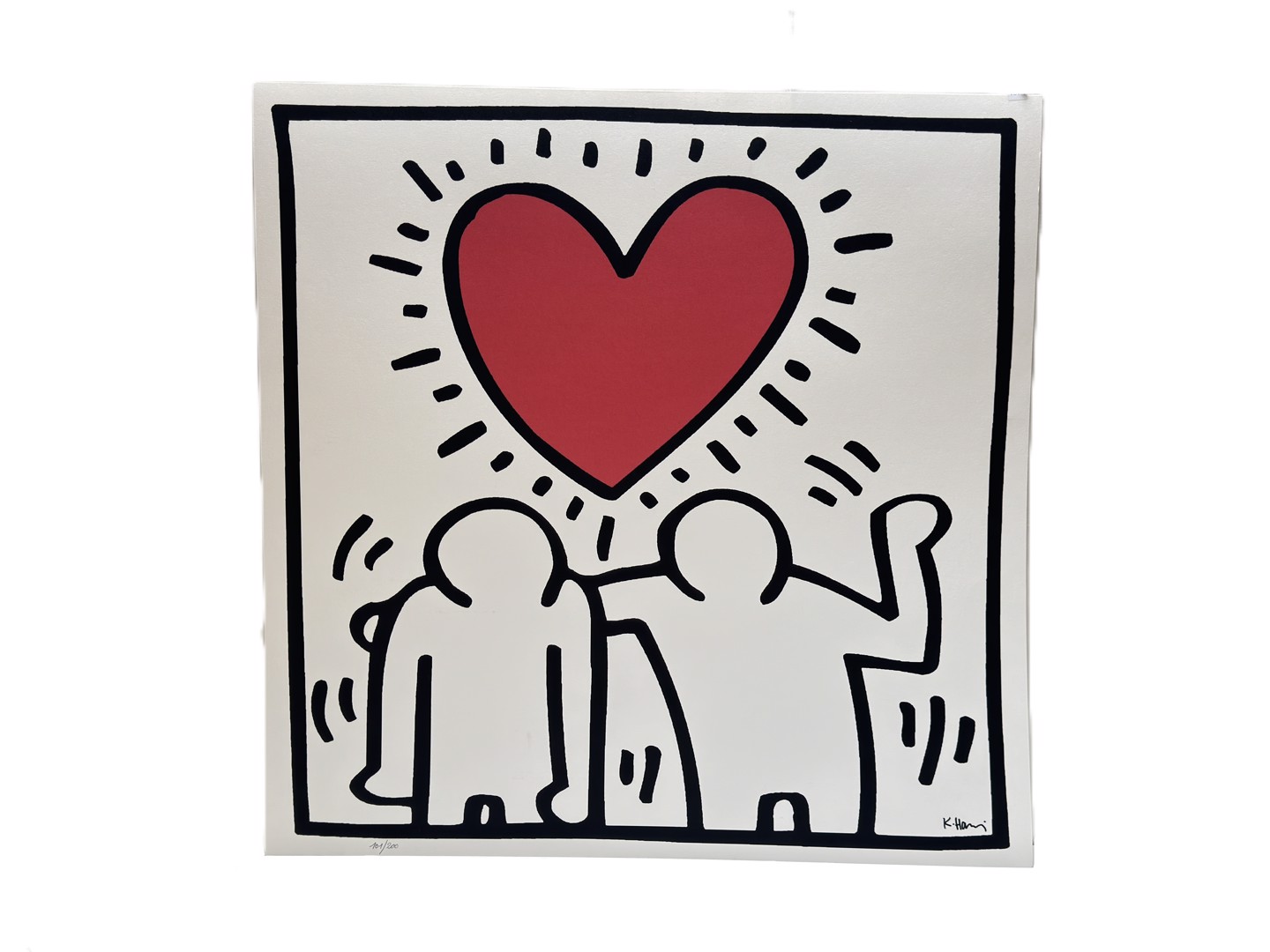 Offset litho van Keith Haring, getekend in de plaat, 'Untitled' 1987. Afmetingen: 85cm x 85cm