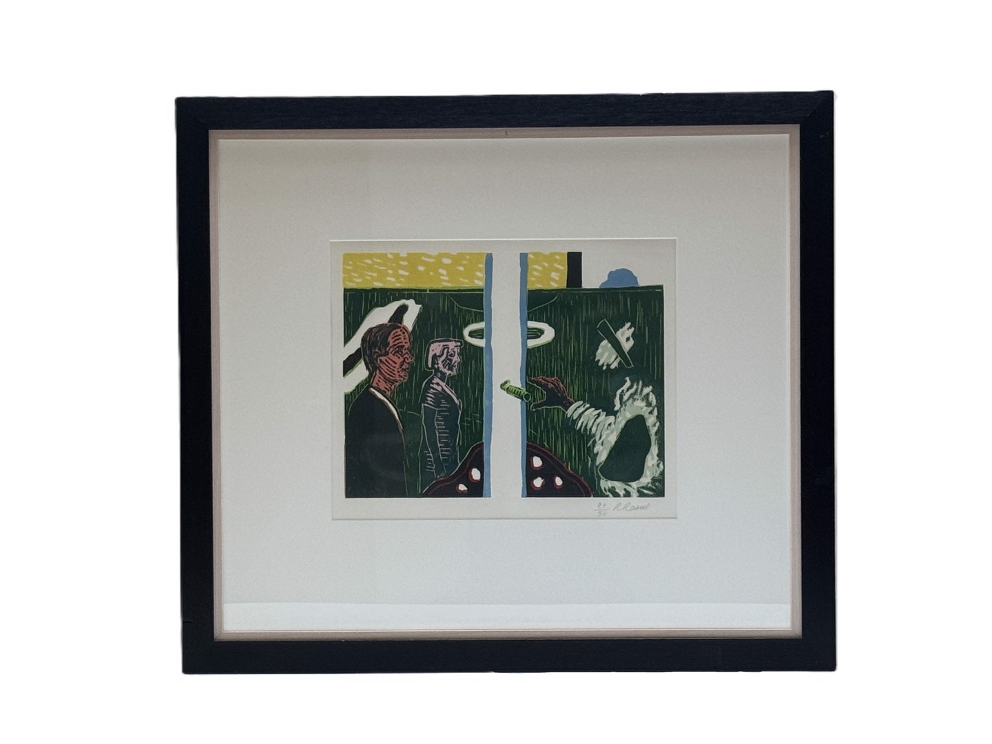 Houtgravure in kleur, getekend in potlood R. Raveel en