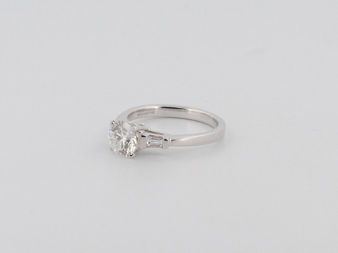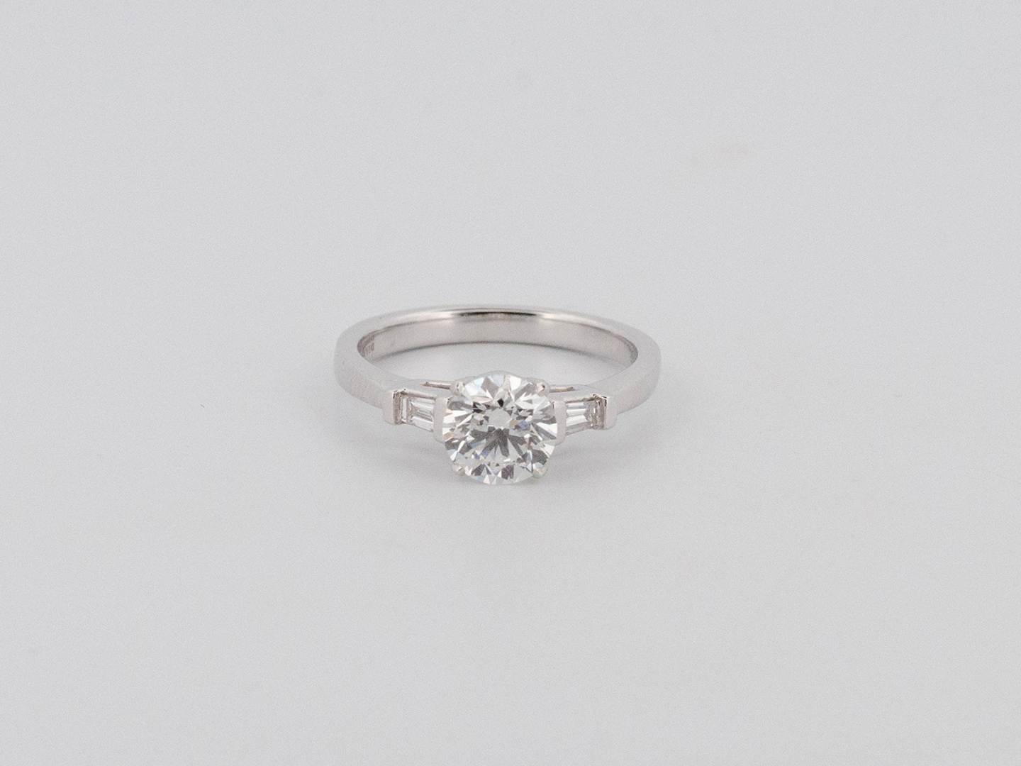 Ring-solitair met kwaliteit briljant van 1.01ct. + 2 baguette geslepen diamanten kleur: D en zuiverheid: VVS 2 ingezet in wit goud 18kt. (gemerkt 750) ringmaat: 51-53 met HRD certificaat