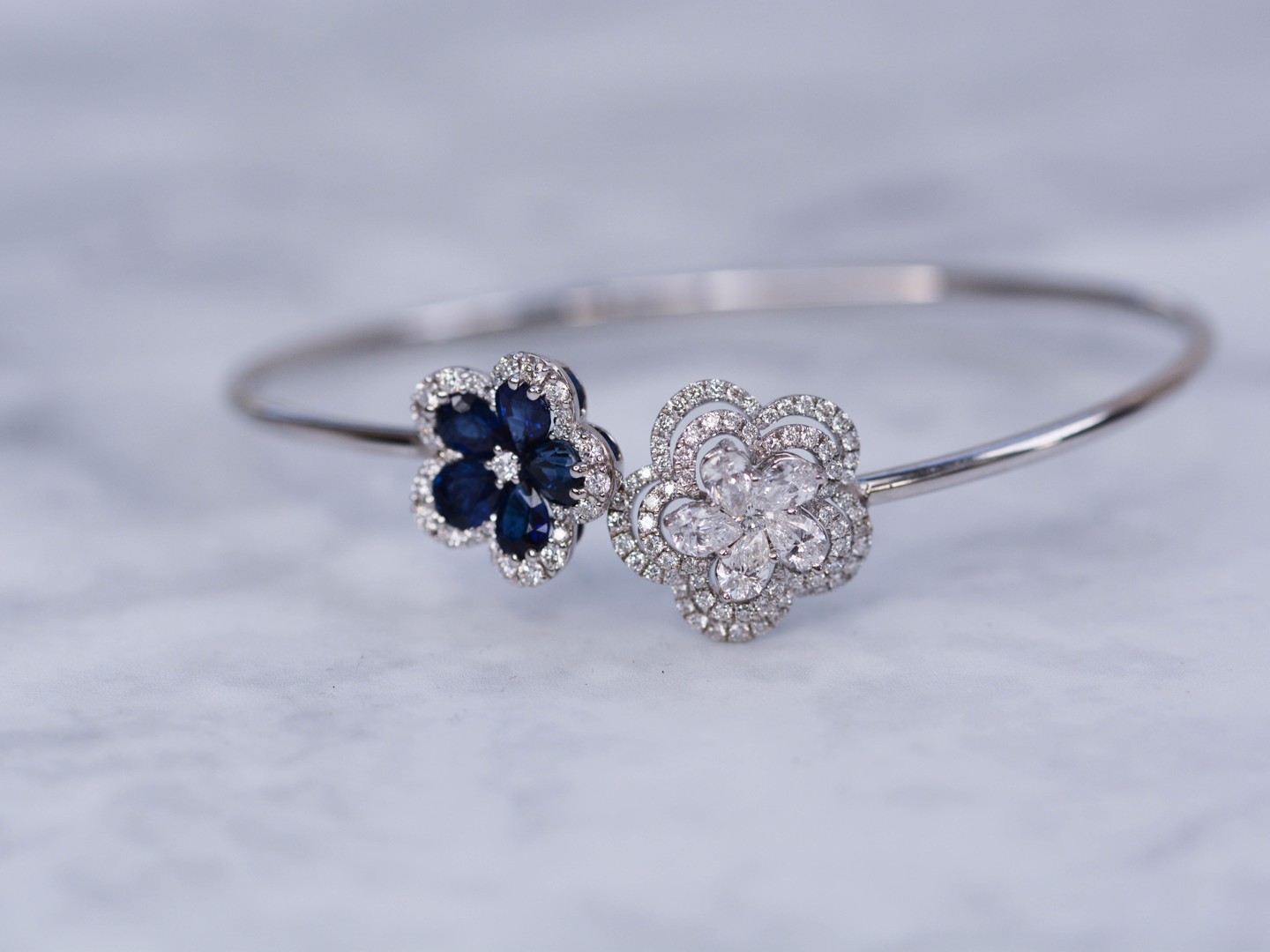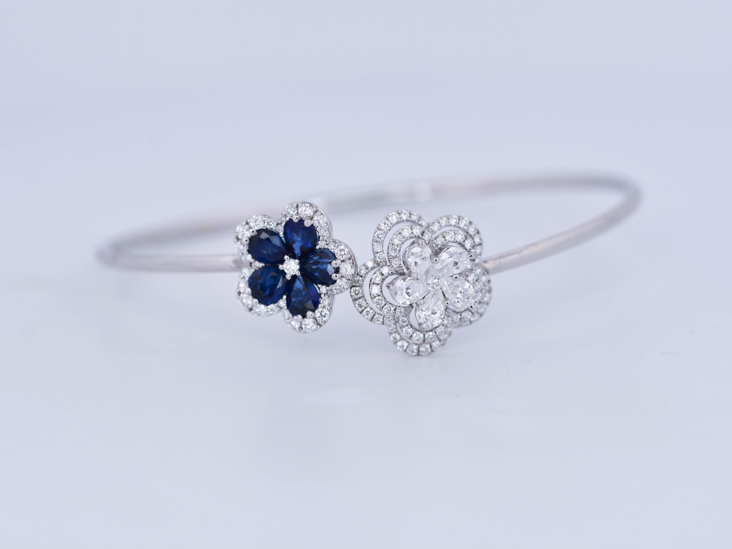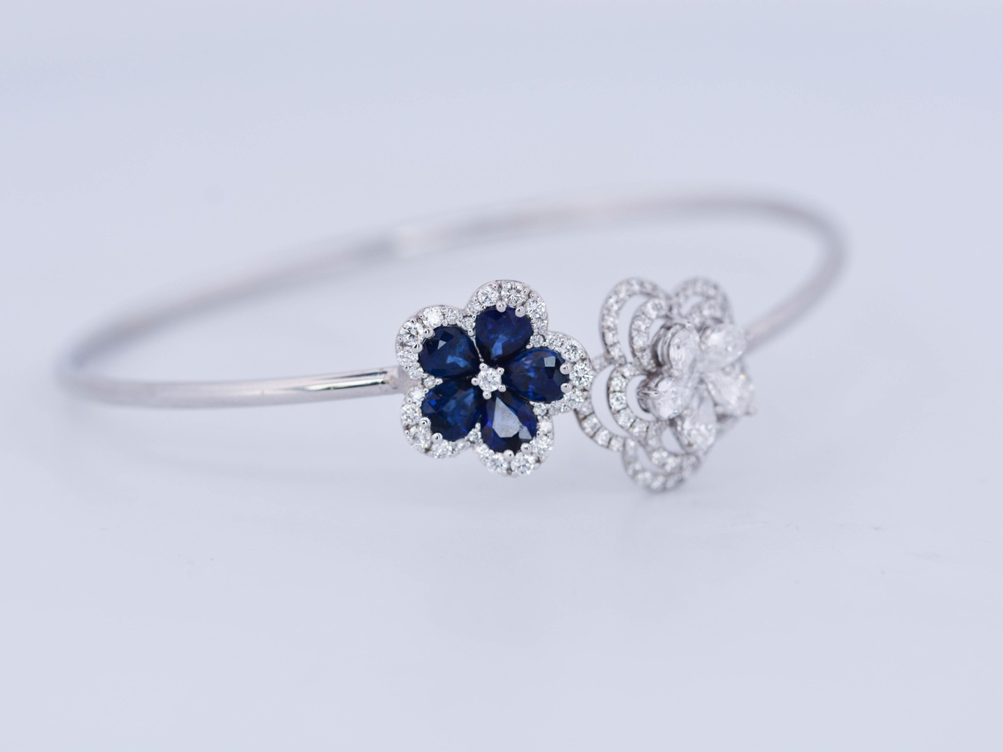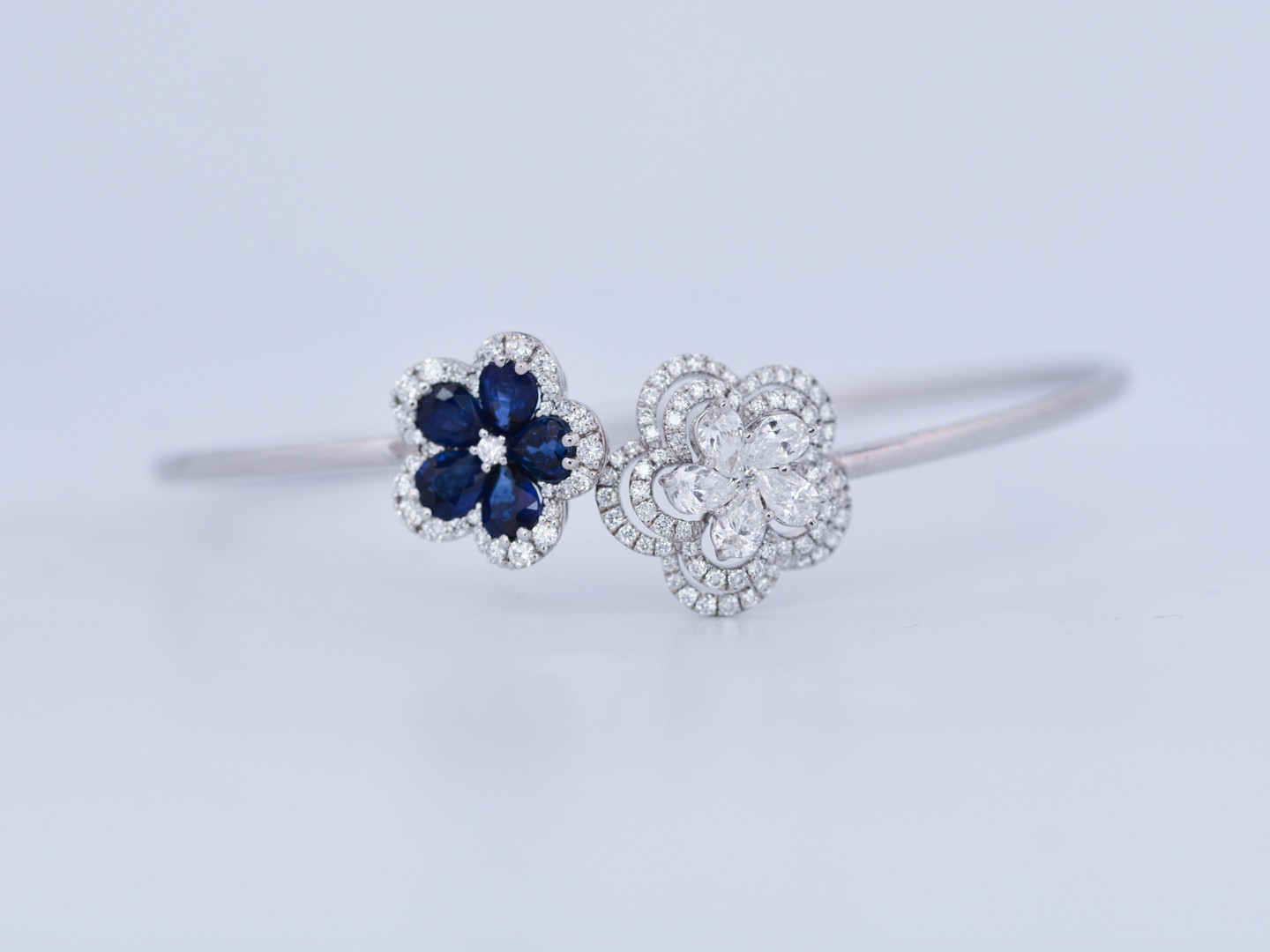 Deze exclusieve armband combineert de zuivere schittering van vijf peergeslepen witte diamanten en briljanten (1,80 ct, kleur F–G, zuiverheid VS) met de diepe, fluwelen glans van vijf saffieren (1,00 ct). Het geheel is zorgvuldig vervaardigd uit 18 karaat wit goud. Binnenmaat: 50–58 mm. Een creatie die elegantie en kleur in perfecte harmonie samenbrengt.