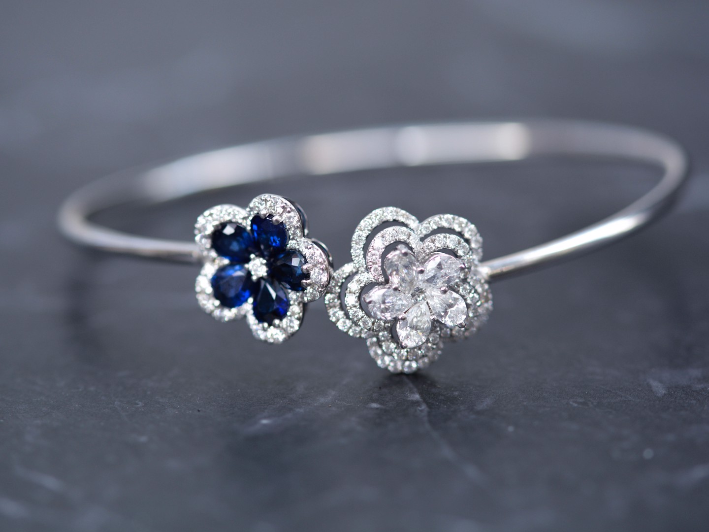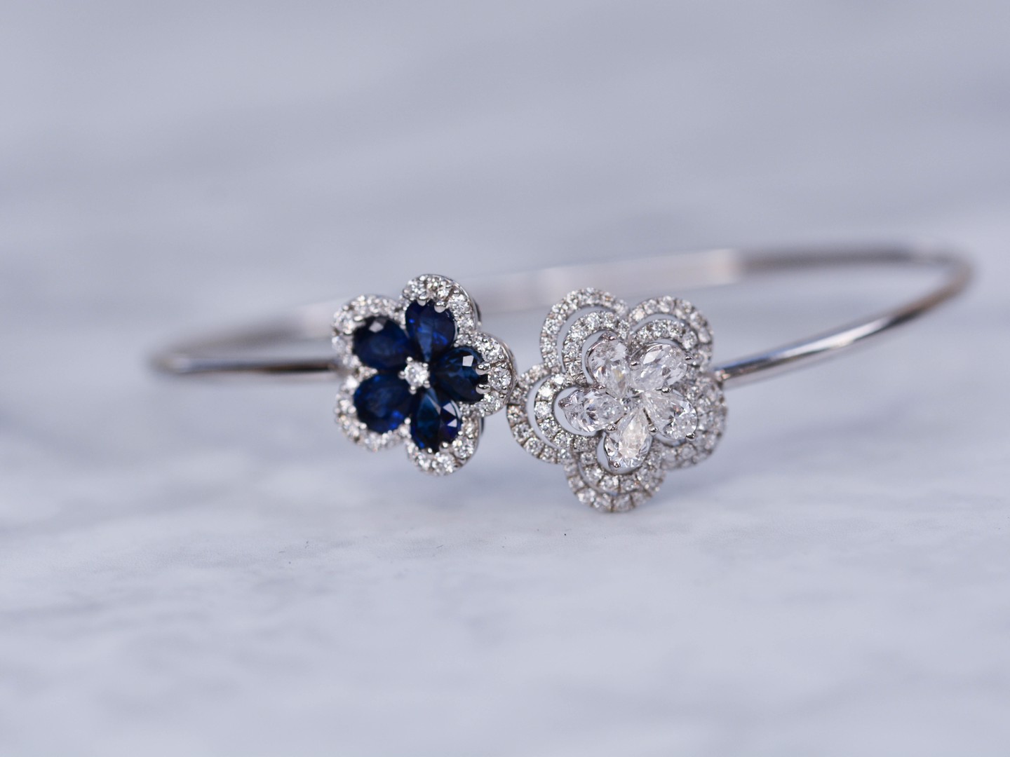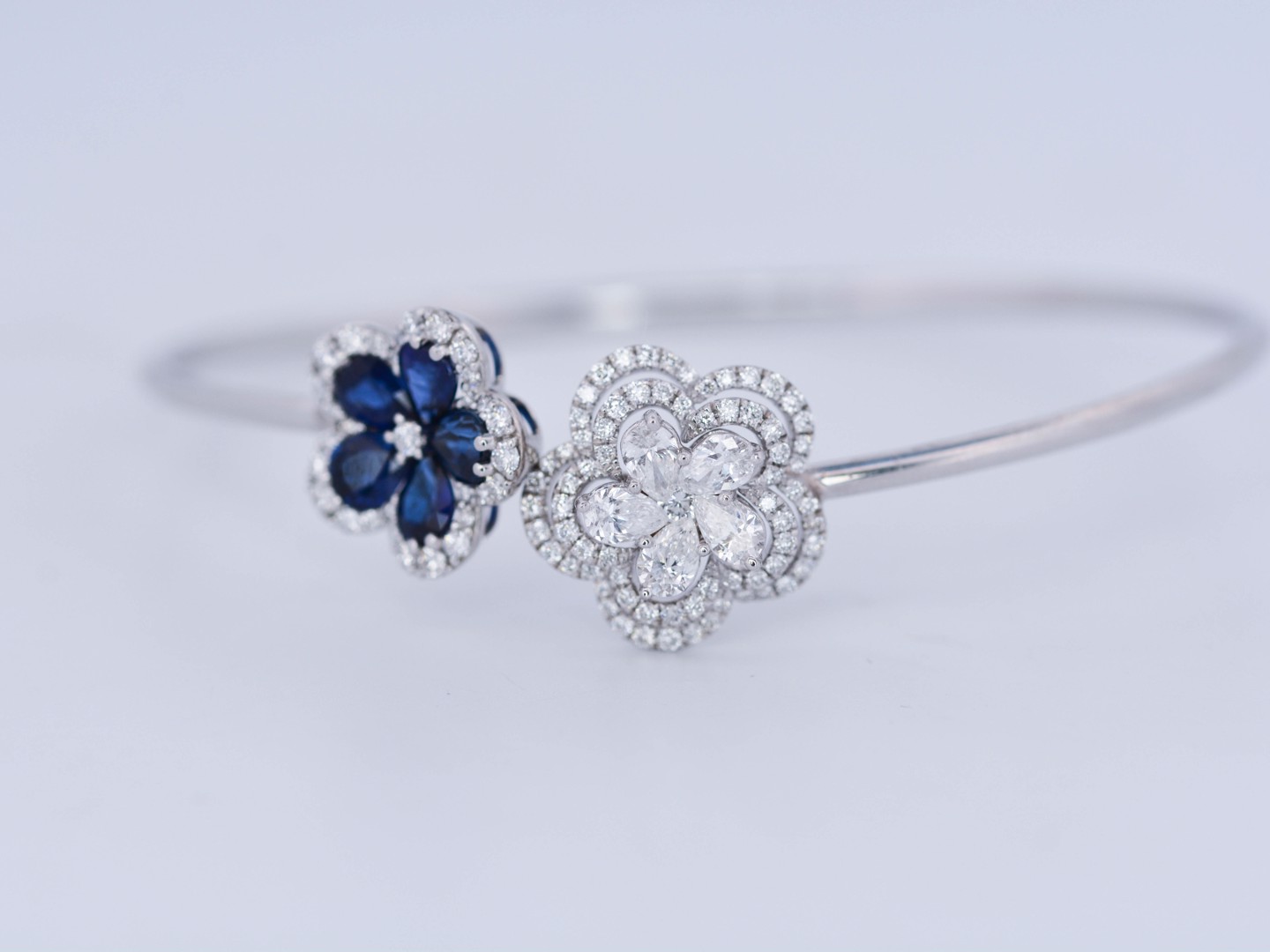 Deze exclusieve armband combineert de zuivere schittering van vijf peergeslepen witte diamanten en briljanten (1,80 ct, kleur F–G, zuiverheid VS) met de diepe, fluwelen glans van vijf saffieren (1,00 ct). Het geheel is zorgvuldig vervaardigd uit 18 karaat wit goud. Binnenmaat: 50–58 mm. Een creatie die elegantie en kleur in perfecte harmonie samenbrengt.