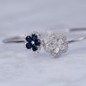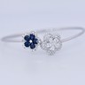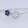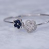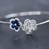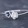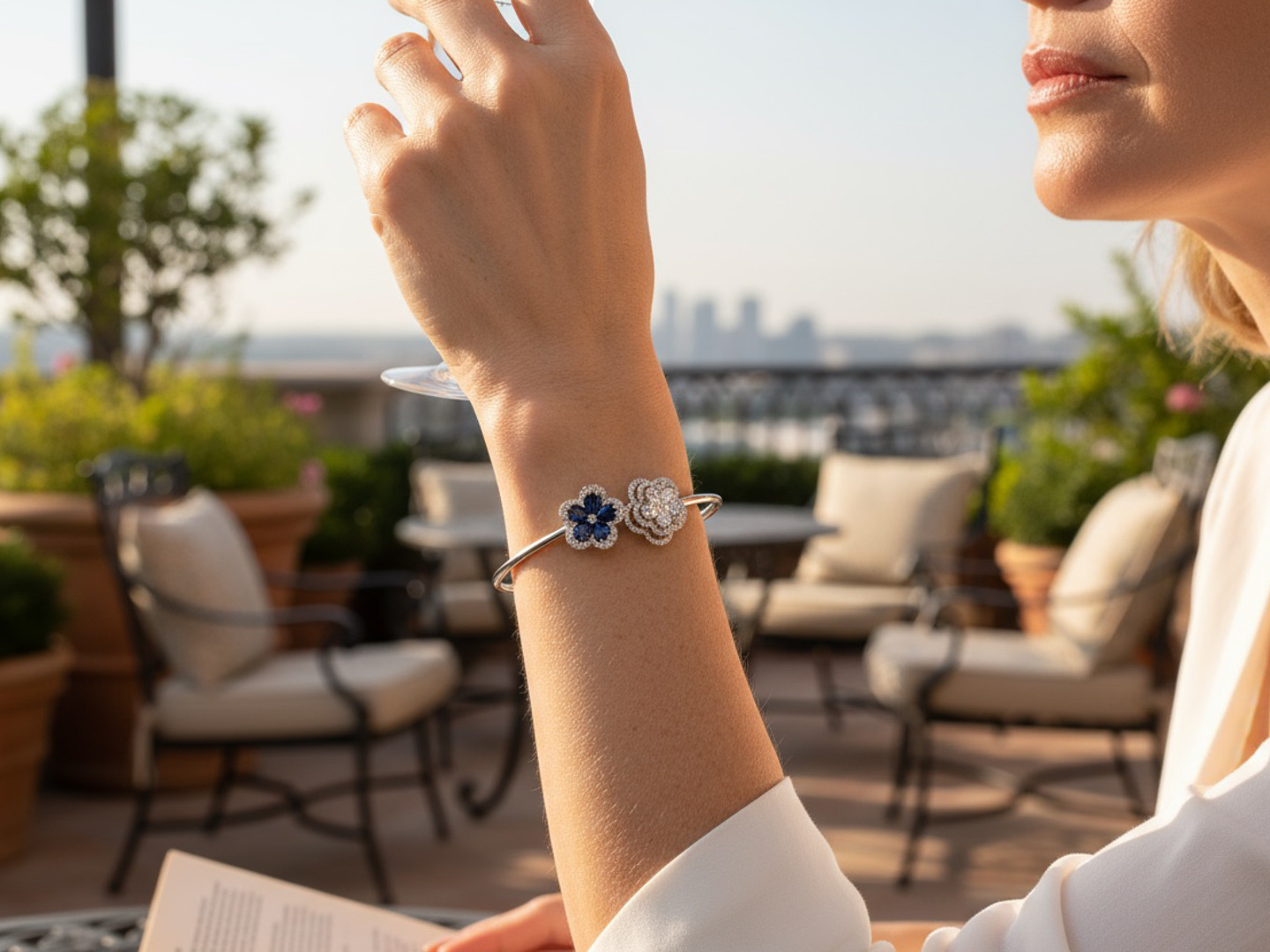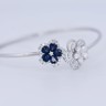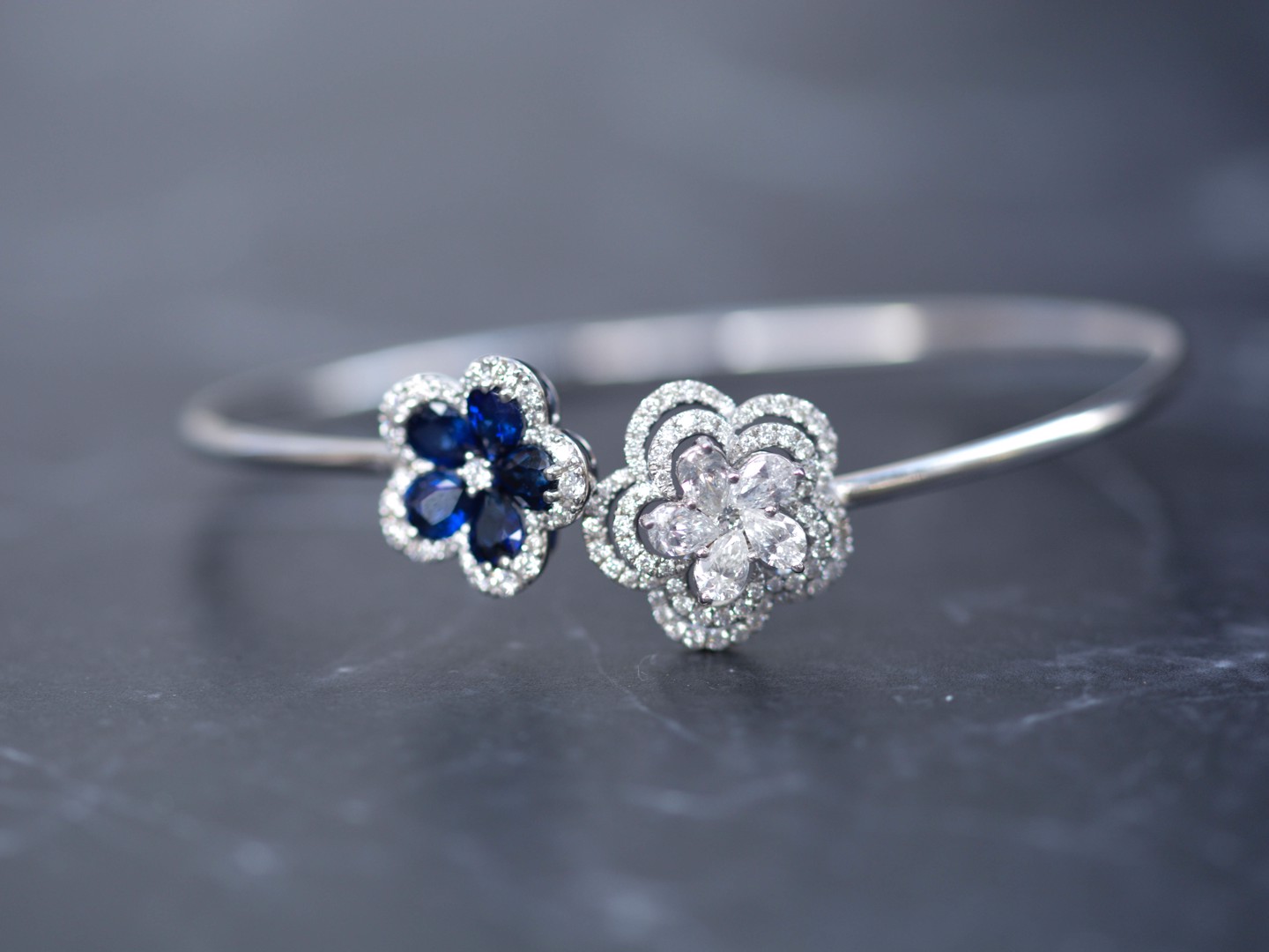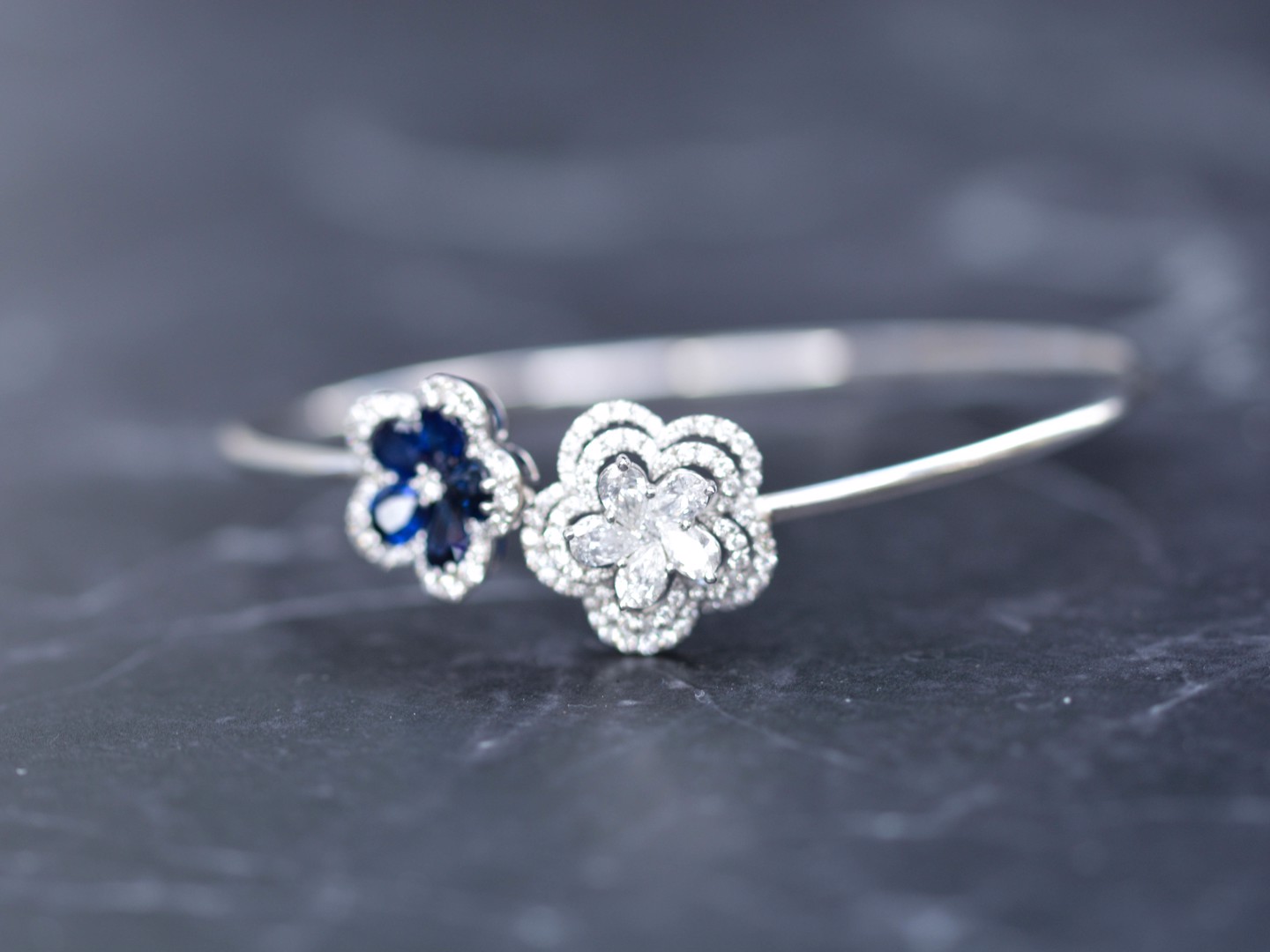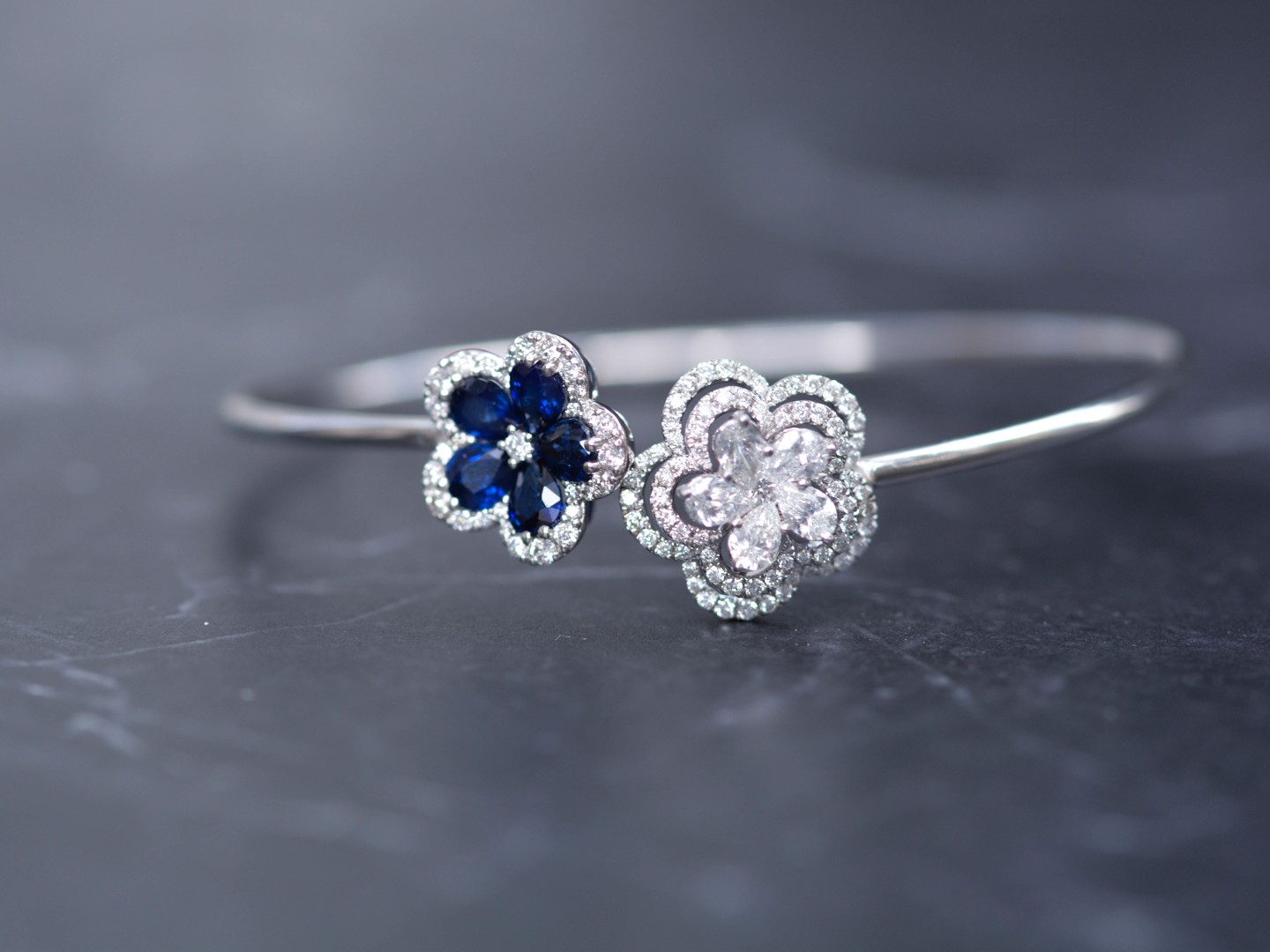 Deze exclusieve armband combineert de zuivere schittering van vijf peergeslepen witte diamanten en briljanten (1,80 ct, kleur F–G, zuiverheid VS) met de diepe, fluwelen glans van vijf saffieren (1,00 ct). Het geheel is zorgvuldig vervaardigd uit 18 karaat wit goud. Binnenmaat: 50–58 mm. Een creatie die elegantie en kleur in perfecte harmonie samenbrengt.