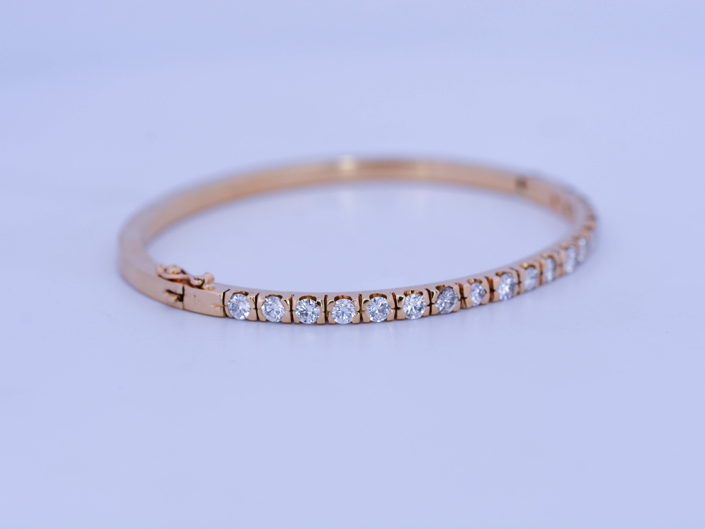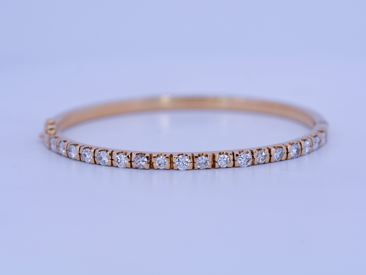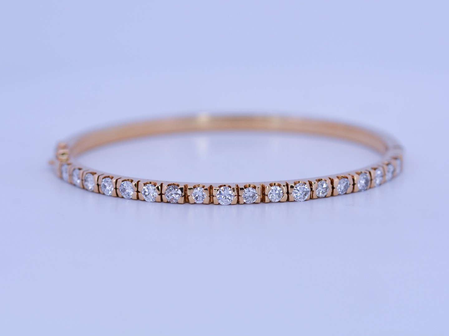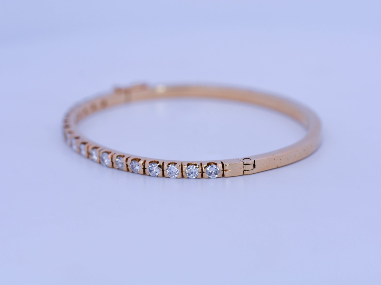 Deze schitterende slavenarmband straalt tijdloze grandeur uit. Bezet met 18 briljantgeslepen diamanten (totaal 3,60 ct, kleur D–F, zuiverheid VS) die fonkelen in hun volle intensiteit. Het juweel is vervaardigd uit 18 karaat geel goud en combineert klassieke elegantie met moderne allure. Binnenmaat: 60 × 52 mm. Gewicht: 17,20 g. Een statement piece dat pure luxe belichaamt.