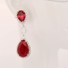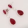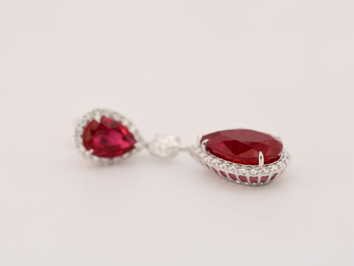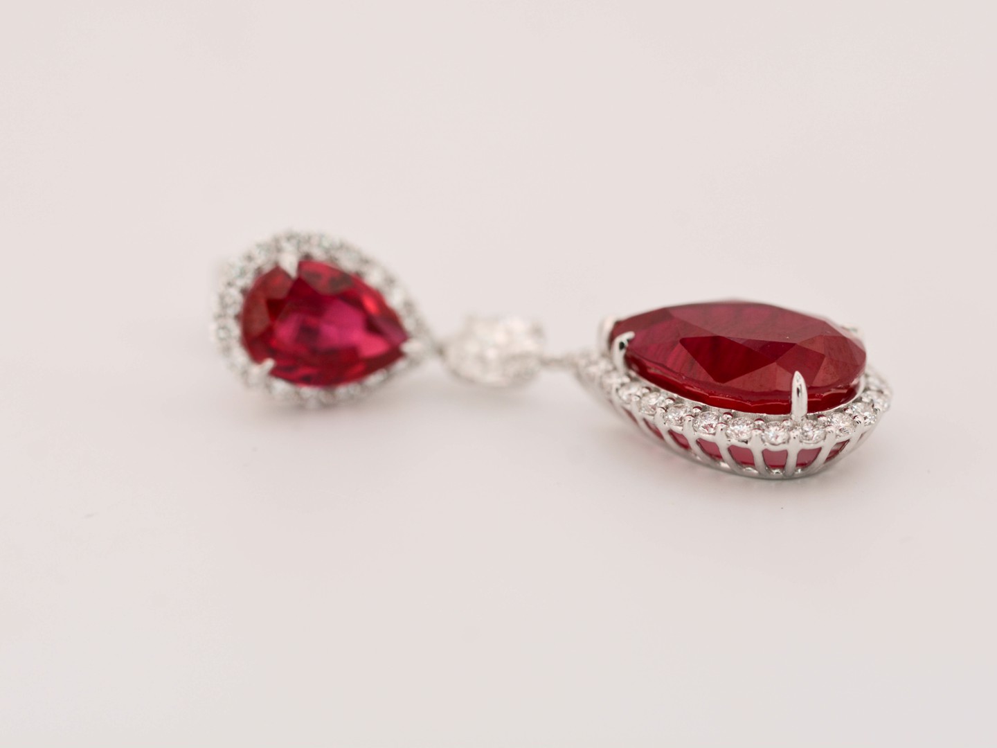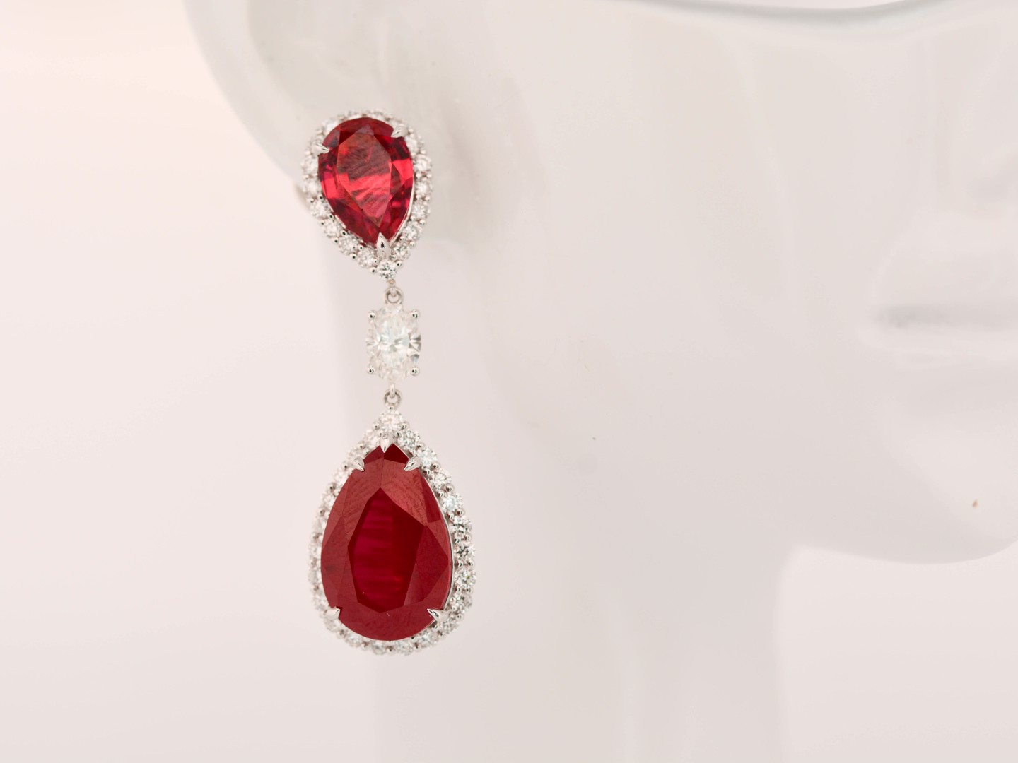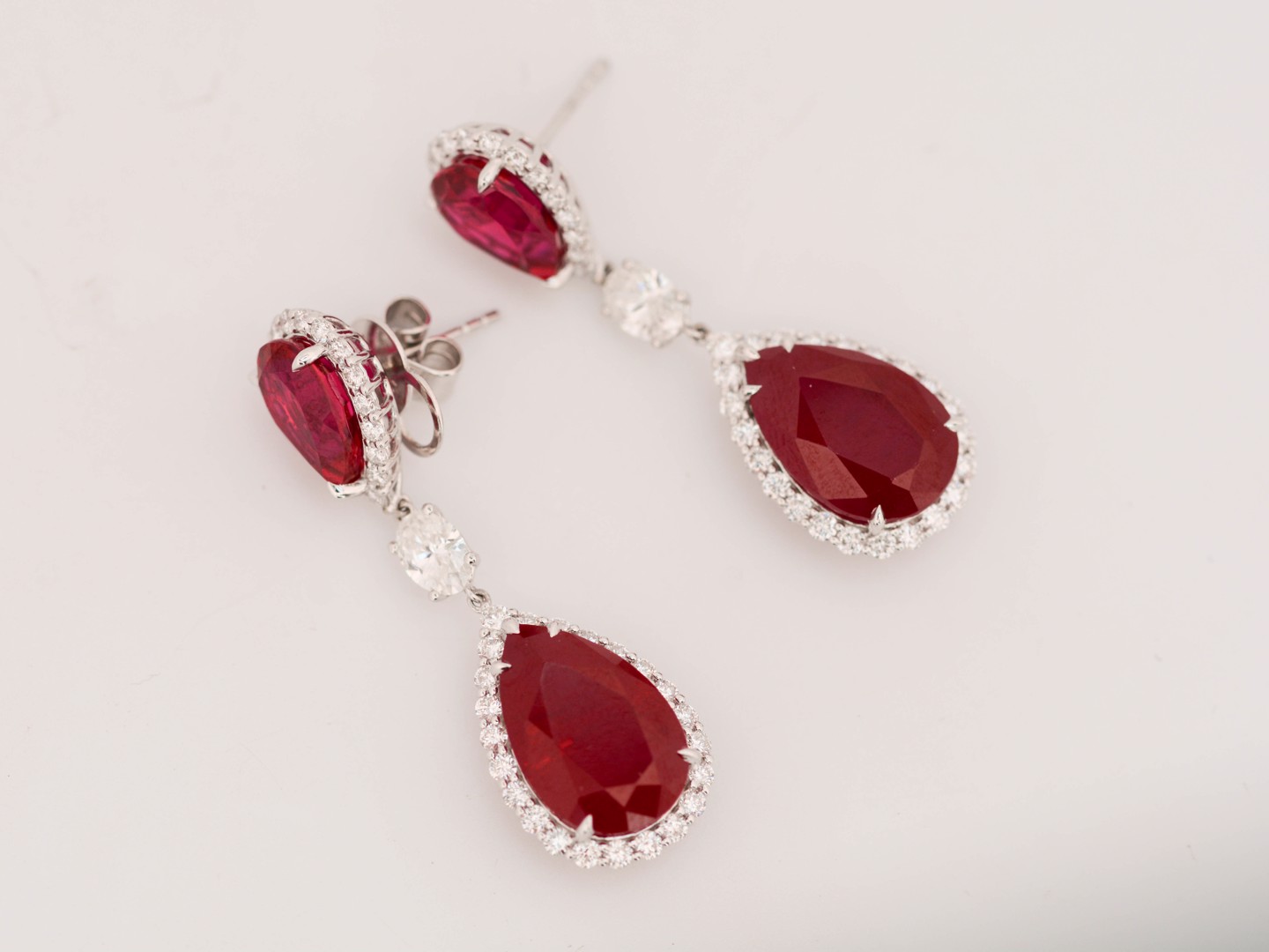 Exclusieve oorhangers in 18 karaat witgoud, bezet met vier robijnen van een levendige vivid red-kleur met een totaalgewicht van ca. 22 ct. Daarnaast twee ovaal geslepen diamanten van ca. 0,80 ct, aangevuld met 84 briljanten (samen ca. 2 ct) van uitzonderlijke kwaliteit, kleur D–F en zuiverheid VS. De oorhangers van 40 mm lengte stralen pure elegantie en tijdloze allure uit.