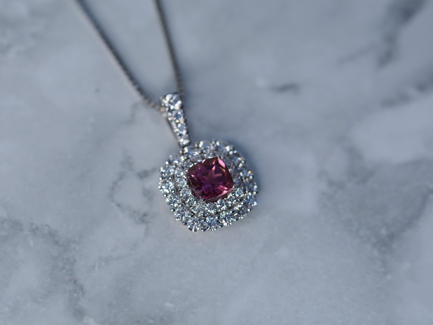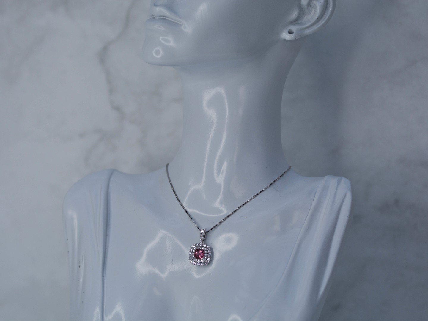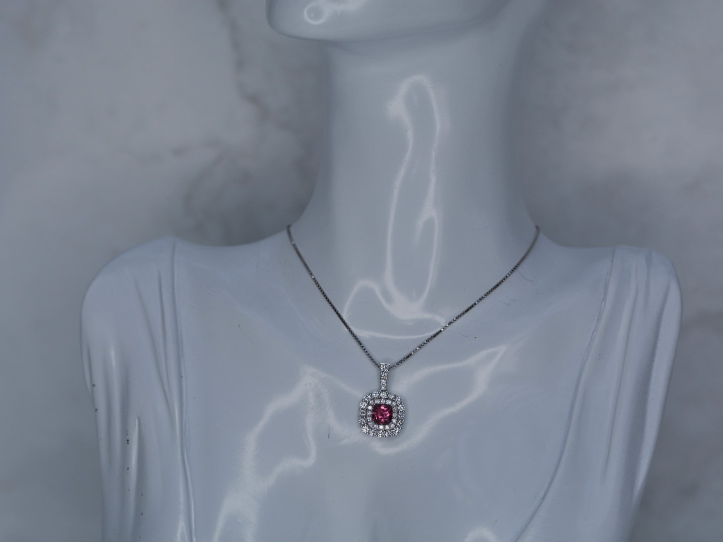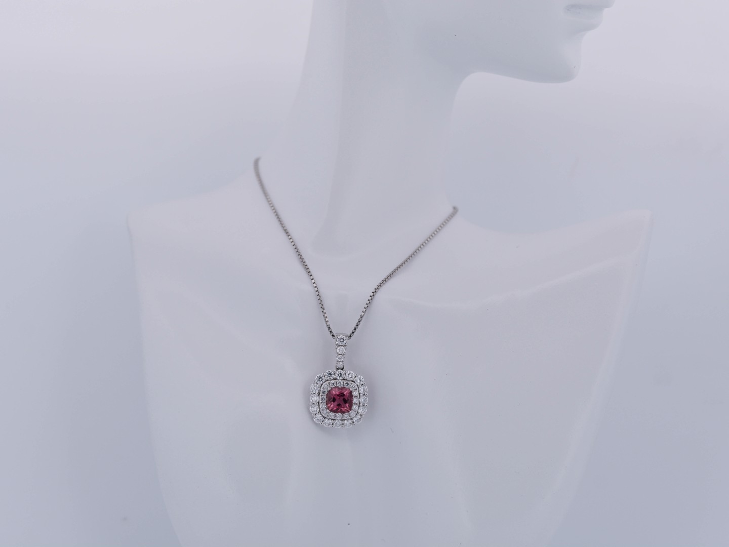 Kwaliteitsvolle hanger met bijpassende halsketting in 18 karaat witgoud (gemerkt 750), bezet met een roze toermalijn van ca. 1 ct, omringd door 38 briljanten met een gezamenlijk gewicht van ca. 1,5 ct, kleur F–G en zuiverheid VS. De ketting meet 40 cm, terwijl de hanger een lengte heeft van 20 mm. Een verfijnd juweel dat elegantie en subtiliteit uitstraalt.