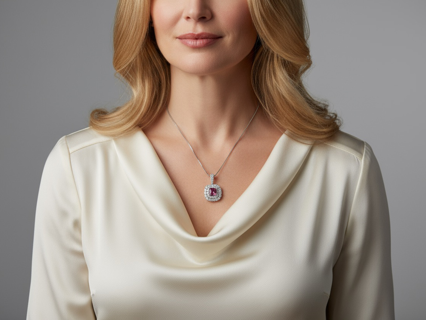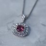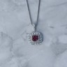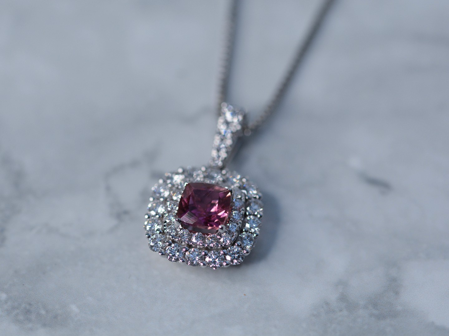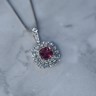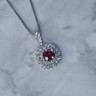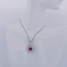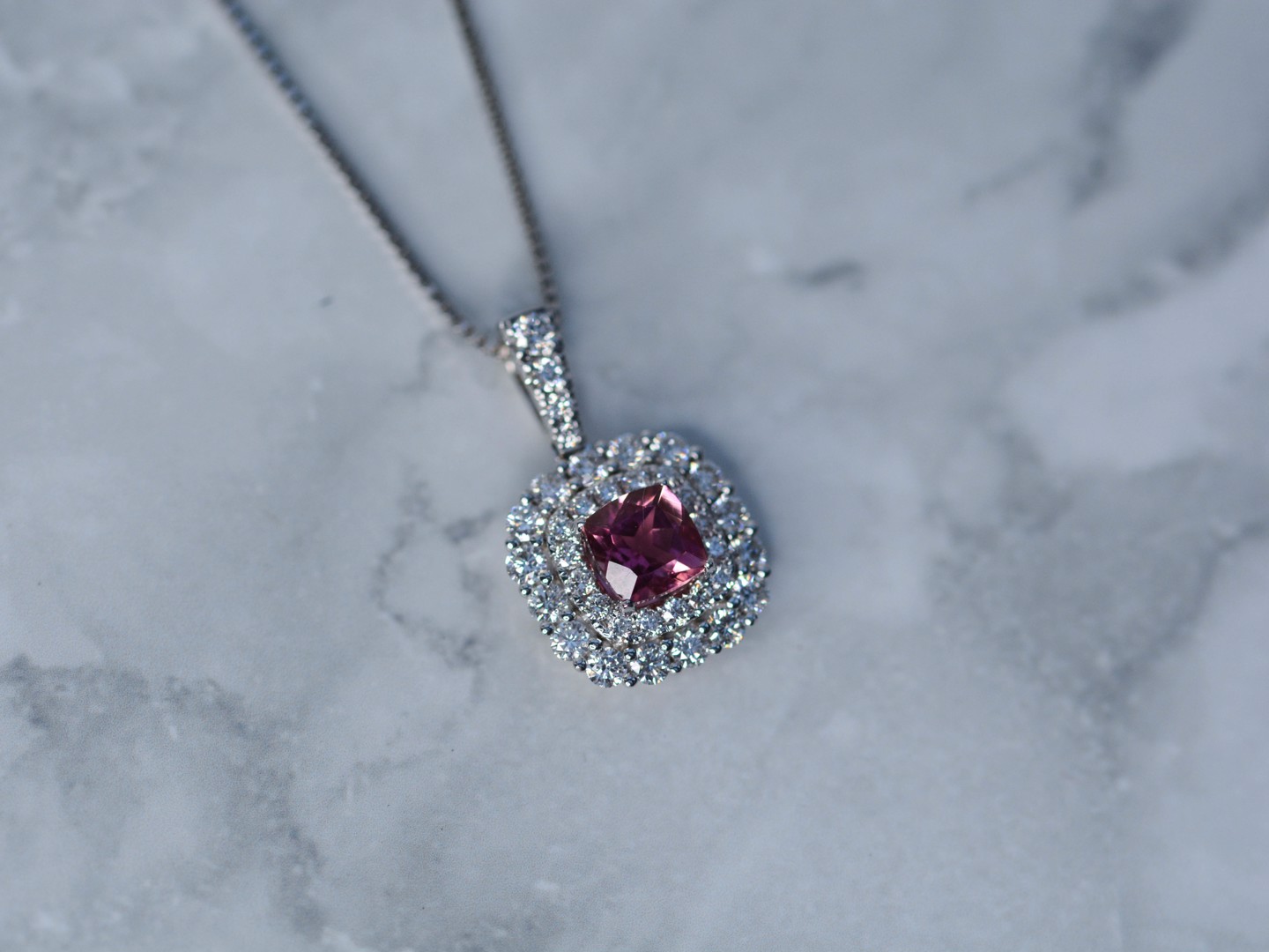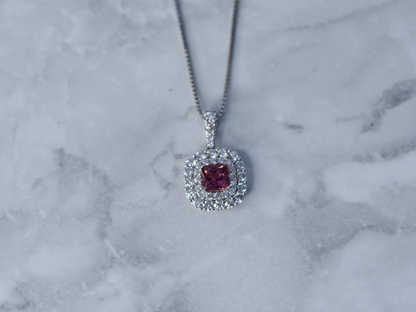 Kwaliteitsvolle hanger met bijpassende halsketting in 18 karaat witgoud (gemerkt 750), bezet met een roze toermalijn van ca. 1 ct, omringd door 38 briljanten met een gezamenlijk gewicht van ca. 1,5 ct, kleur F–G en zuiverheid VS. De ketting meet 40 cm, terwijl de hanger een lengte heeft van 20 mm. Een verfijnd juweel dat elegantie en subtiliteit uitstraalt.