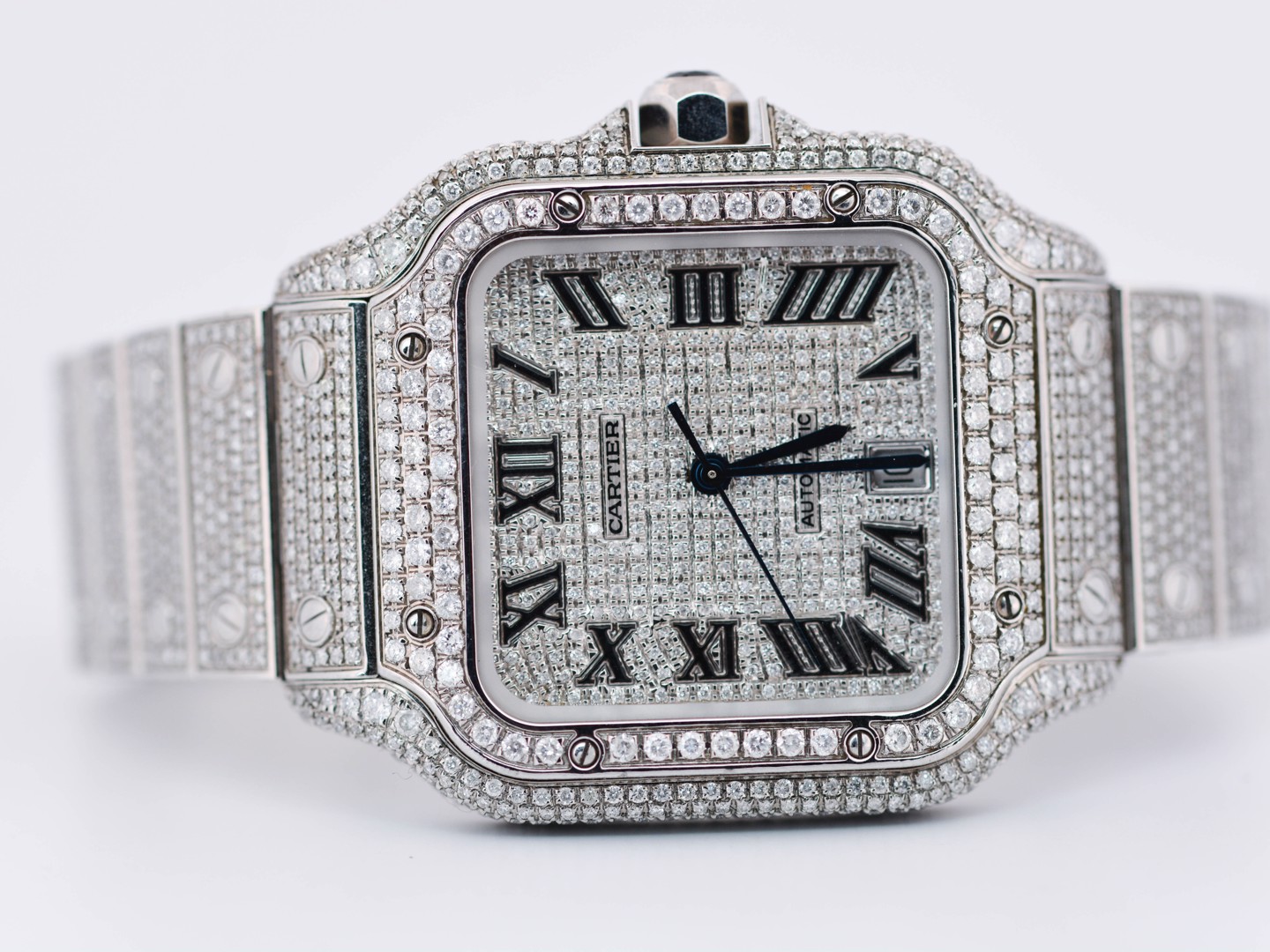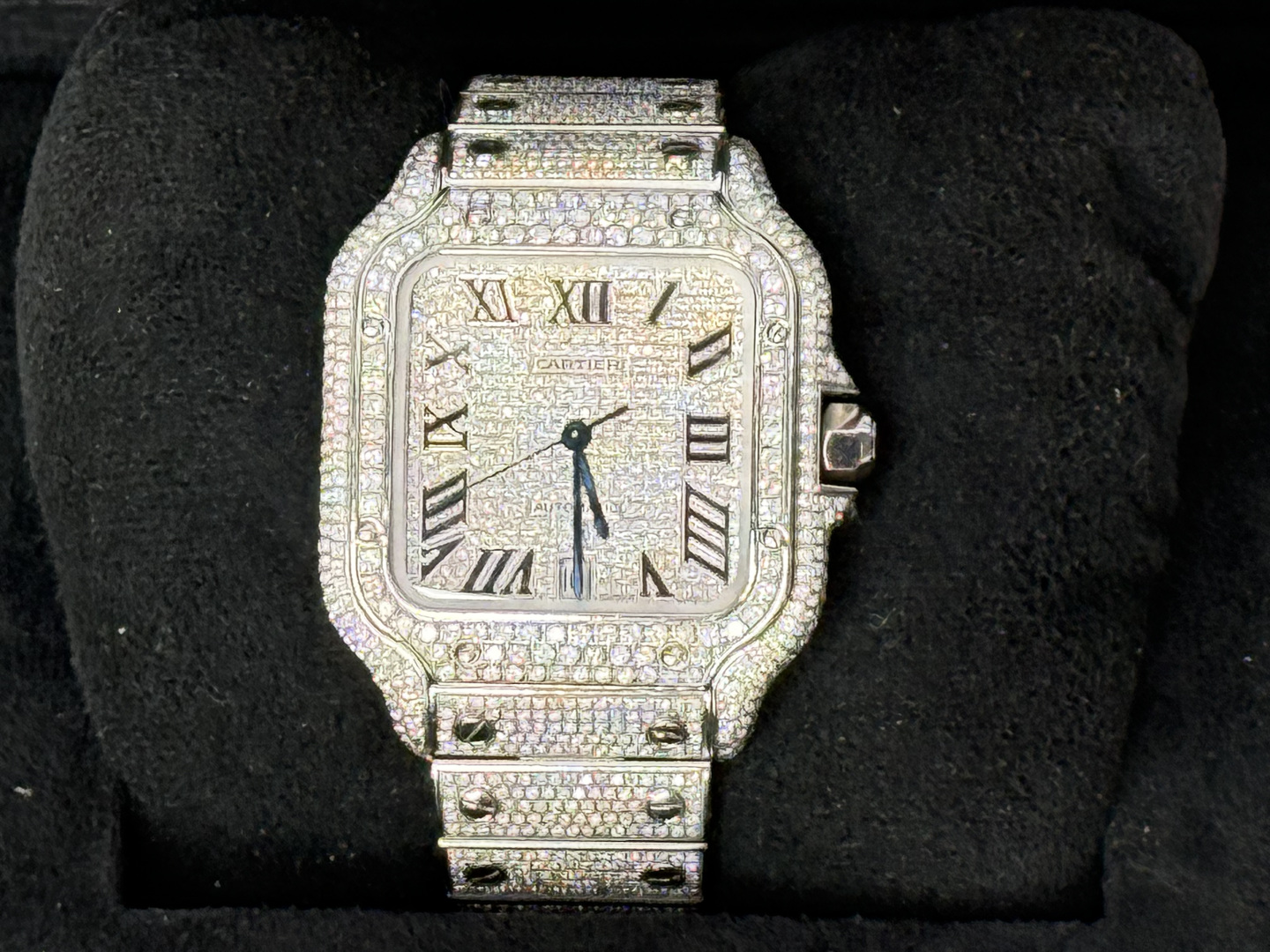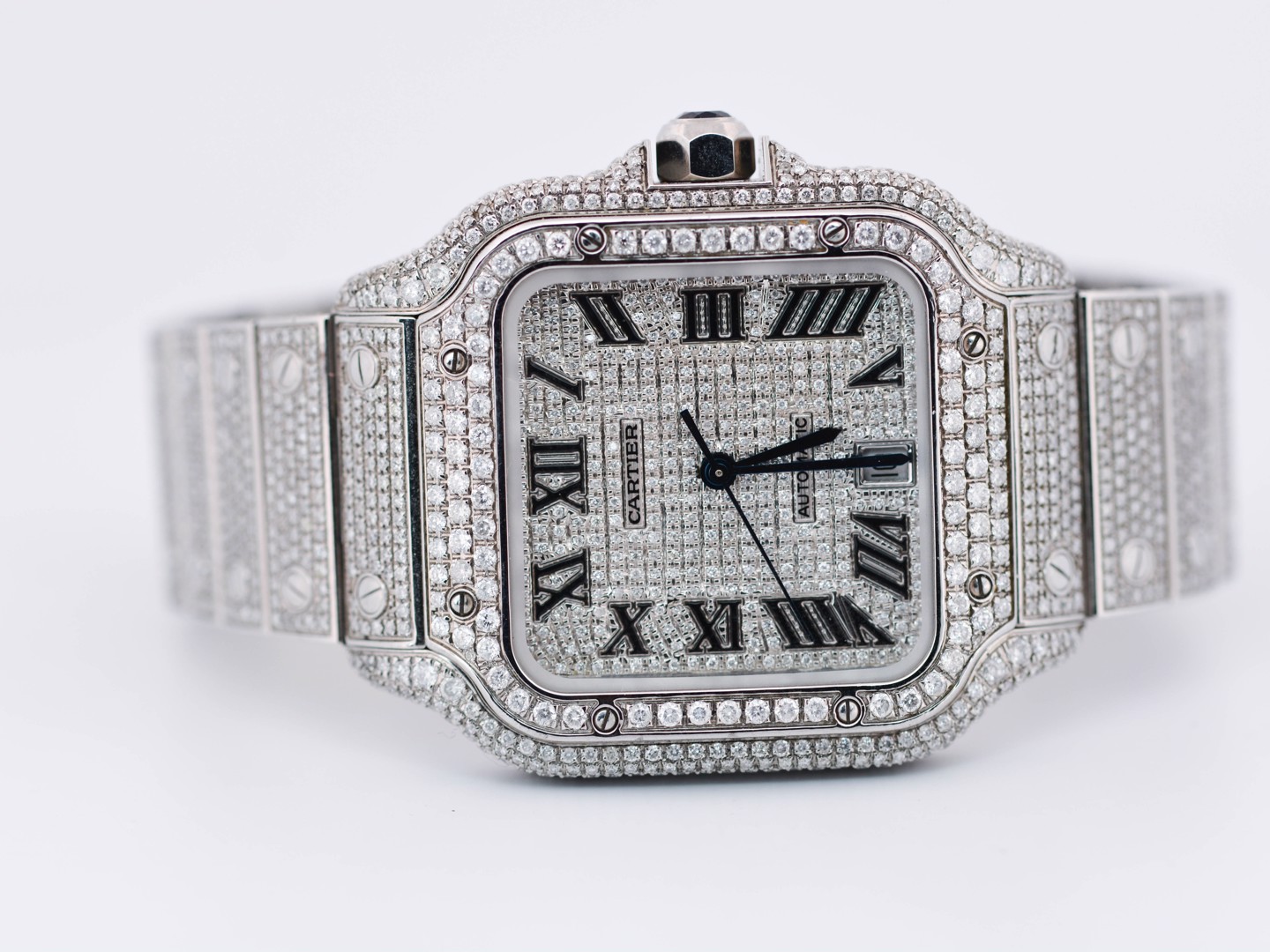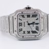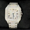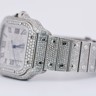 Een uitzonderlijk Cartier Santos polshorloge met automatisch uurwerk, in een royale kast van ca. 47 x 39 mm. Dit prestigieuze model is rijkelijk bezet met circa 2200 witte diamanten, met een gezamenlijk gewicht van ca. 12 ct, waardoor het een ongeëvenaarde schittering uitstraalt. Geleverd met originele doos en certificaat, inclusief het authentieke aankoopcertificaat gedateerd 23-01-2024. Een zeldzaam en luxueus uurwerk dat vakmanschap en exclusiviteit belichaamt.