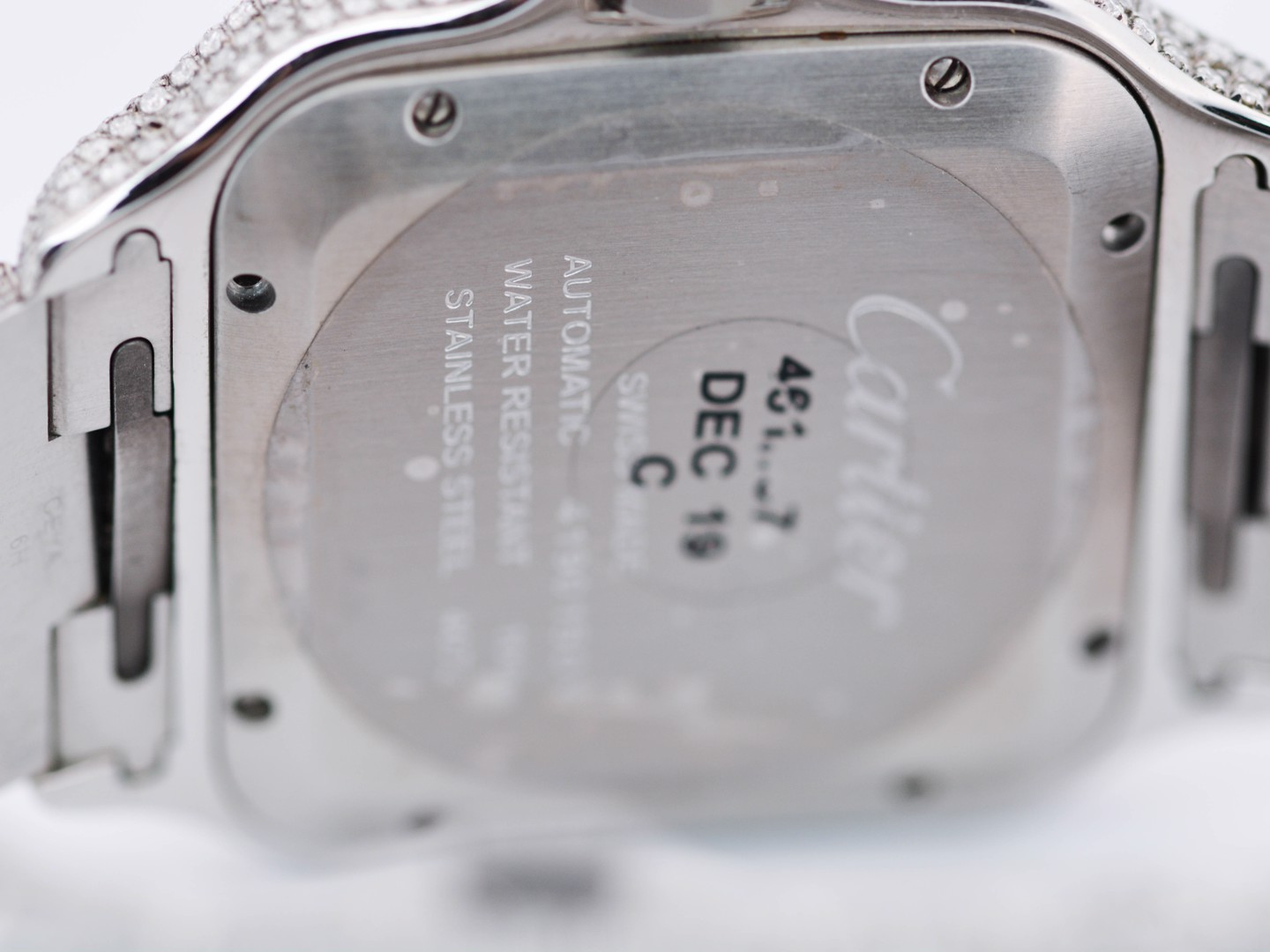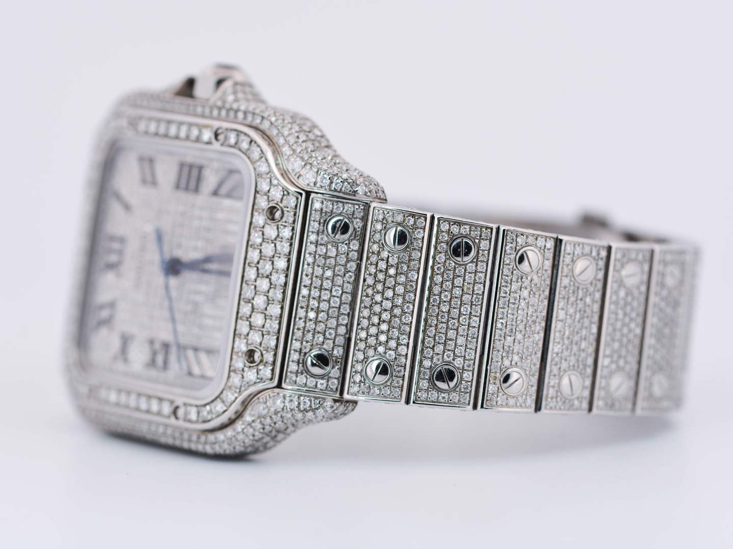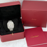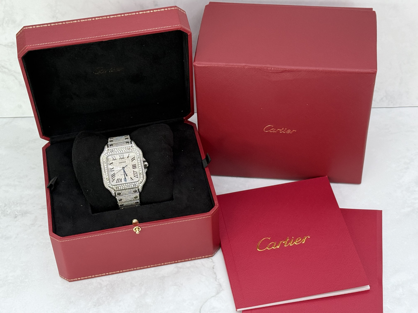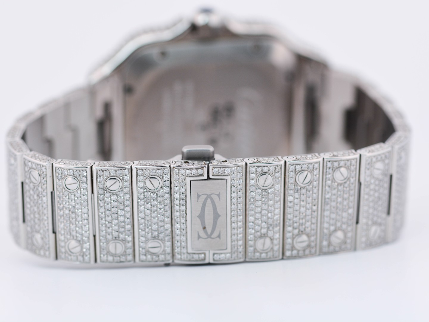 Een uitzonderlijk Cartier Santos polshorloge met automatisch uurwerk, in een royale kast van ca. 47 x 39 mm. Dit prestigieuze model is rijkelijk bezet met circa 2200 witte diamanten, met een gezamenlijk gewicht van ca. 12 ct, waardoor het een ongeëvenaarde schittering uitstraalt. Geleverd met originele doos en certificaat, inclusief het authentieke aankoopcertificaat gedateerd 23-01-2024. Een zeldzaam en luxueus uurwerk dat vakmanschap en exclusiviteit belichaamt.