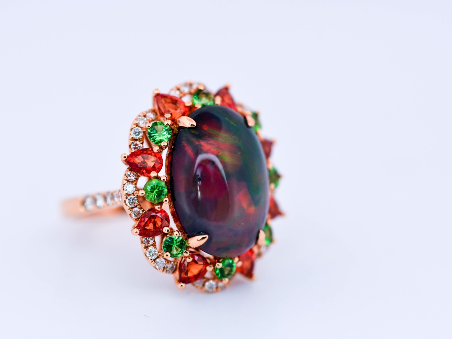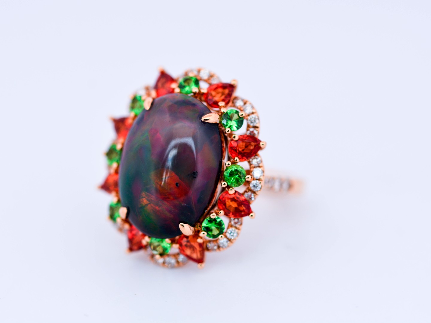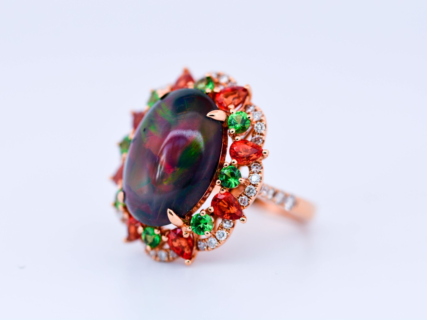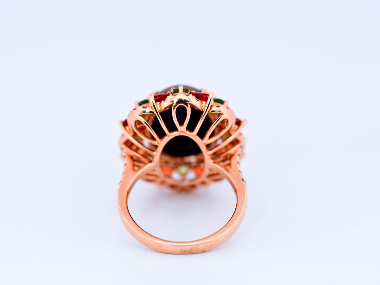 Een grote en opvallende ring in 18 karaat rosegoud (gemerkt 750), gezet met een licht groen-blauw opaal van ca. 5 ct. De centrale steen wordt omringd door acht roze saffieren (samen ca. 2 ct) en acht smaragden (ca. 0,80 ct), verder verrijkt met 42 briljanten (ca. 0,80 ct) van uitzonderlijke kwaliteit, kleur F–G en zuiverheid VS. Met een ringmaat 50–53 en een afmeting van ca. 24 x 20 mm is dit een expressief juweel dat kleur en elegantie harmonieus samenbrengt.