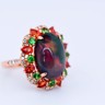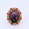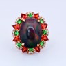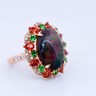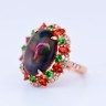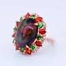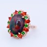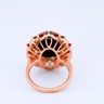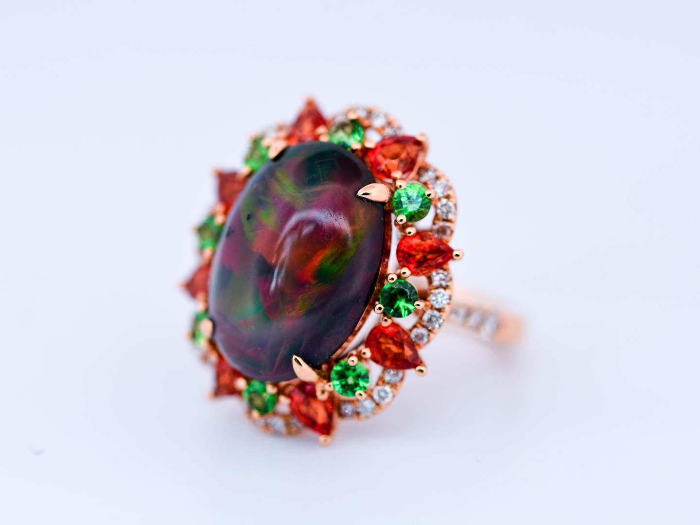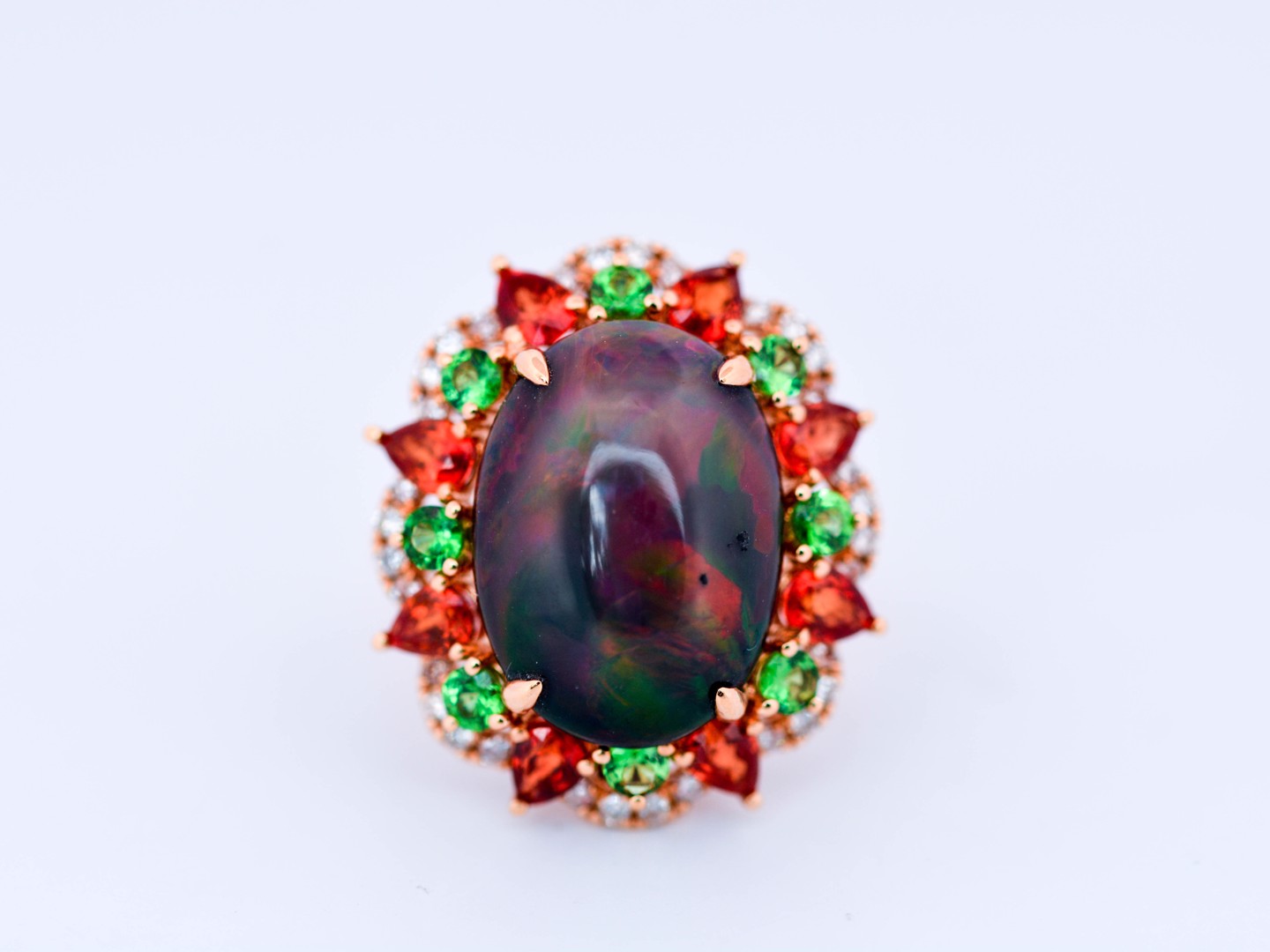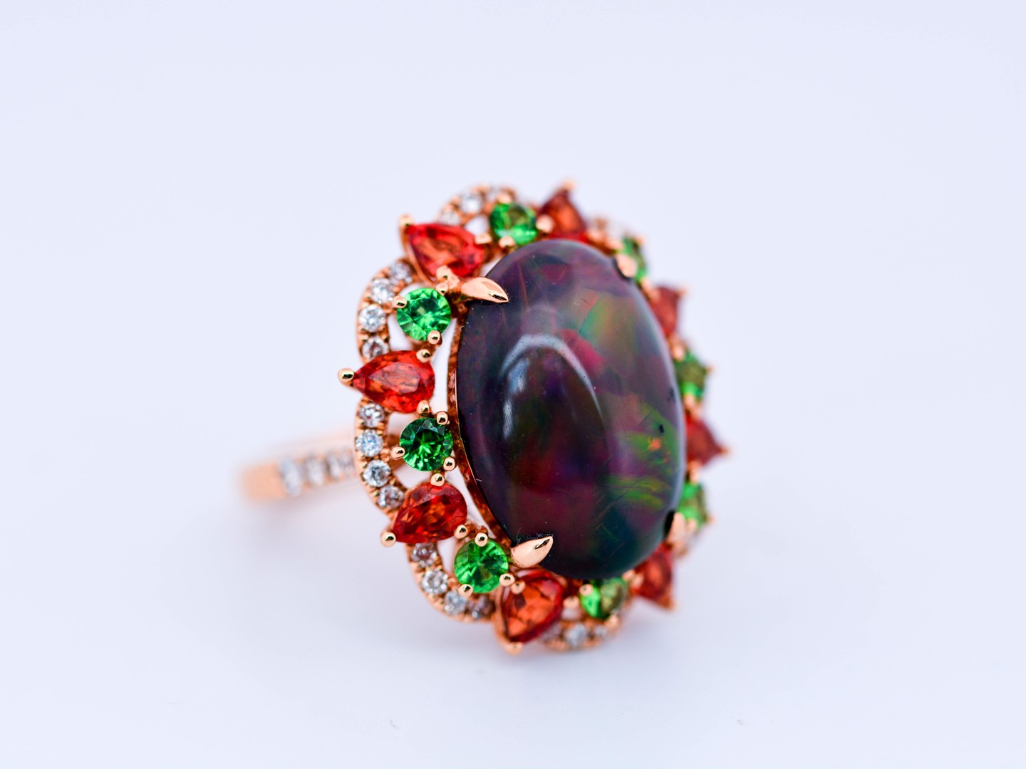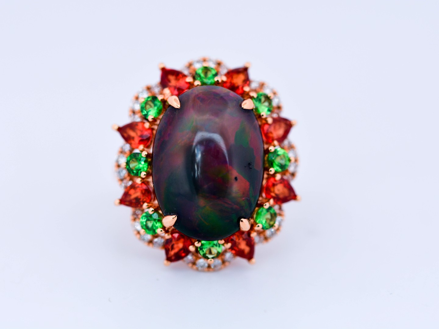 Een grote en opvallende ring in 18 karaat rosegoud (gemerkt 750), gezet met een licht groen-blauw opaal van ca. 5 ct. De centrale steen wordt omringd door acht roze saffieren (samen ca. 2 ct) en acht smaragden (ca. 0,80 ct), verder verrijkt met 42 briljanten (ca. 0,80 ct) van uitzonderlijke kwaliteit, kleur F–G en zuiverheid VS. Met een ringmaat 50–53 en een afmeting van ca. 24 x 20 mm is dit een expressief juweel dat kleur en elegantie harmonieus samenbrengt.
