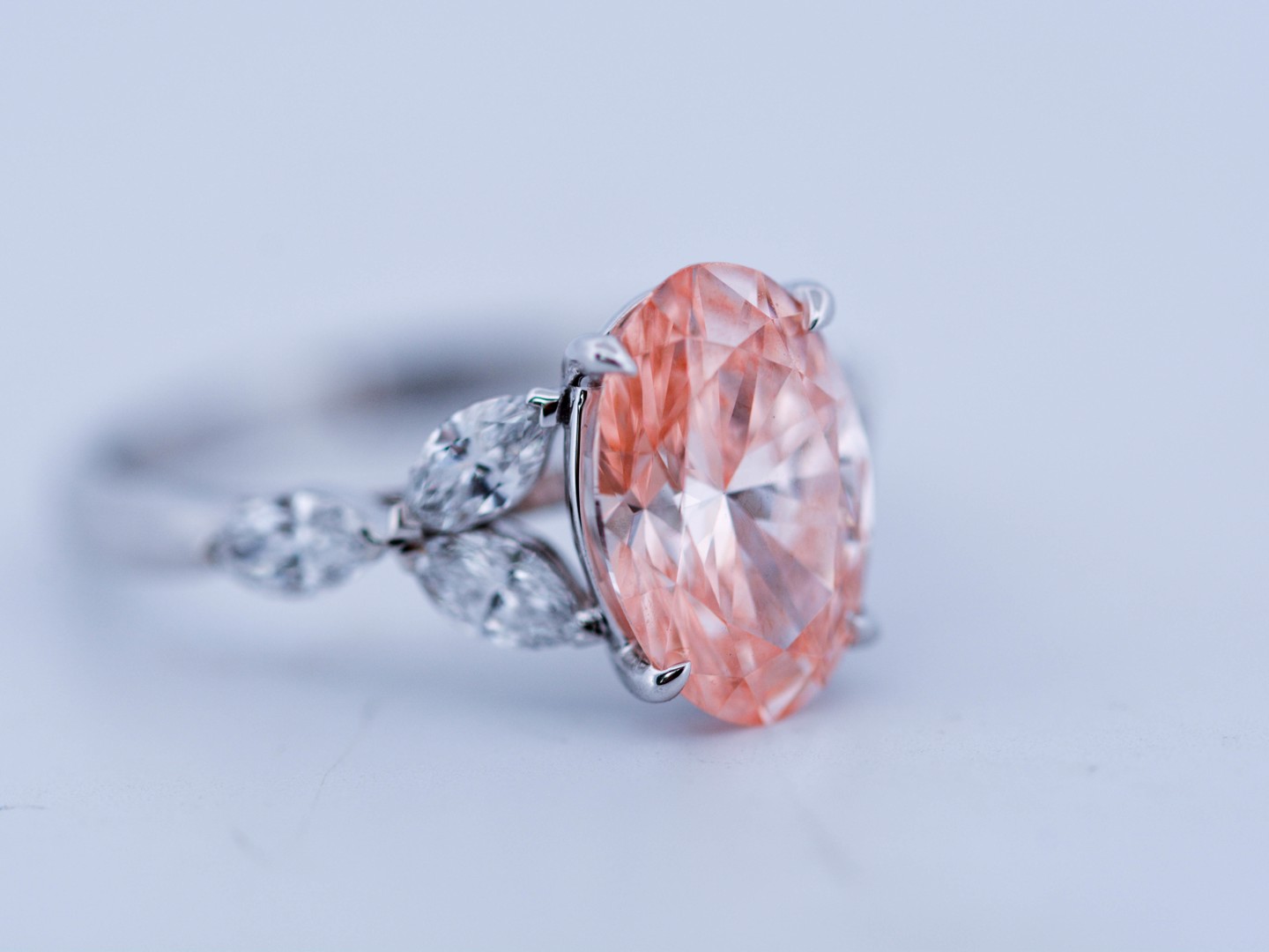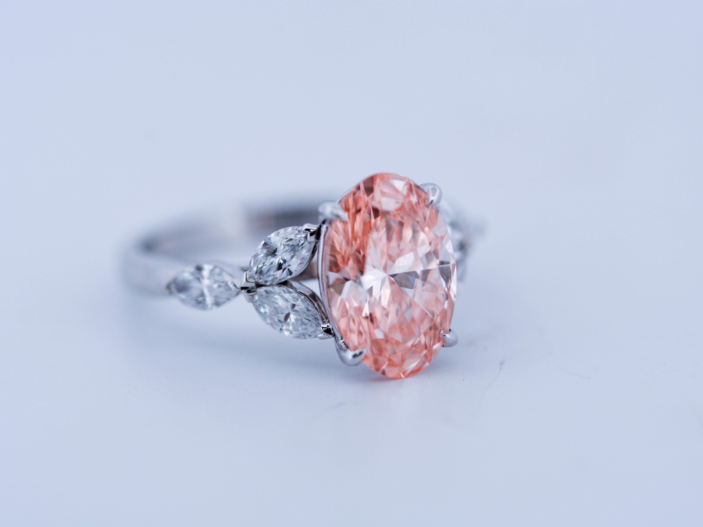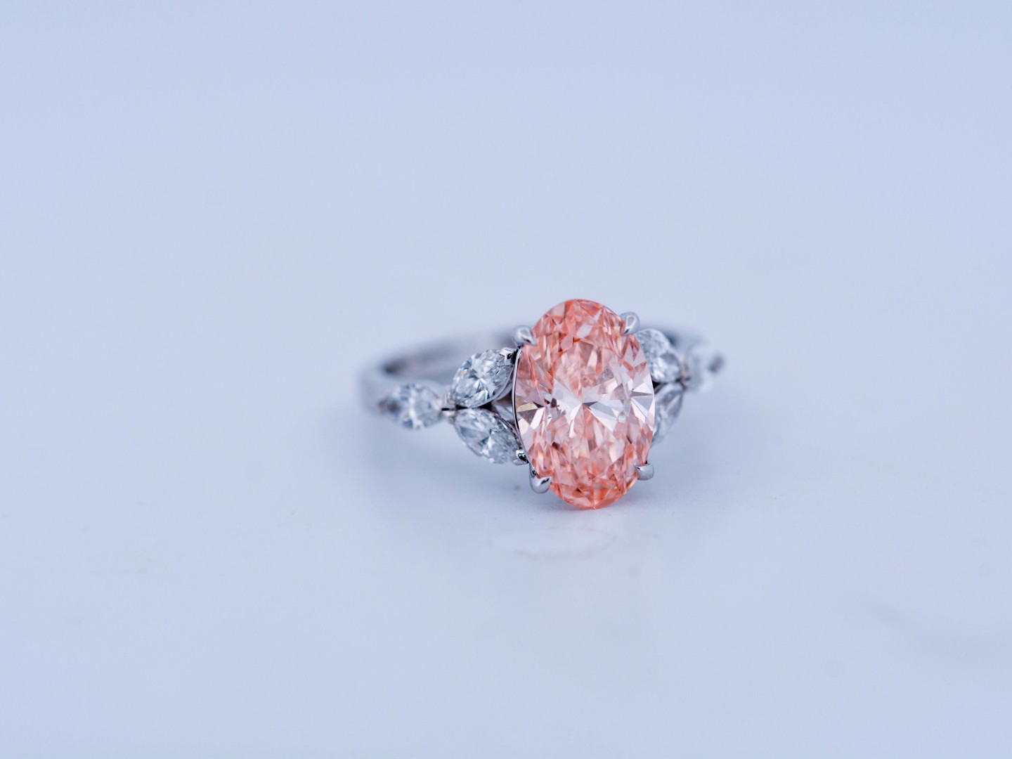 Exclusieve ring in 18 karaat witgoud (gemerkt 750), centraal gezet met een peer geslepen roze diamant van ca. 3 ct (treated color), zuiverheid VS. De centrale steen wordt omlijst door zes marquise geslepen diamanten van uitstekende kwaliteit, kleur D–F en zuiverheid VS. Met ringmaat 51–54 is dit een bijzonder en luxueus juweel dat elegantie en zeldzaamheid verenigt.