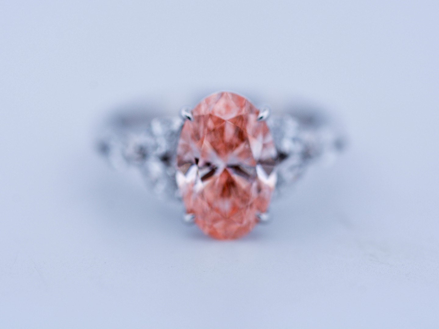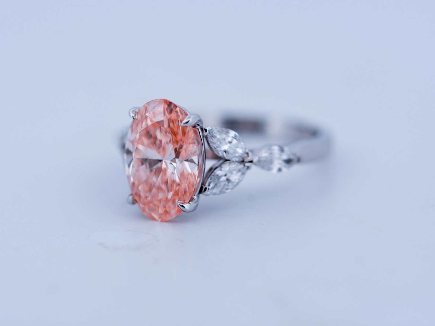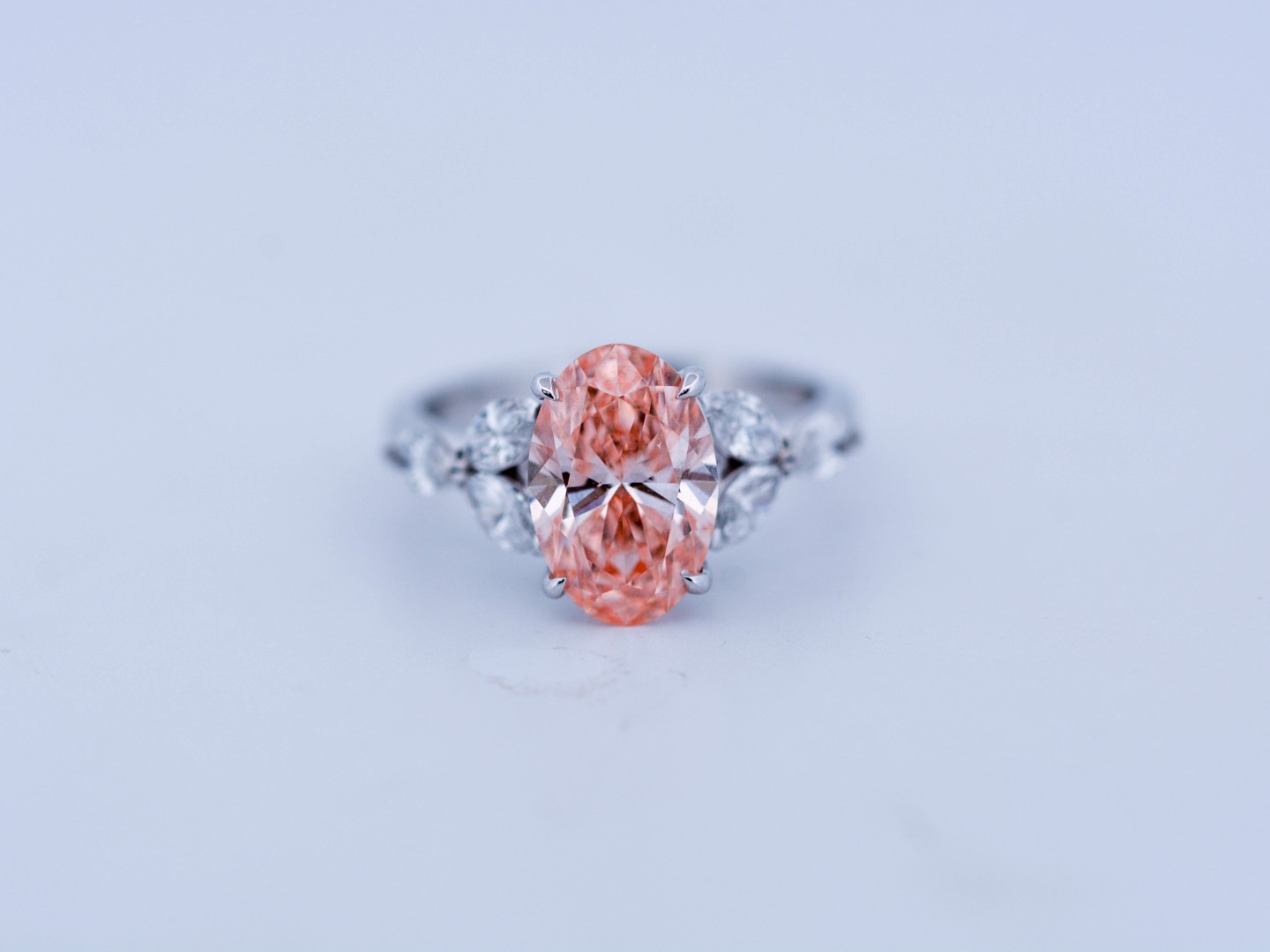 Exclusieve ring in 18 karaat witgoud (gemerkt 750), centraal gezet met een peer geslepen roze diamant van ca. 3 ct (treated color), zuiverheid VS. De centrale steen wordt omlijst door zes marquise geslepen diamanten van uitstekende kwaliteit, kleur D–F en zuiverheid VS. Met ringmaat 51–54 is dit een bijzonder en luxueus juweel dat elegantie en zeldzaamheid verenigt.