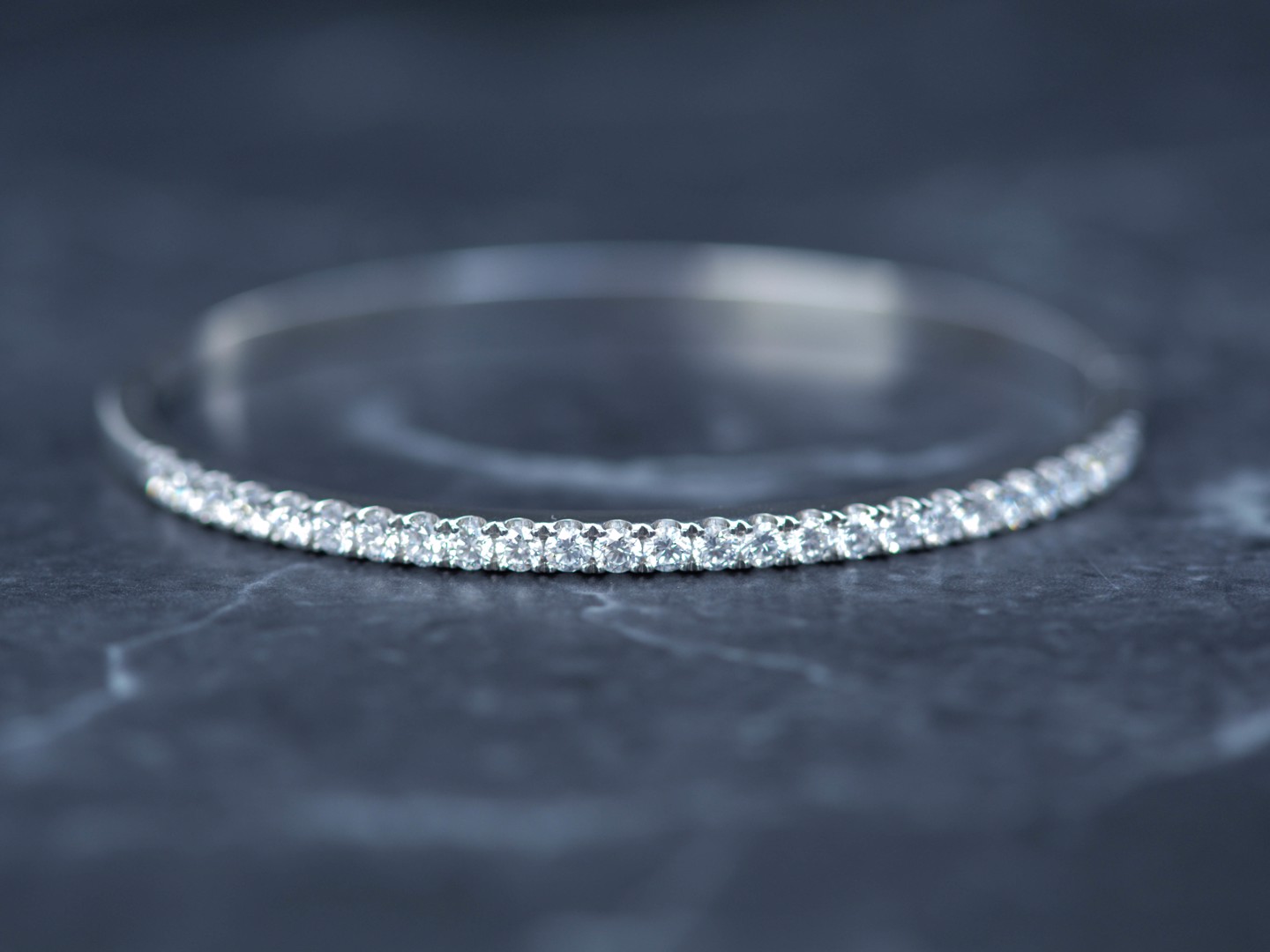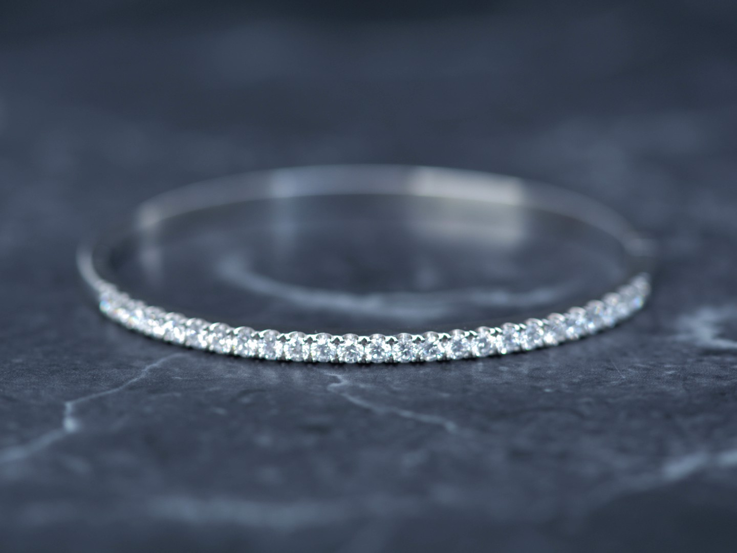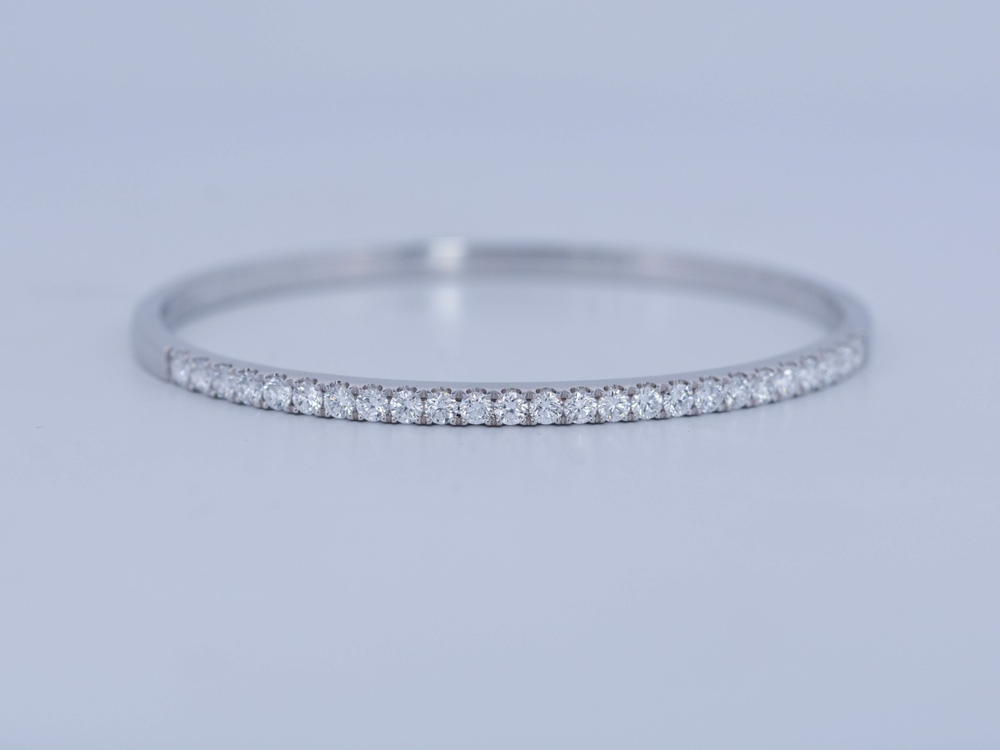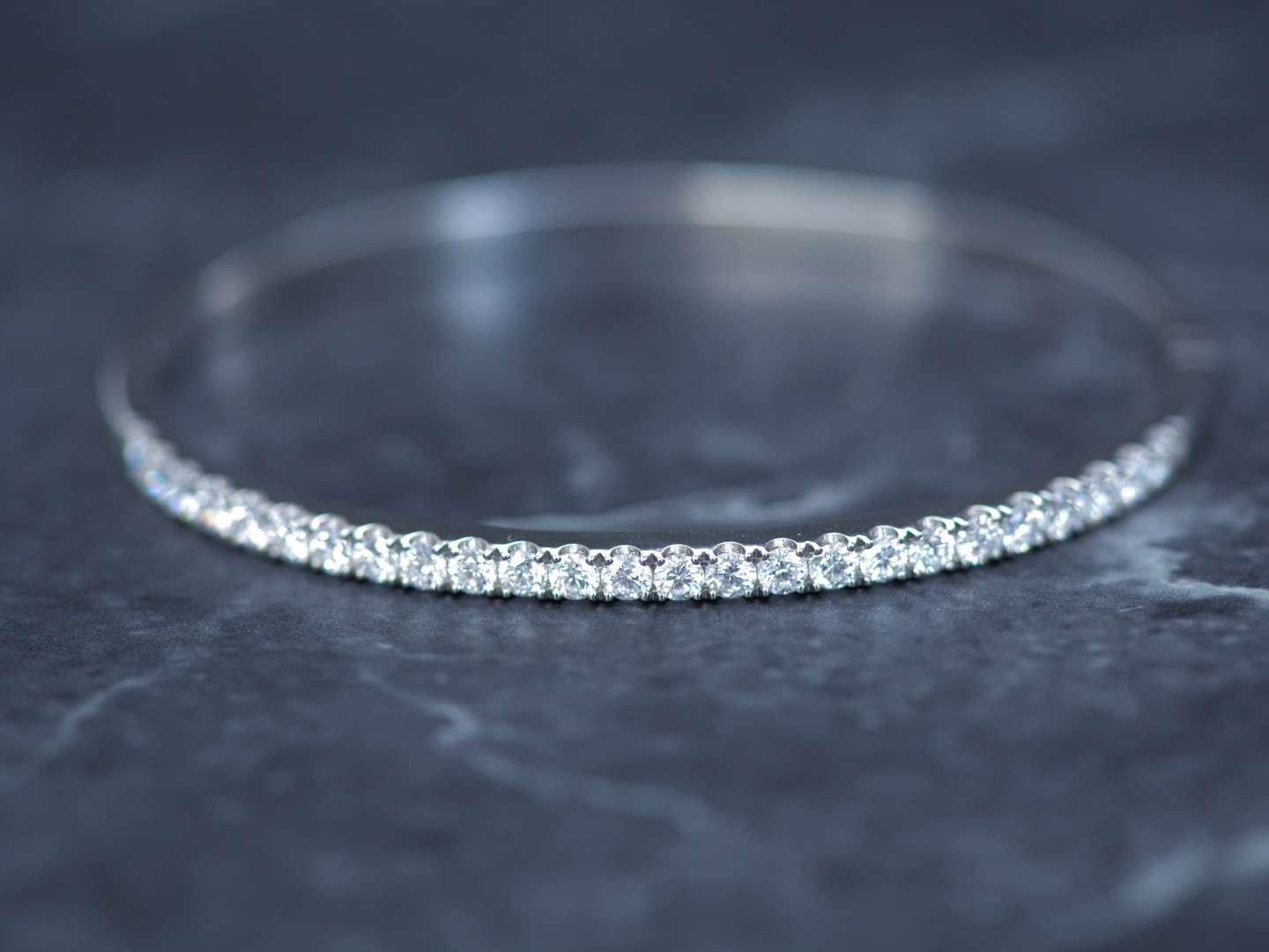 Elegante slavenarmband in 18 karaat witgoud, bezet met 25 briljantgeslepen diamanten met een gezamenlijk gewicht van ca. 2,5 ct, kleur D–F en uitzonderlijke zuiverheid VVS. De armband heeft een binnenmaat van ca. 60 x 50 mm, wat overeenkomt met een normale pasvorm. Een klassiek en luxueus sieraad dat verfijning en schittering verenigt.