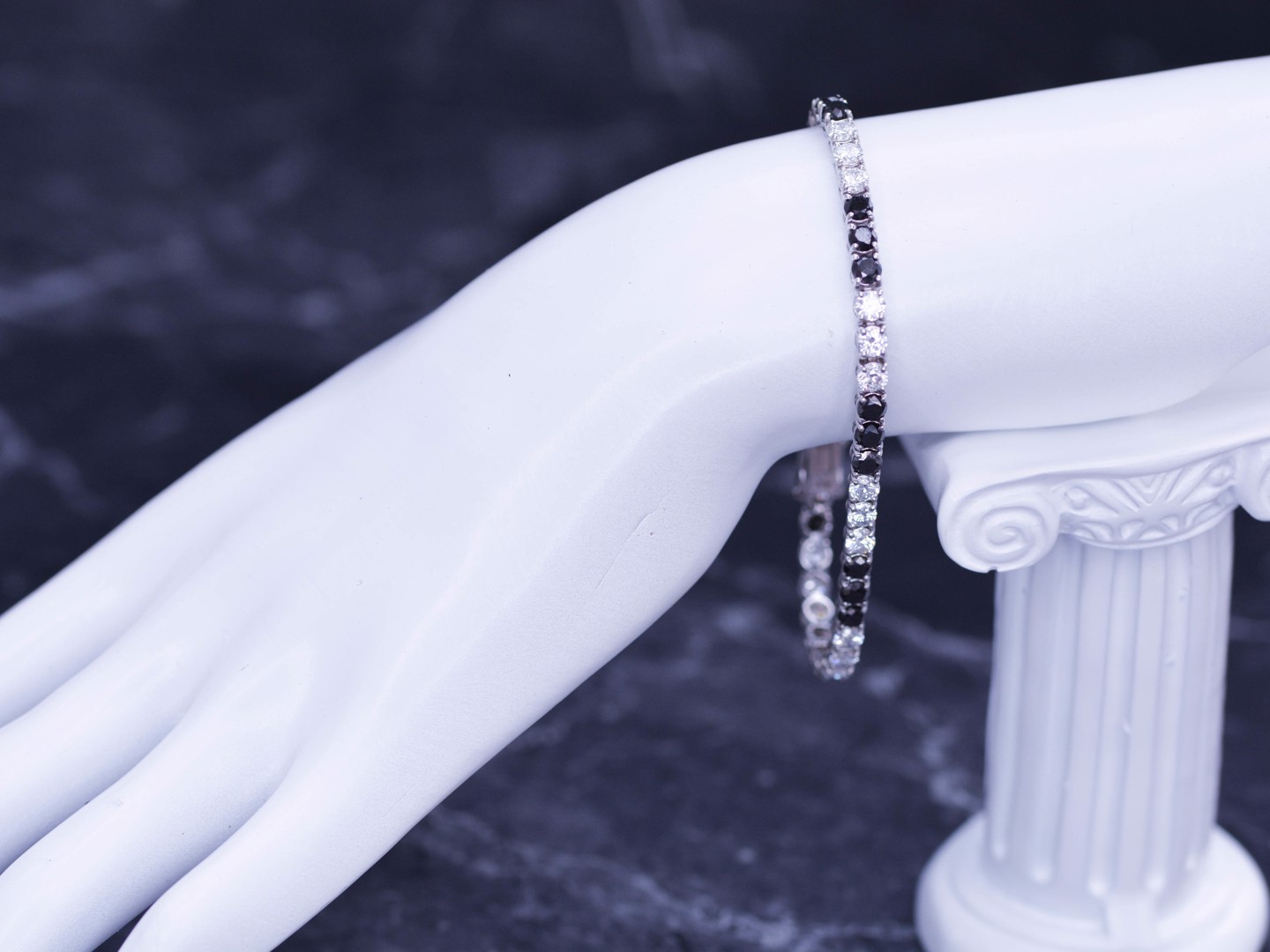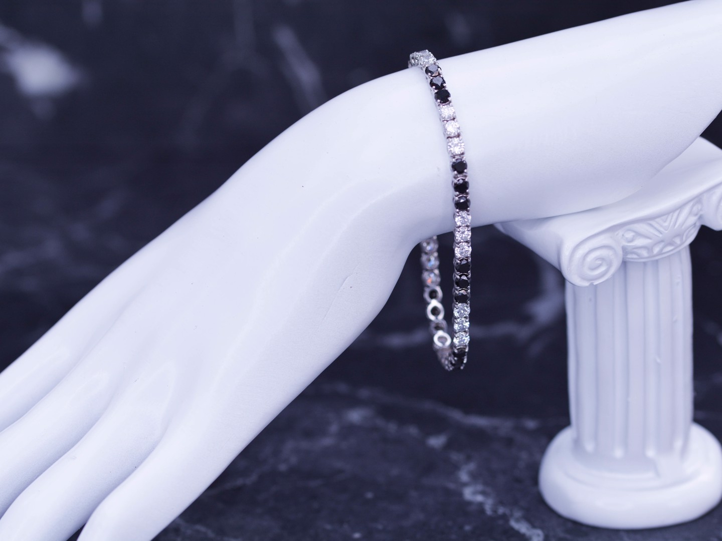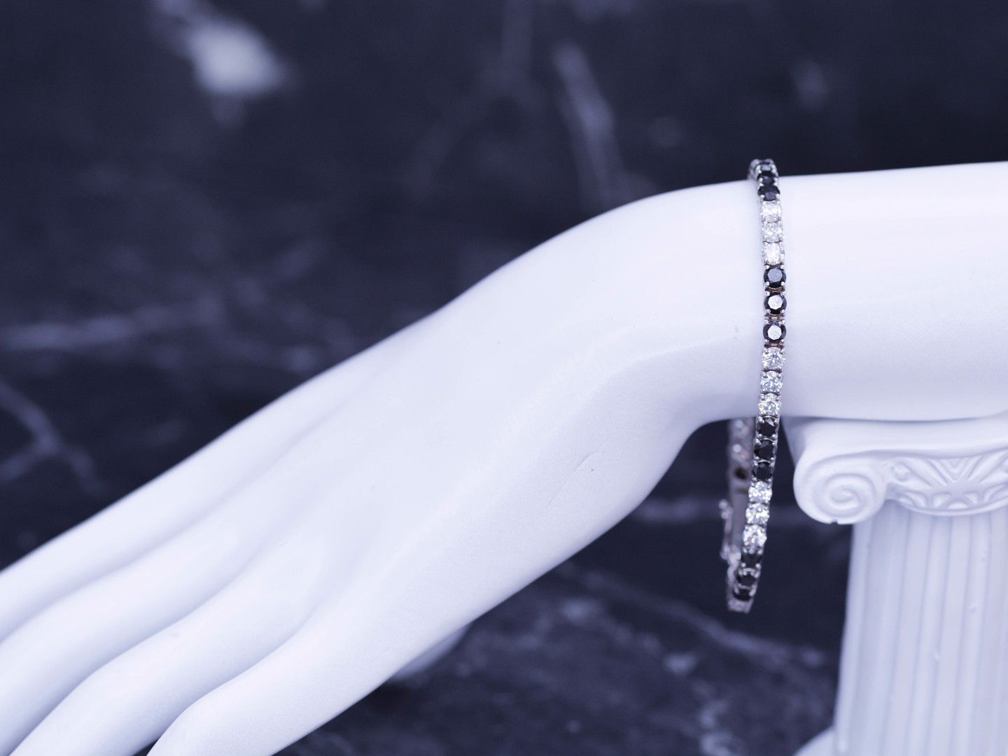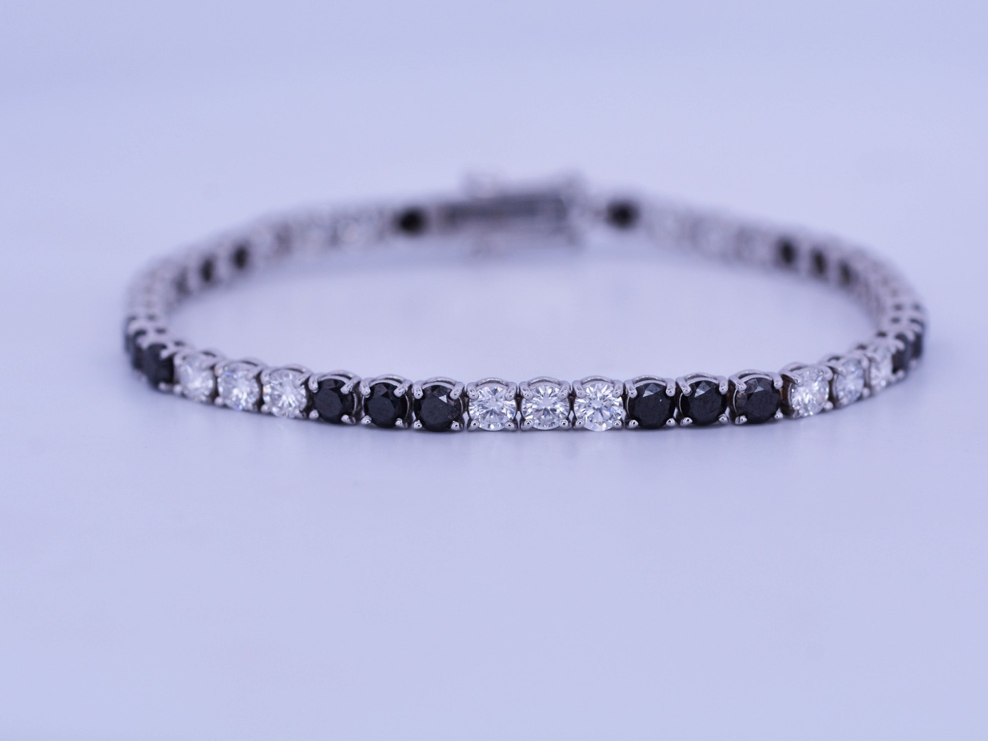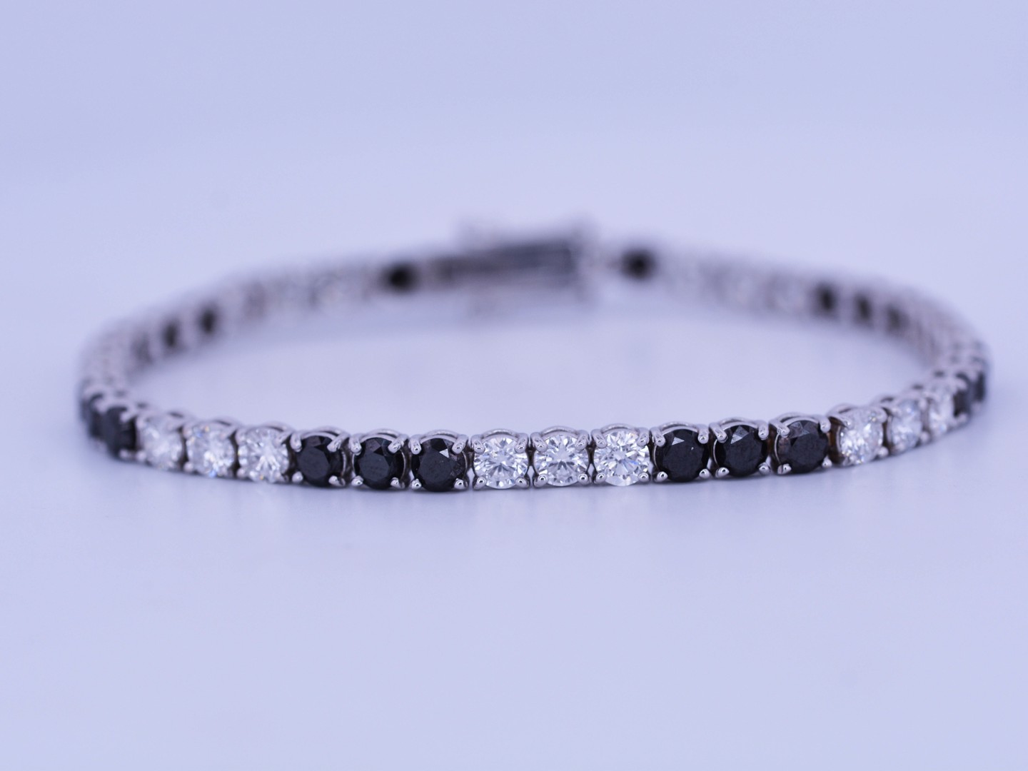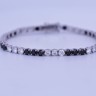 Stijlvolle rivièrenarmband in 18 karaat witgoud (gemerkt 750), bezet met 22 zwarte diamanten van ca. 5 ct in totaal en 22 witte diamanten van ca. 5 ct in totaal, kleur E–F en zuiverheid VVS. Met een lengte van 19 cm straalt dit juweel een uniek samenspel van contrast en elegantie uit, ideaal voor wie houdt van exclusieve verfijning.