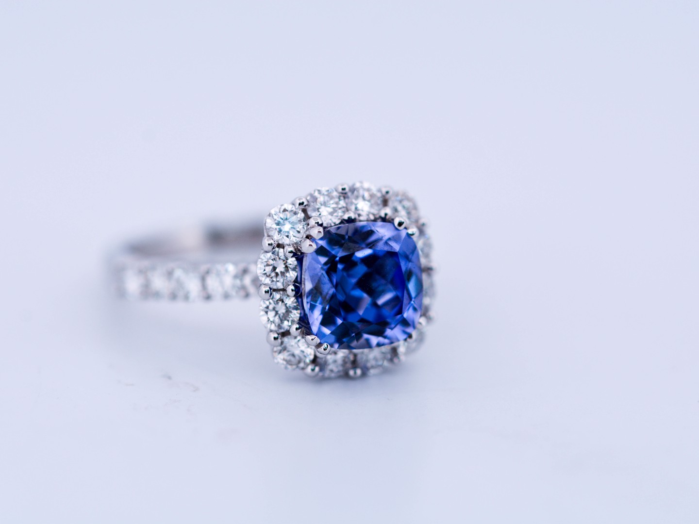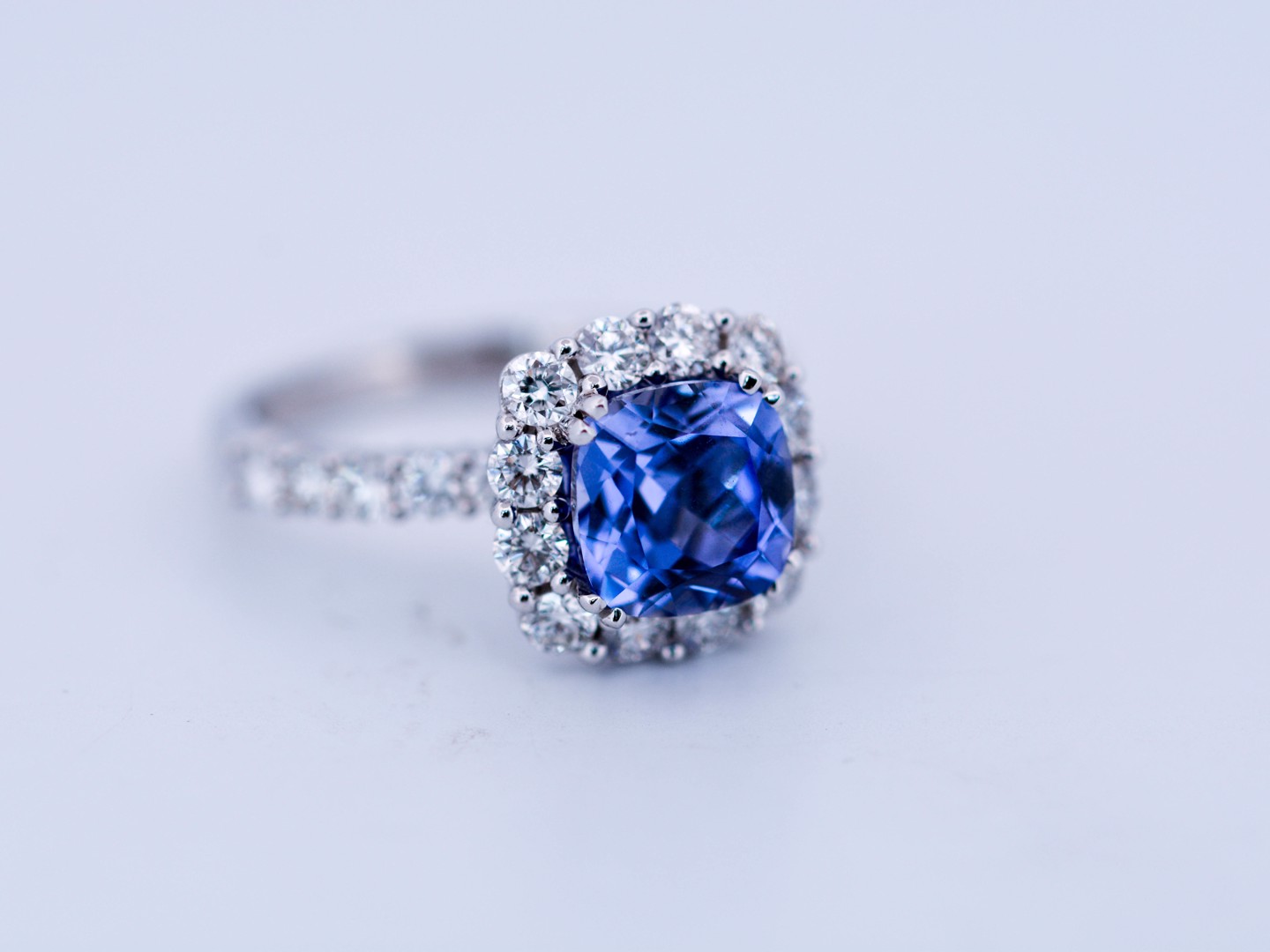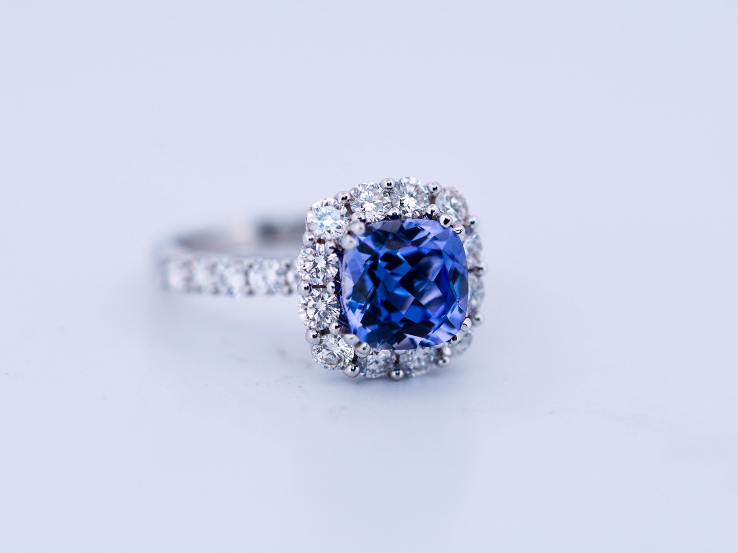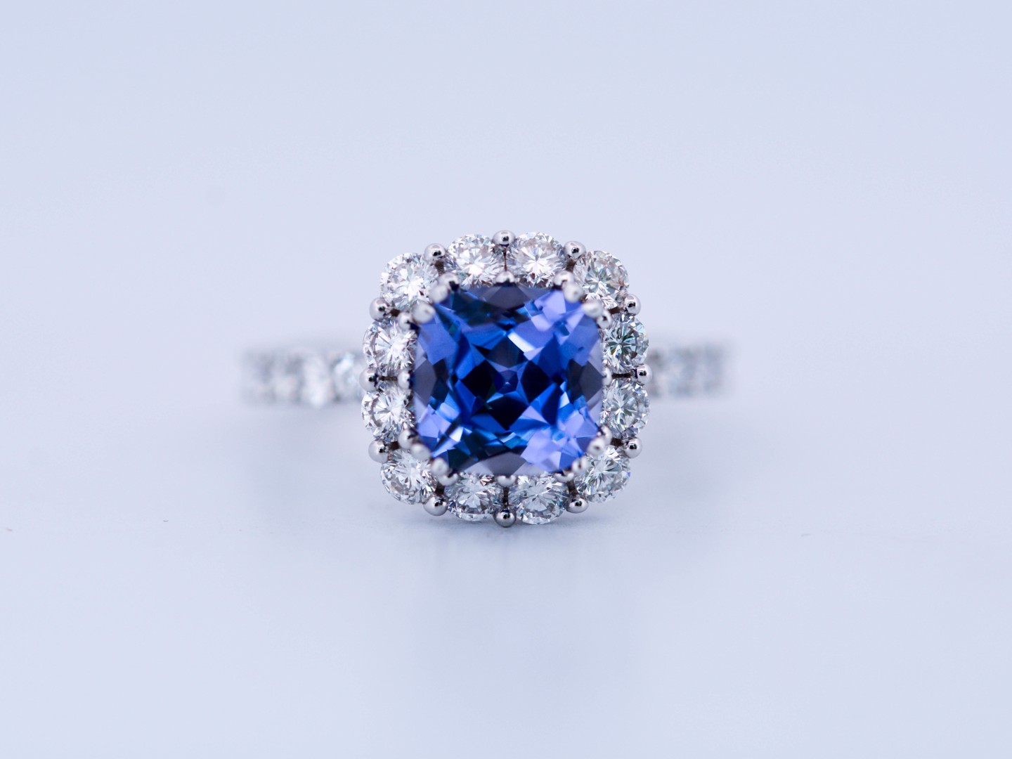 Ring in witgoud (750), bezet met een tanzaniet van ca. 3,00 ct, omringd door 22 briljantgeslepen diamanten met een gezamenlijk gewicht van ca. 1,70 ct, kleur D–F (exceptional white), zuiverheid VS. Ringmaat: 52–54. Afmetingen: ca. 12 × 12 mm.