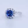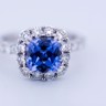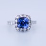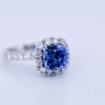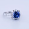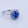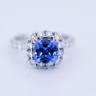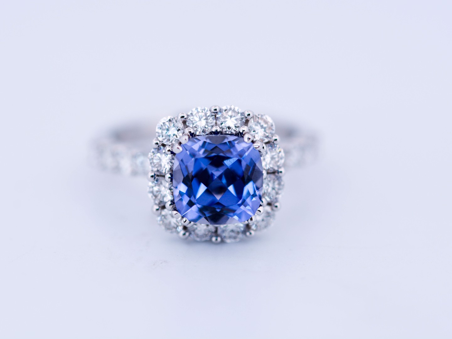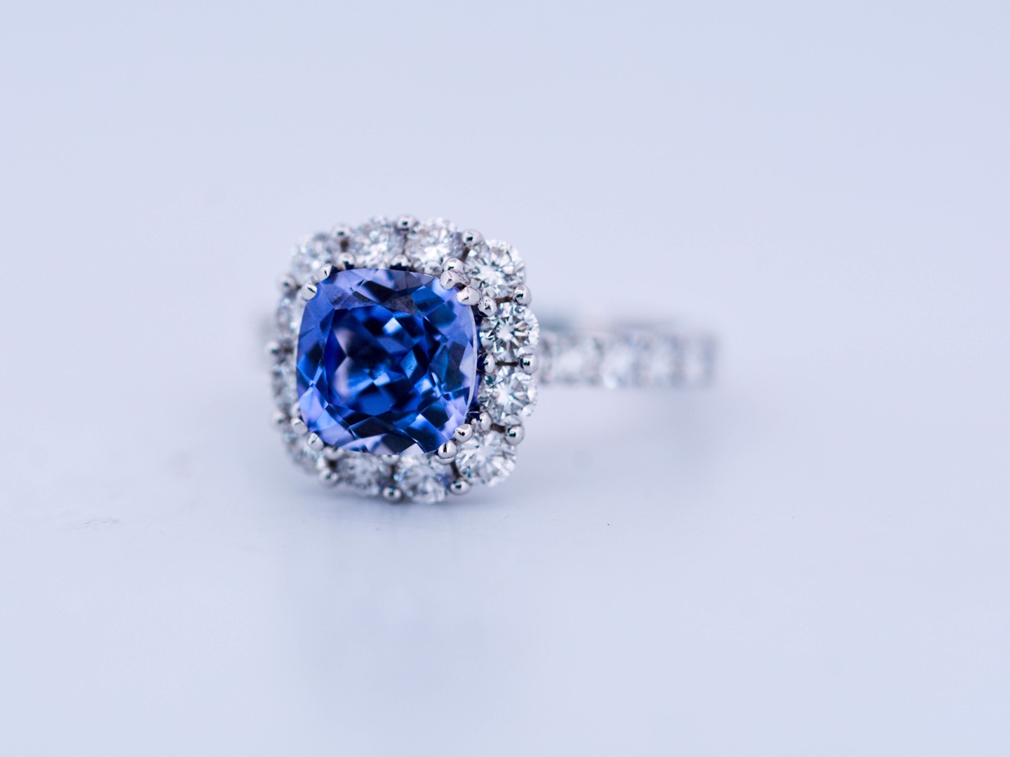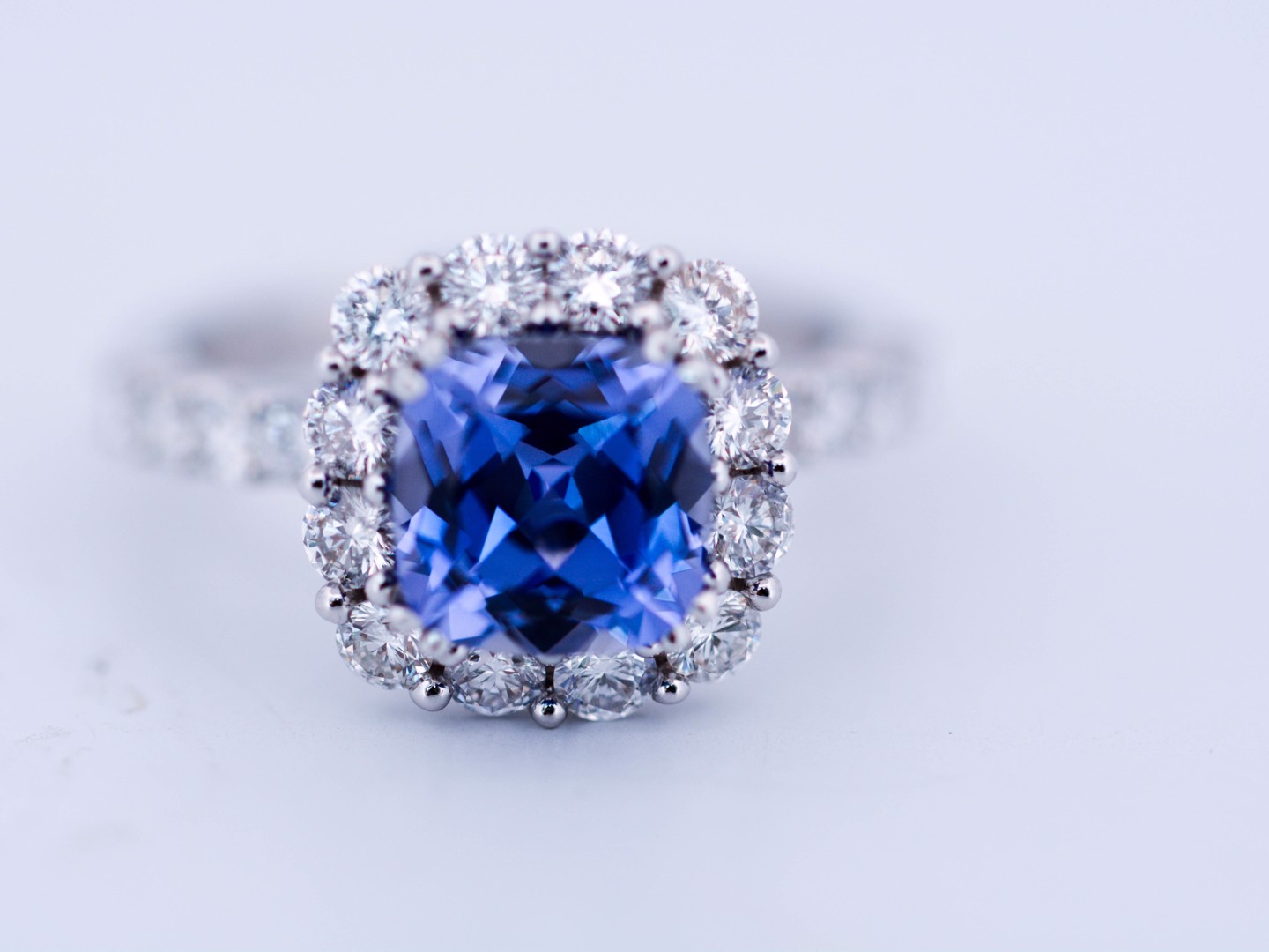 Ring in witgoud (750), bezet met een tanzaniet van ca. 3,00 ct, omringd door 22 briljantgeslepen diamanten met een gezamenlijk gewicht van ca. 1,70 ct, kleur D–F (exceptional white), zuiverheid VS. Ringmaat: 52–54. Afmetingen: ca. 12 × 12 mm.