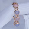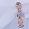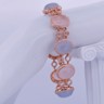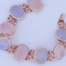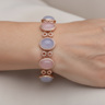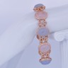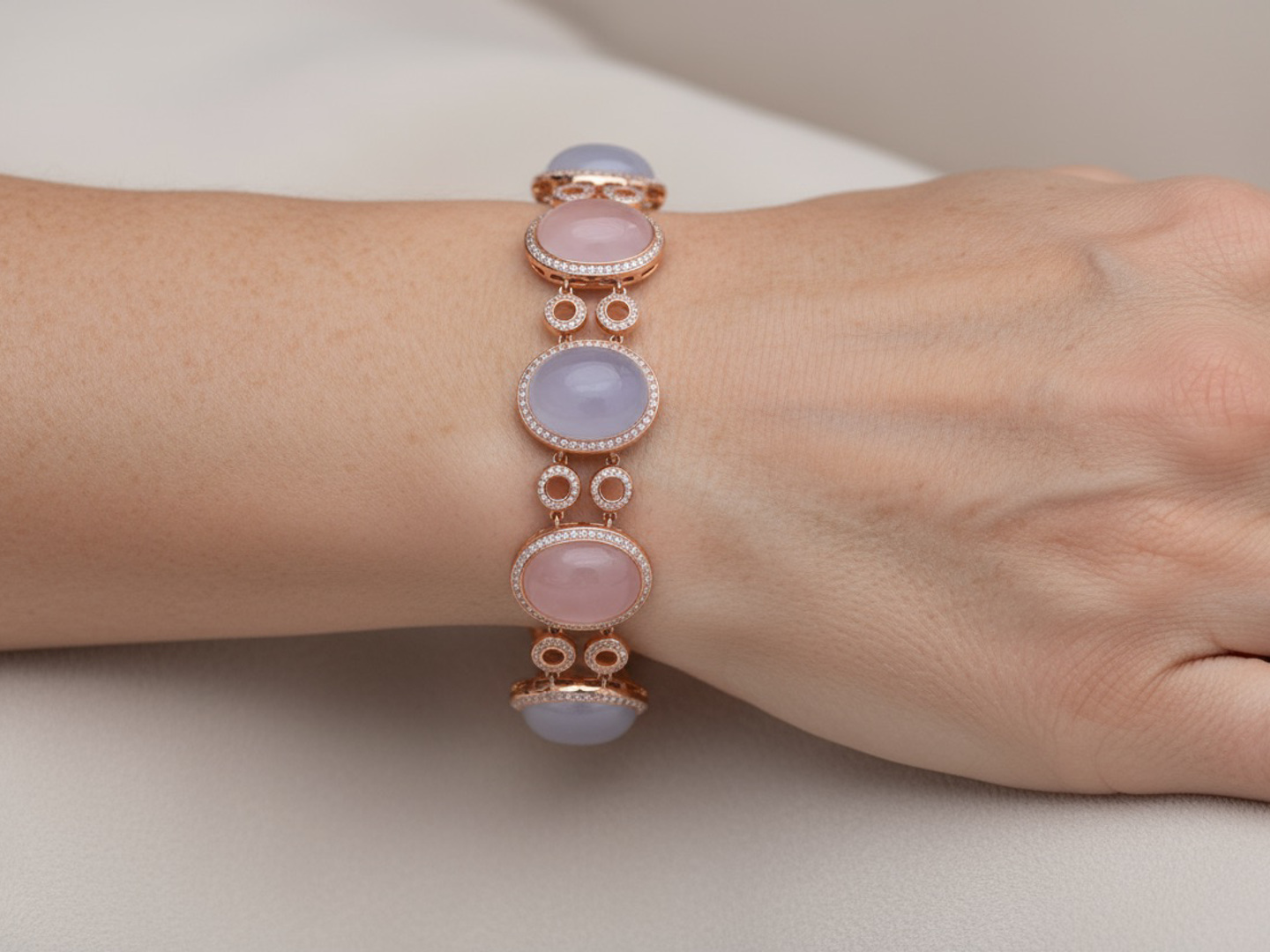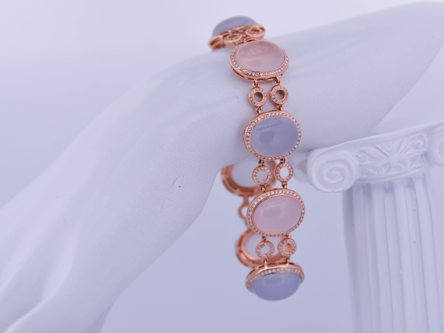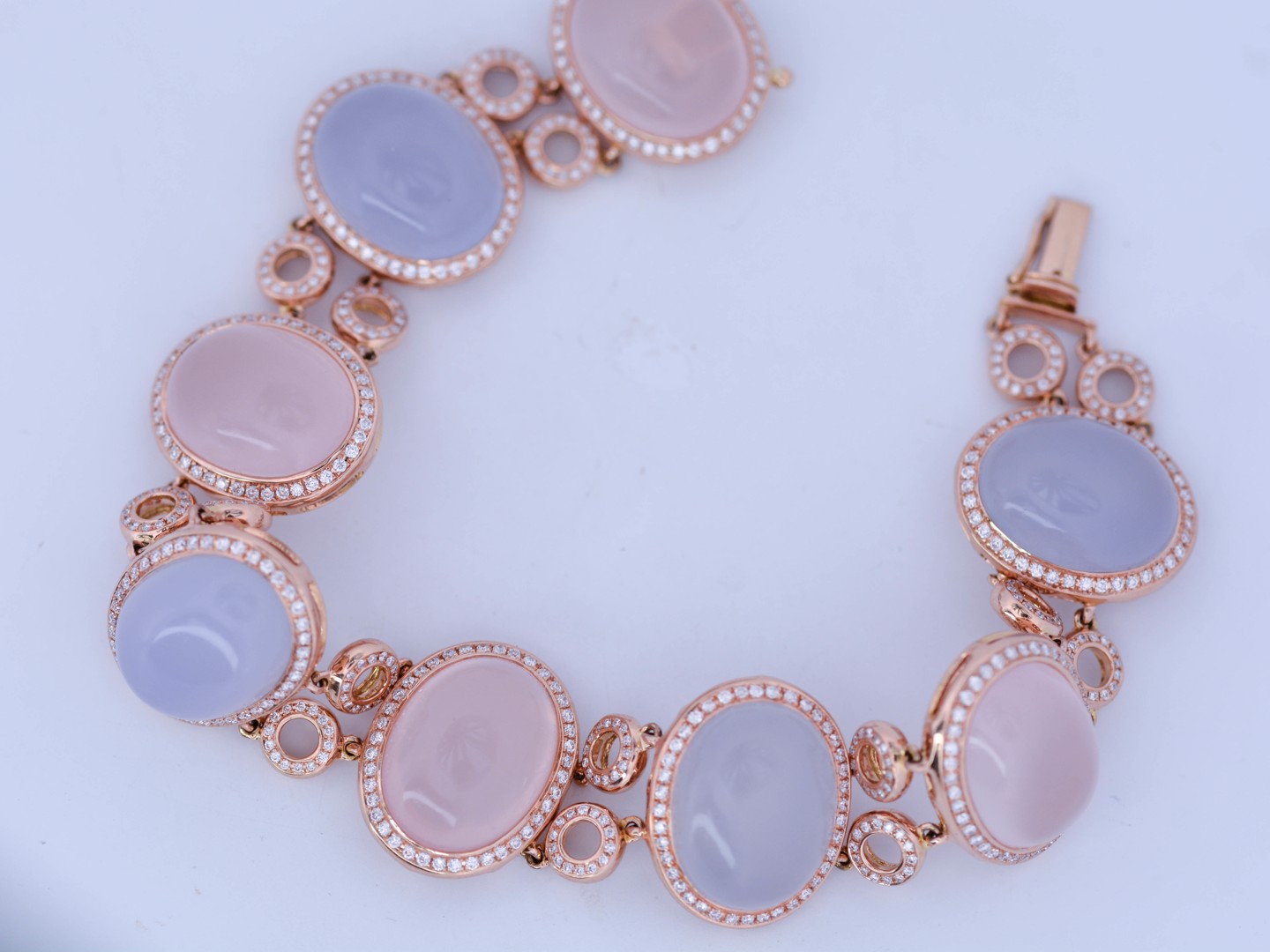 Armband in roségoud (18 kt, gemerkt 750), bezet met 4 roze kwartsstenen en 4 lichtblauwe kwartsstenen, cabochon geslepen, samen ca. 80 ct. Omringd door 664 briljantgeslepen diamanten met een gezamenlijk gewicht van ca. 4 ct, kleur R–G, zuiverheid VS. Lengte: ca. 20 cm. Gewicht: 46 g.