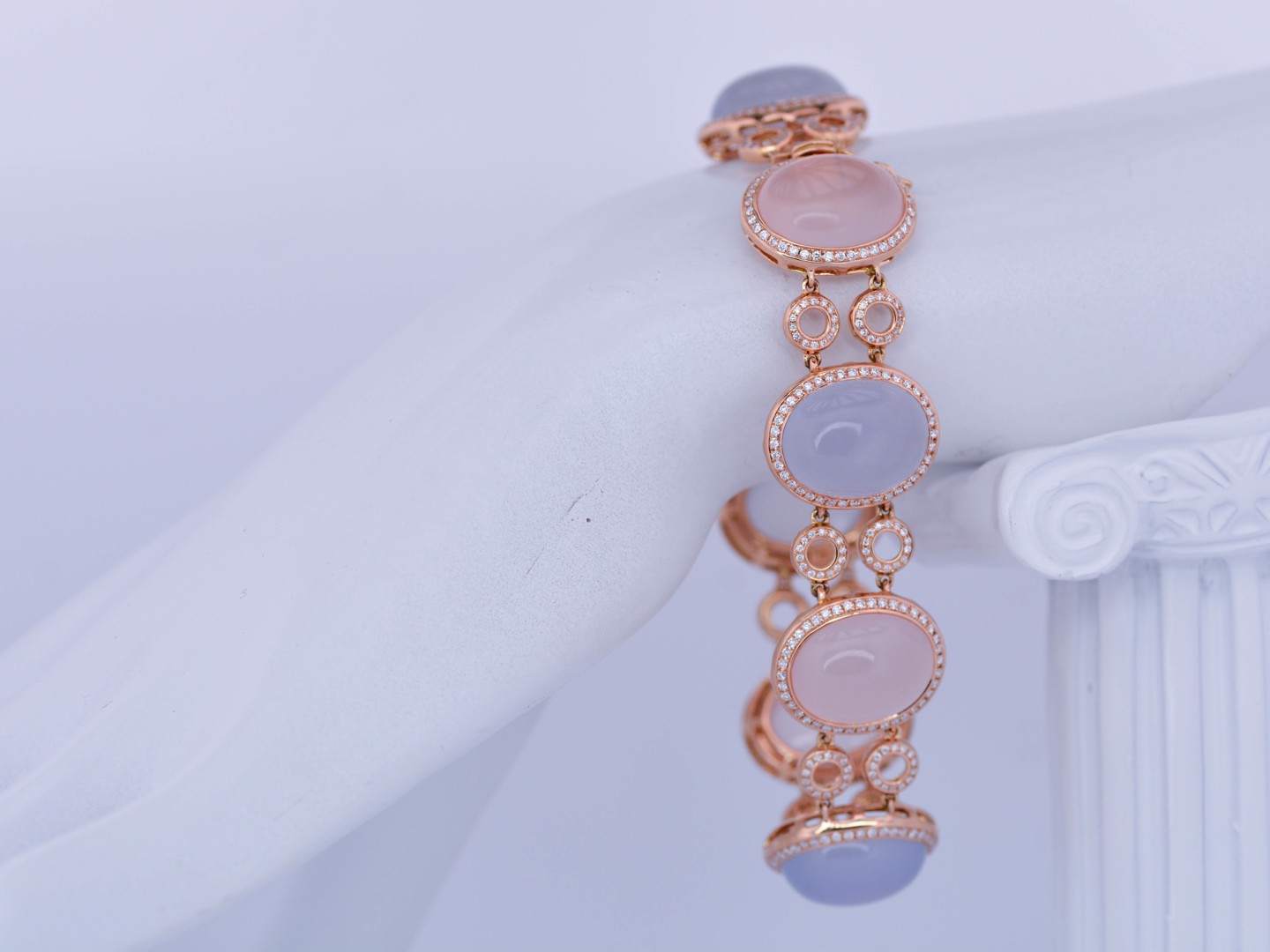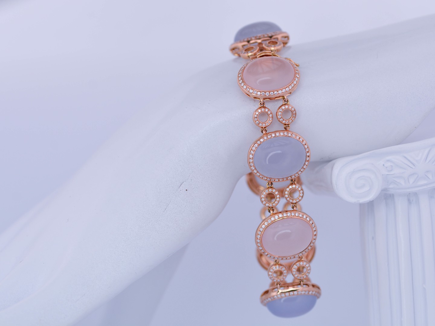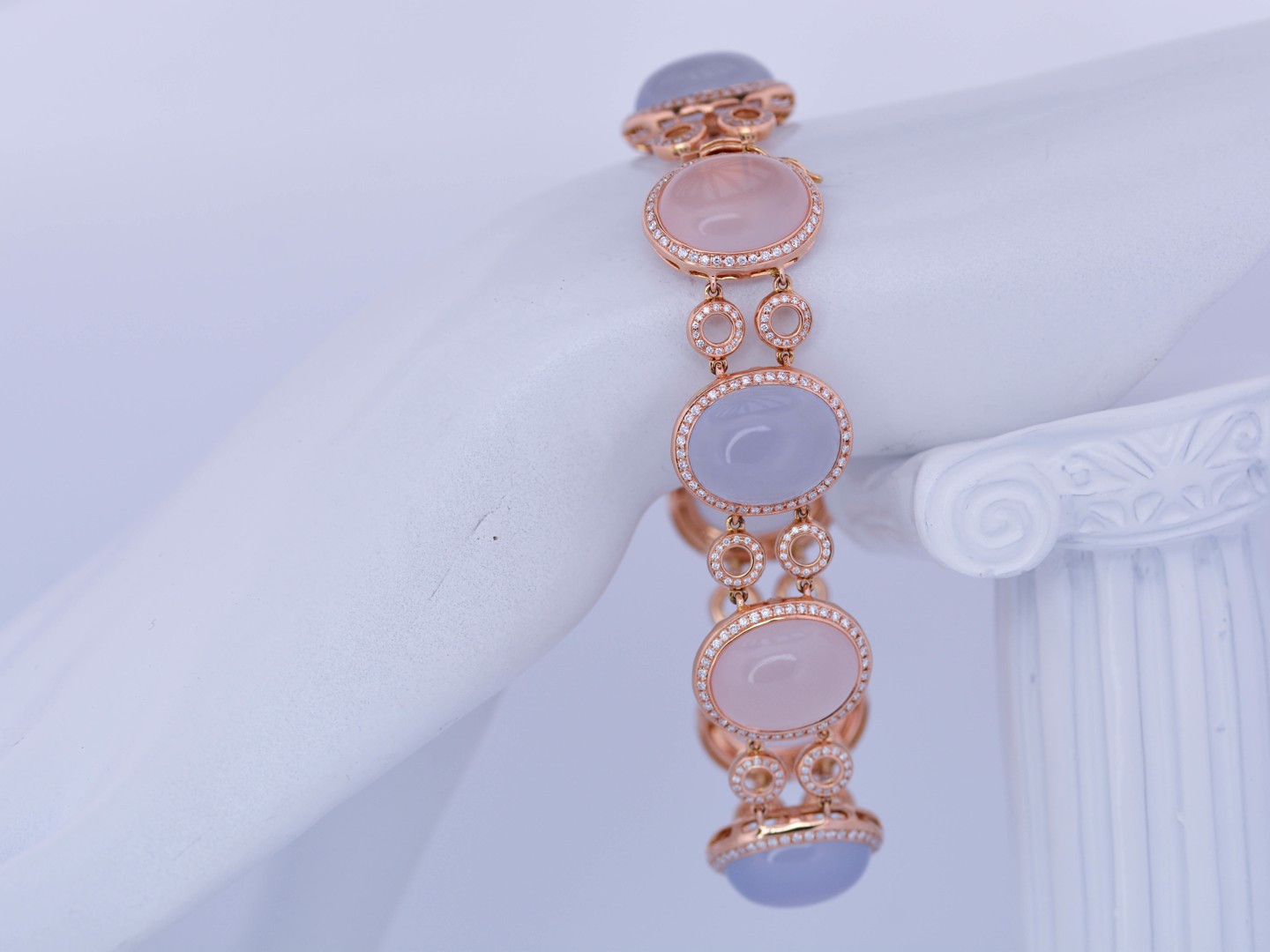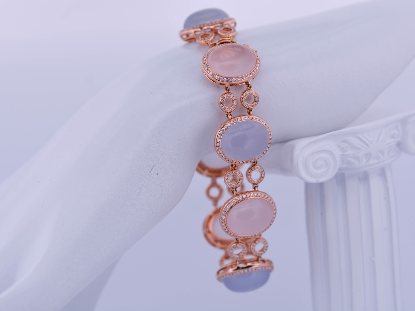 De zachte pasteltinten van roze en lichtblauwe kwarts komen hier tot leven in een luxueus spel met de sprankelende schittering van honderden diamanten. Deze exclusieve armband in roségoud straalt vrouwelijke elegantie, verfijning en grandeur uit, en vormt een absolute blikvanger binnen elke high-end collectie.