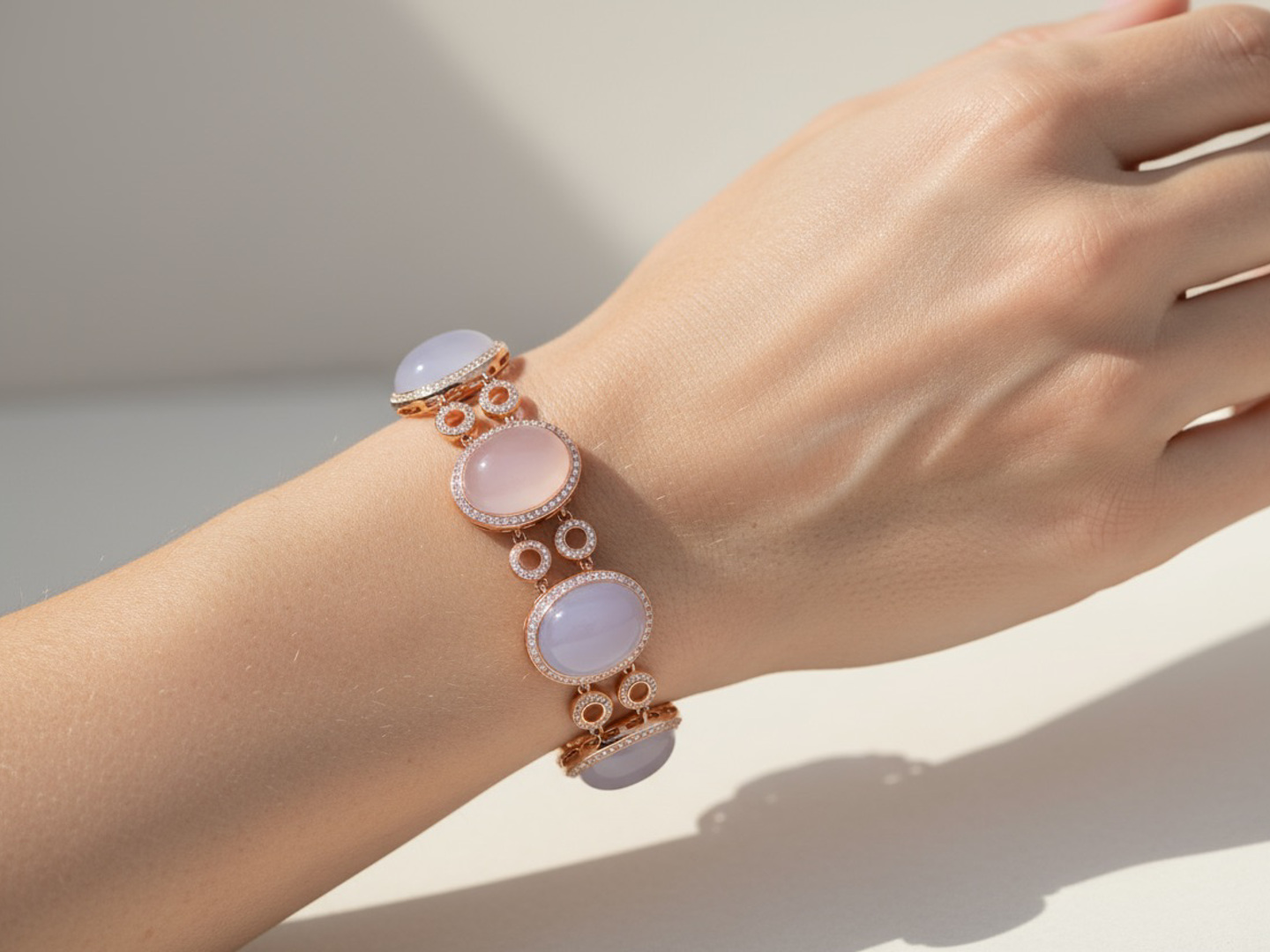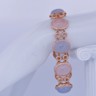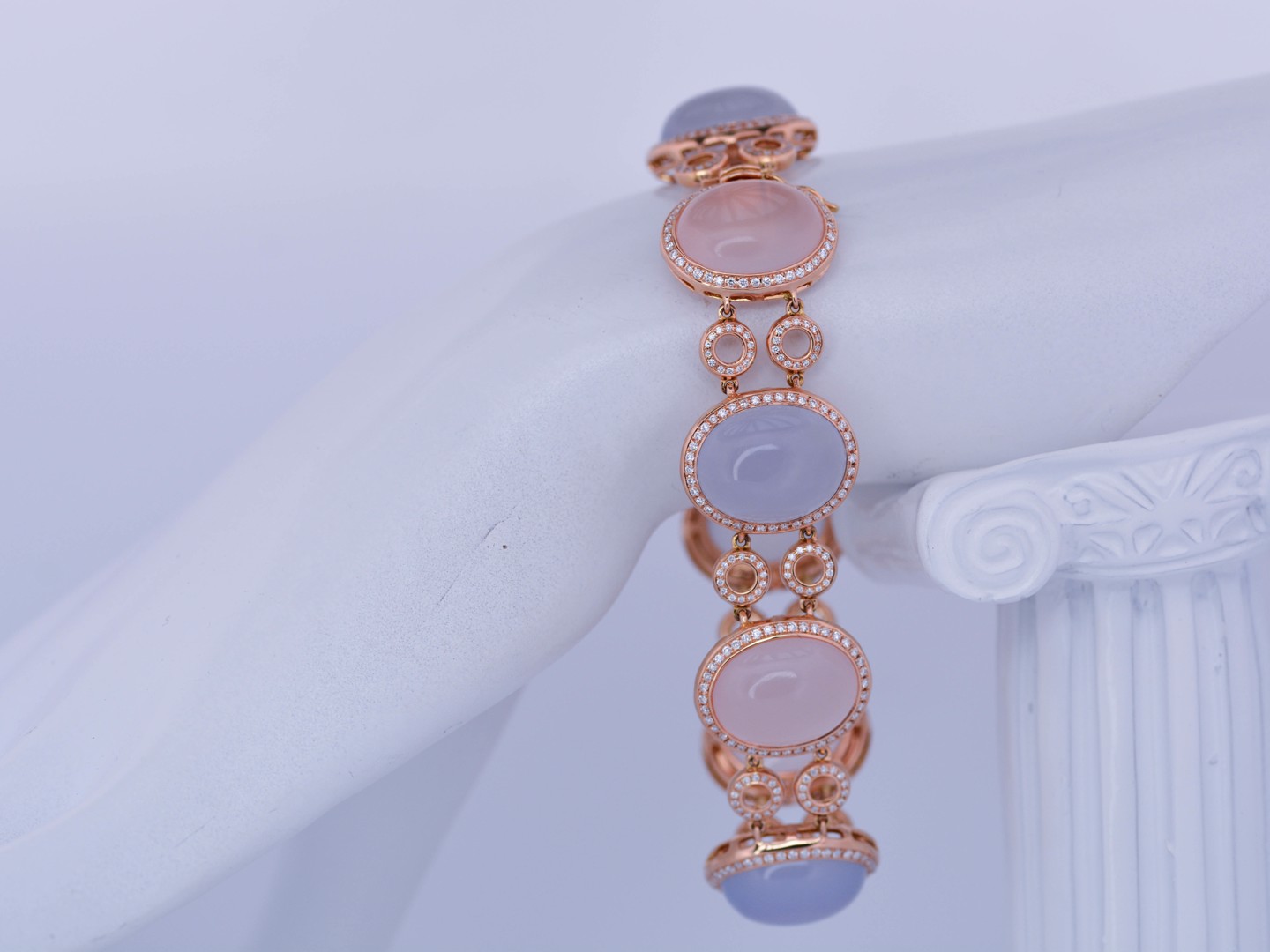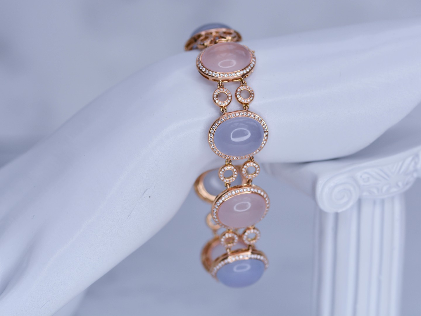 De zachte pasteltinten van roze en lichtblauwe kwarts komen hier tot leven in een luxueus spel met de sprankelende schittering van honderden diamanten. Deze exclusieve armband in roségoud straalt vrouwelijke elegantie, verfijning en grandeur uit, en vormt een absolute blikvanger binnen elke high-end collectie.