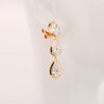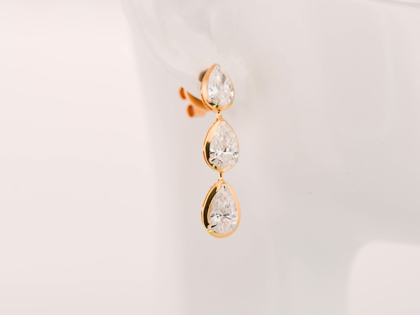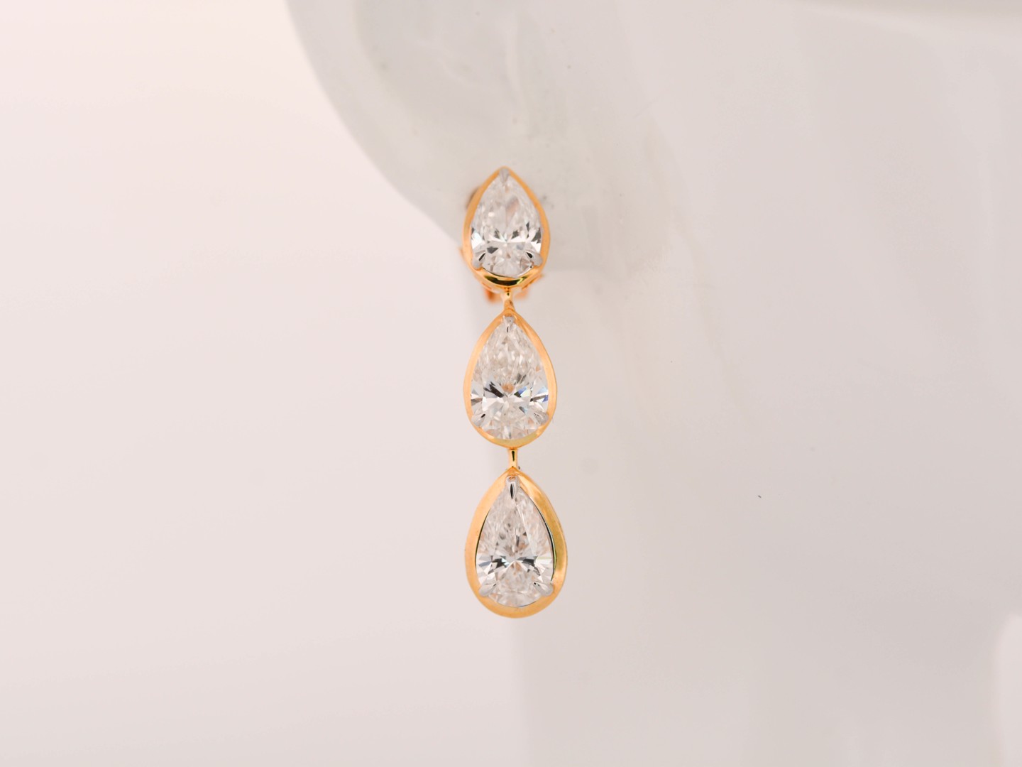 Paar oorbellen in geelgoud (14 kt, gemerkt 585), bezet met 6 witte diamanten per oorbel, samen ca. 4,30 ct, kleur D–F, zuiverheid VVS. Lengte: ca. 30 mm.