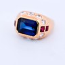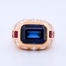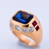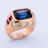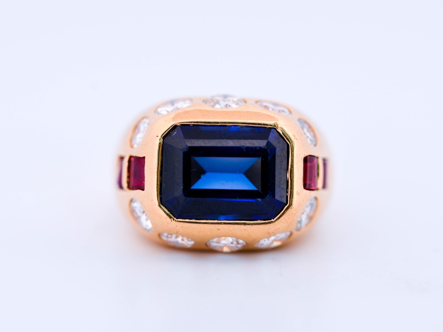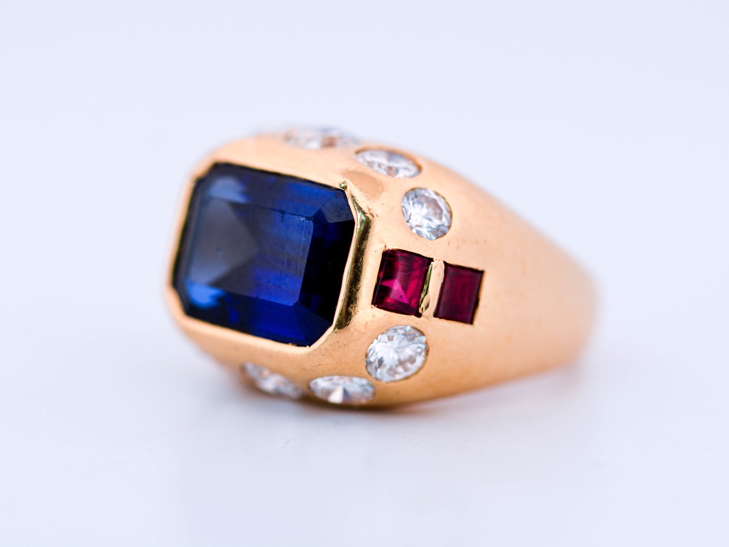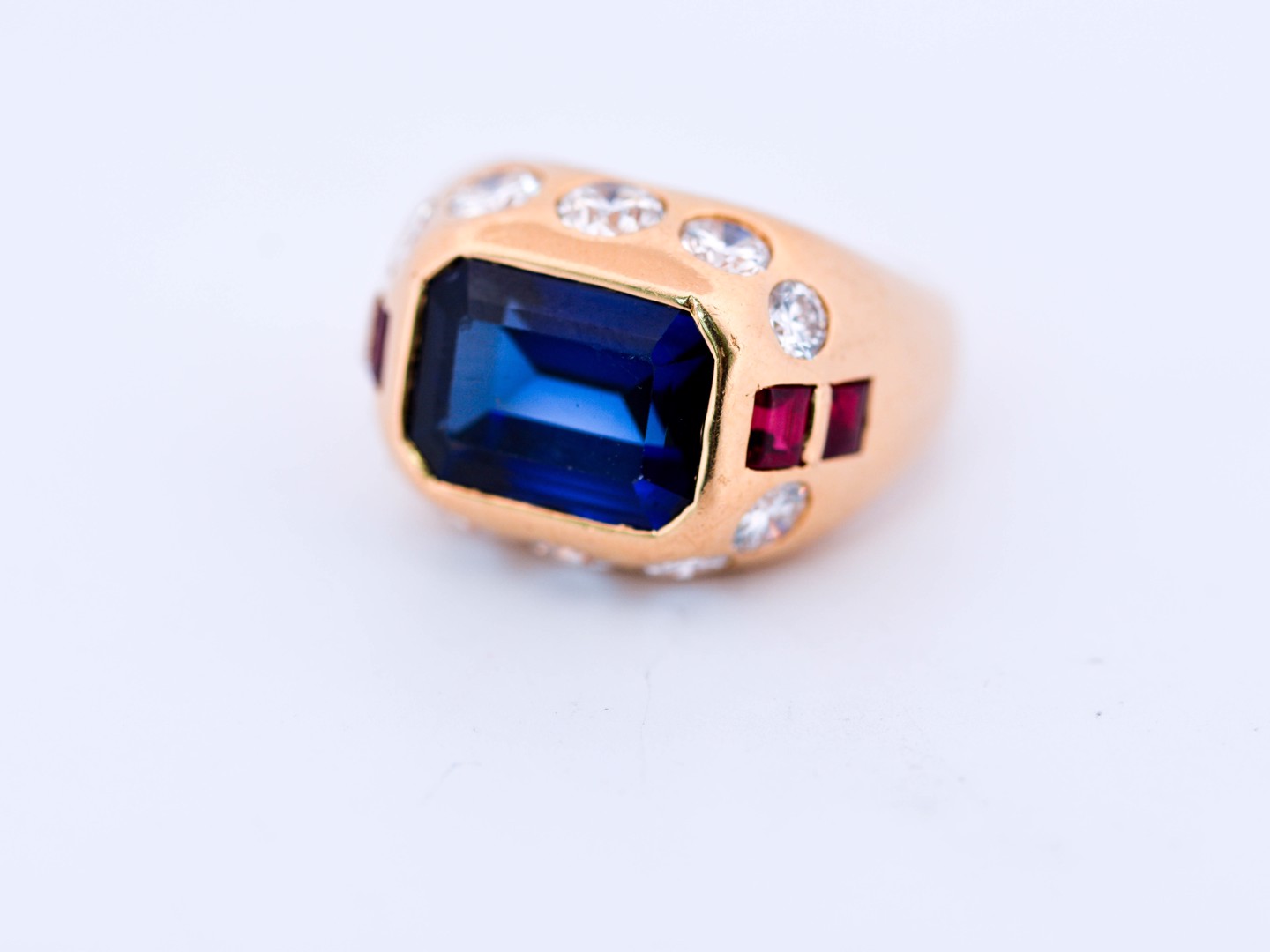 Ring in geelgoud (18 kt), bezet met een Royal Blue saffier van ca. 12 ct, omringd door 10 grote briljantgeslepen diamanten met een gezamenlijk gewicht van ca. 3 ct, kleur F–G, zuiverheid VS, en verrijkt met 4 robijnen van ca. 1 ct in totaal. Ringmaat: 56–58. Gewicht: 18,52 g.