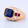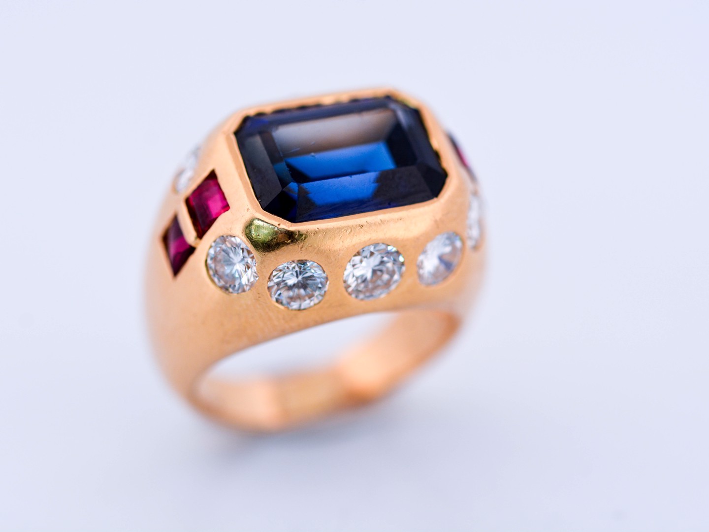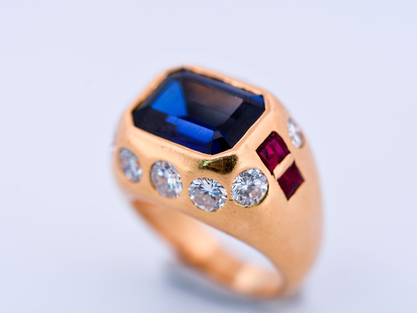 De diepe, koninklijke glans van de saffier straalt majestueus te midden van fonkelende diamanten en levendige robijnen. Deze ring combineert zeldzame edelstenen in een harmonieus ontwerp dat kracht, luxe en verfijnde elegantie uitstraalt – een absolute statement piece voor de veeleisende verzamelaar.