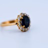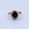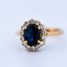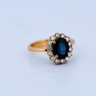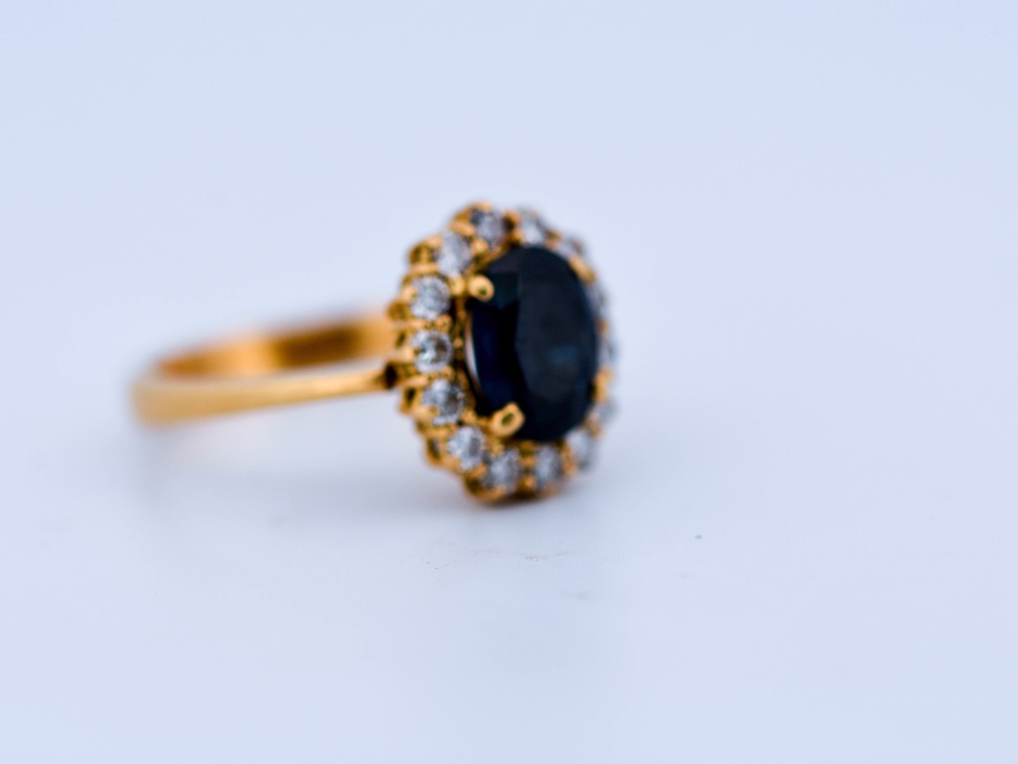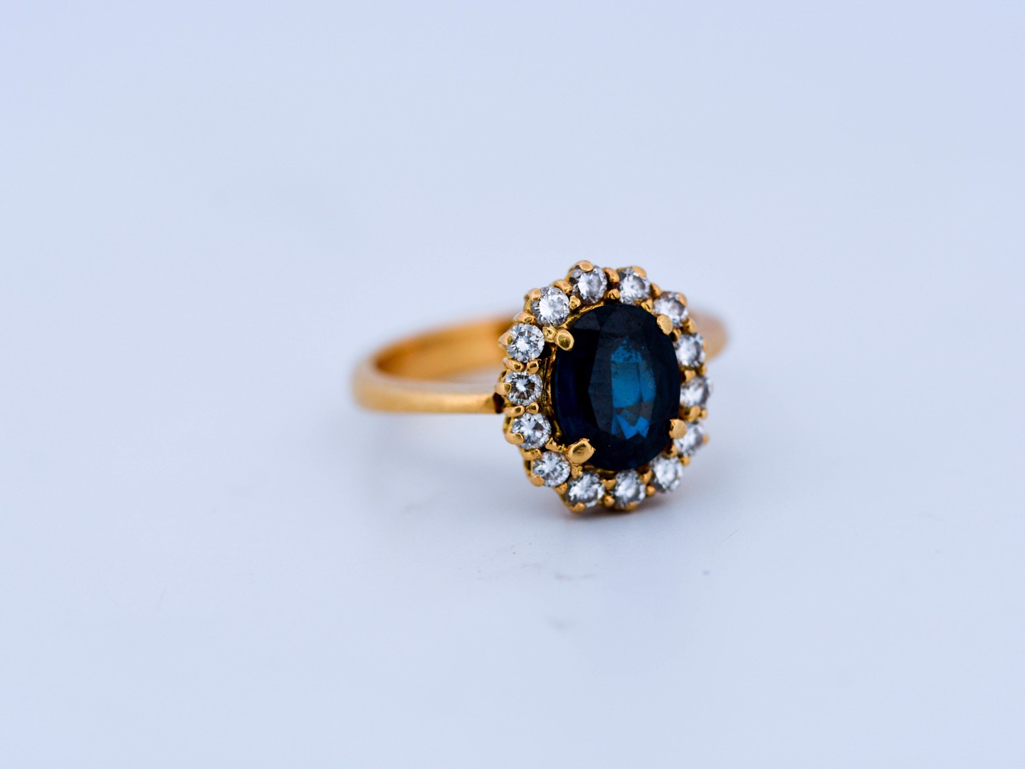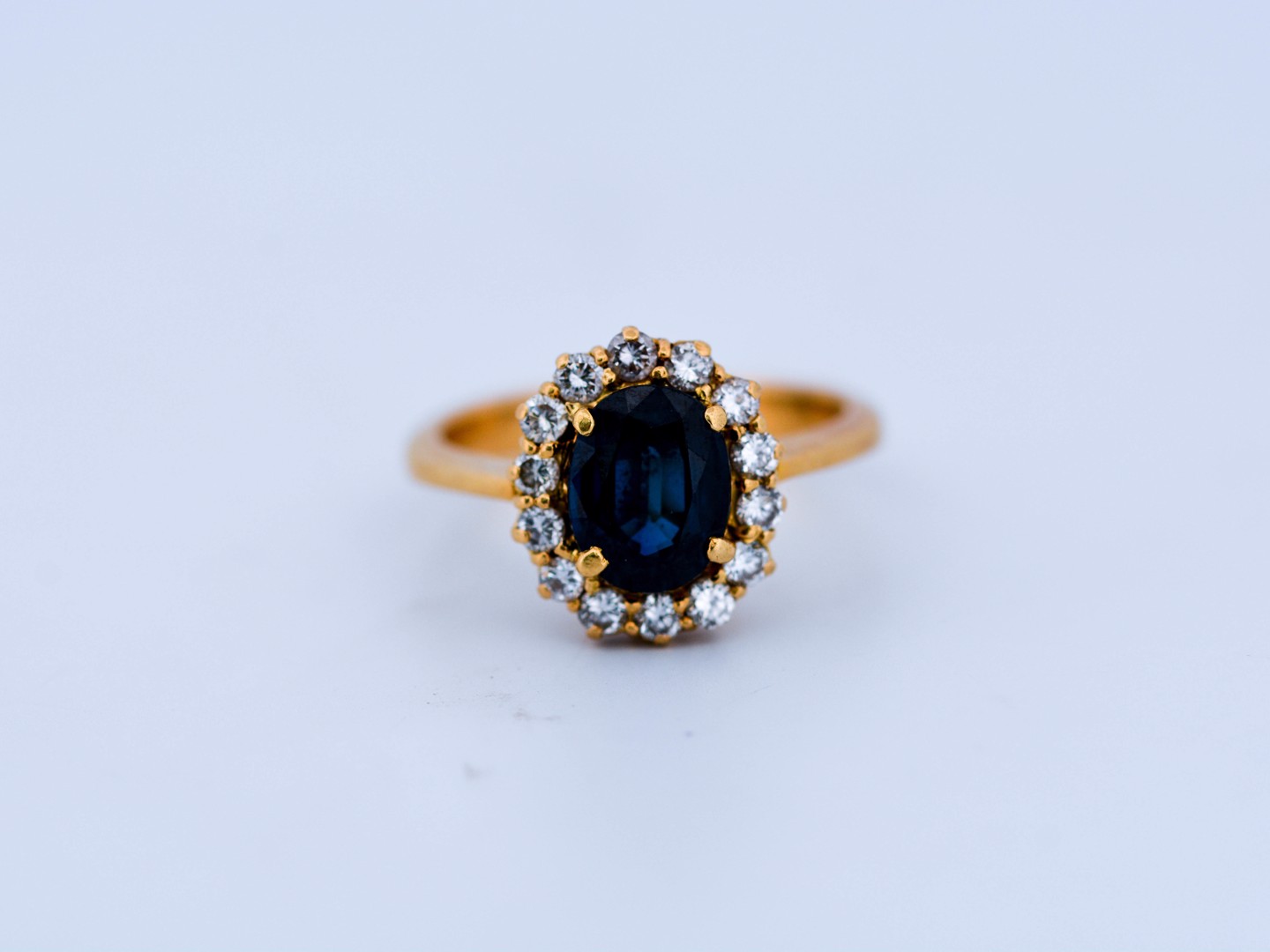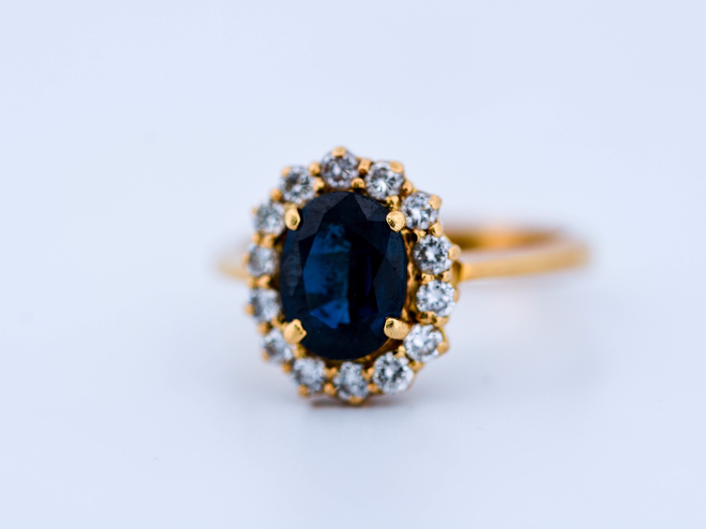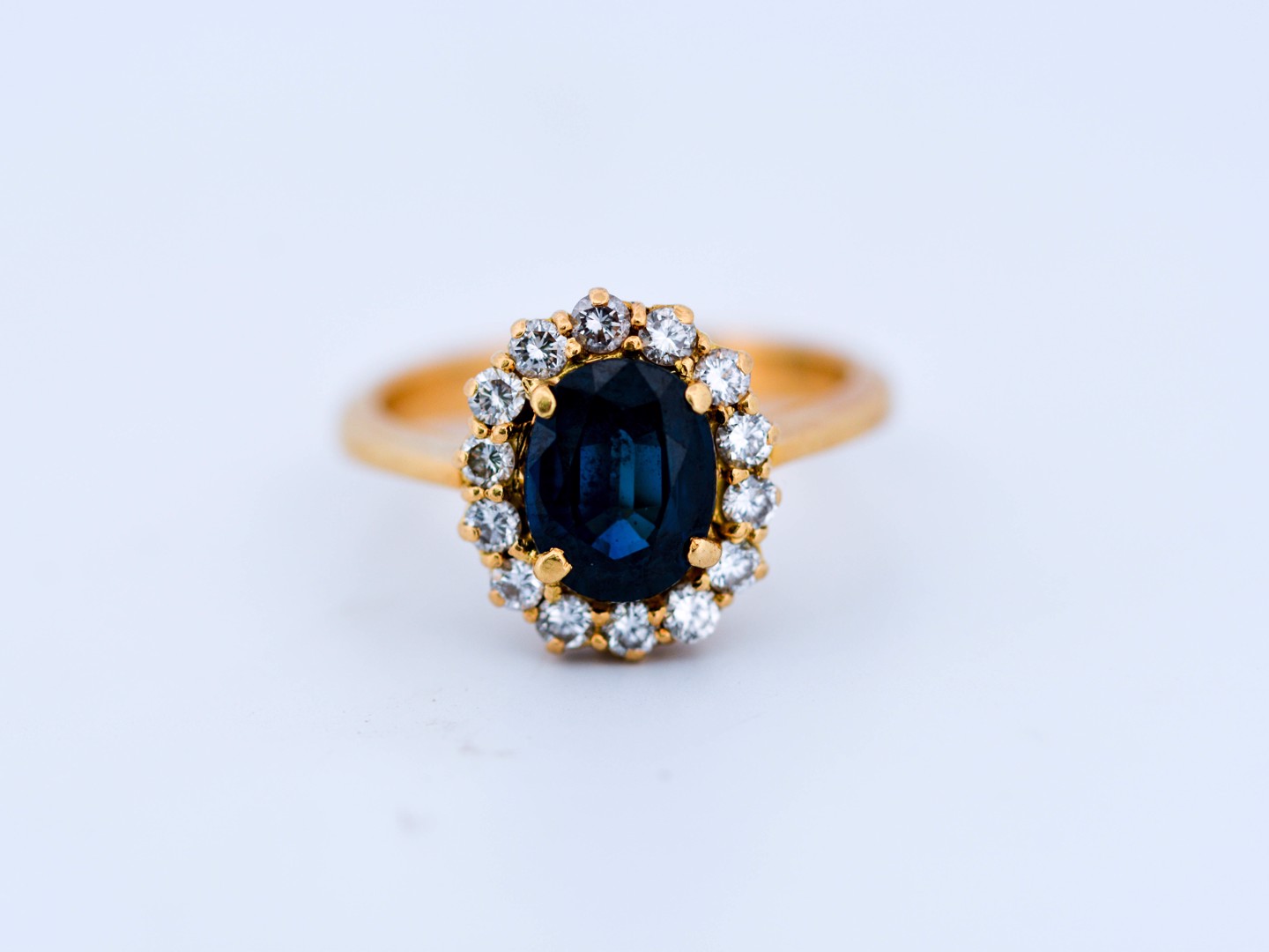 Ring in geelgoud (18 kt), bezet met een blauw-groene peacock-saffier van ca. 3,00 ct, omringd door 14 briljantgeslepen diamanten met een gezamenlijk gewicht van ca. 0,70 ct, kleur F, zuiverheid VS. Ringmaat: 54–56. Afmetingen: ca. 14 × 12 mm.