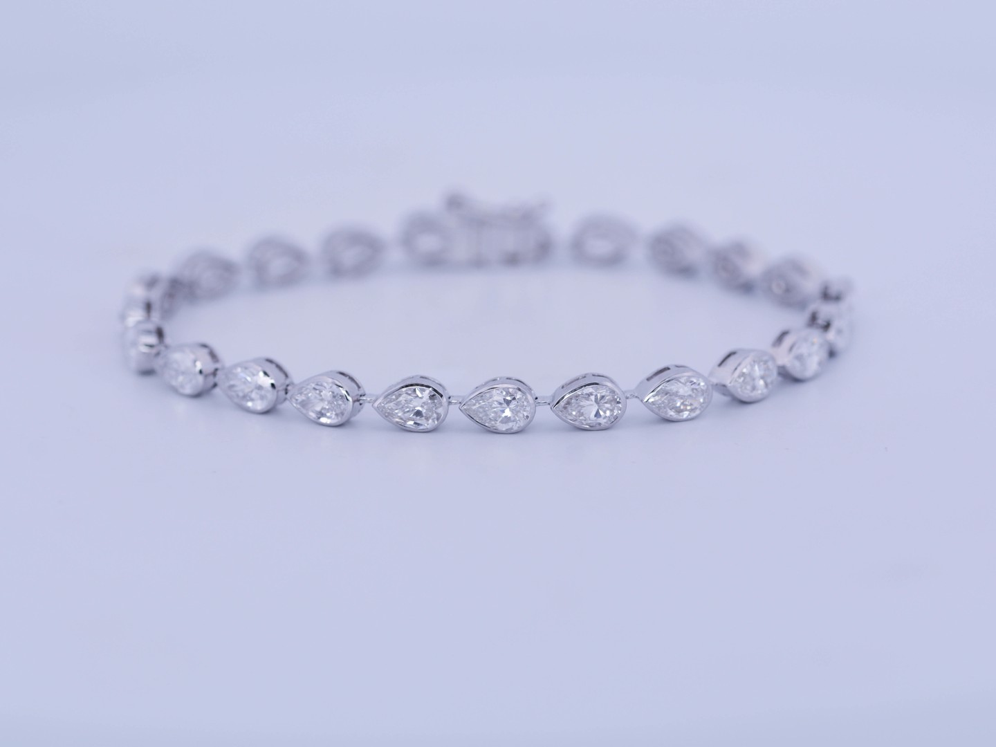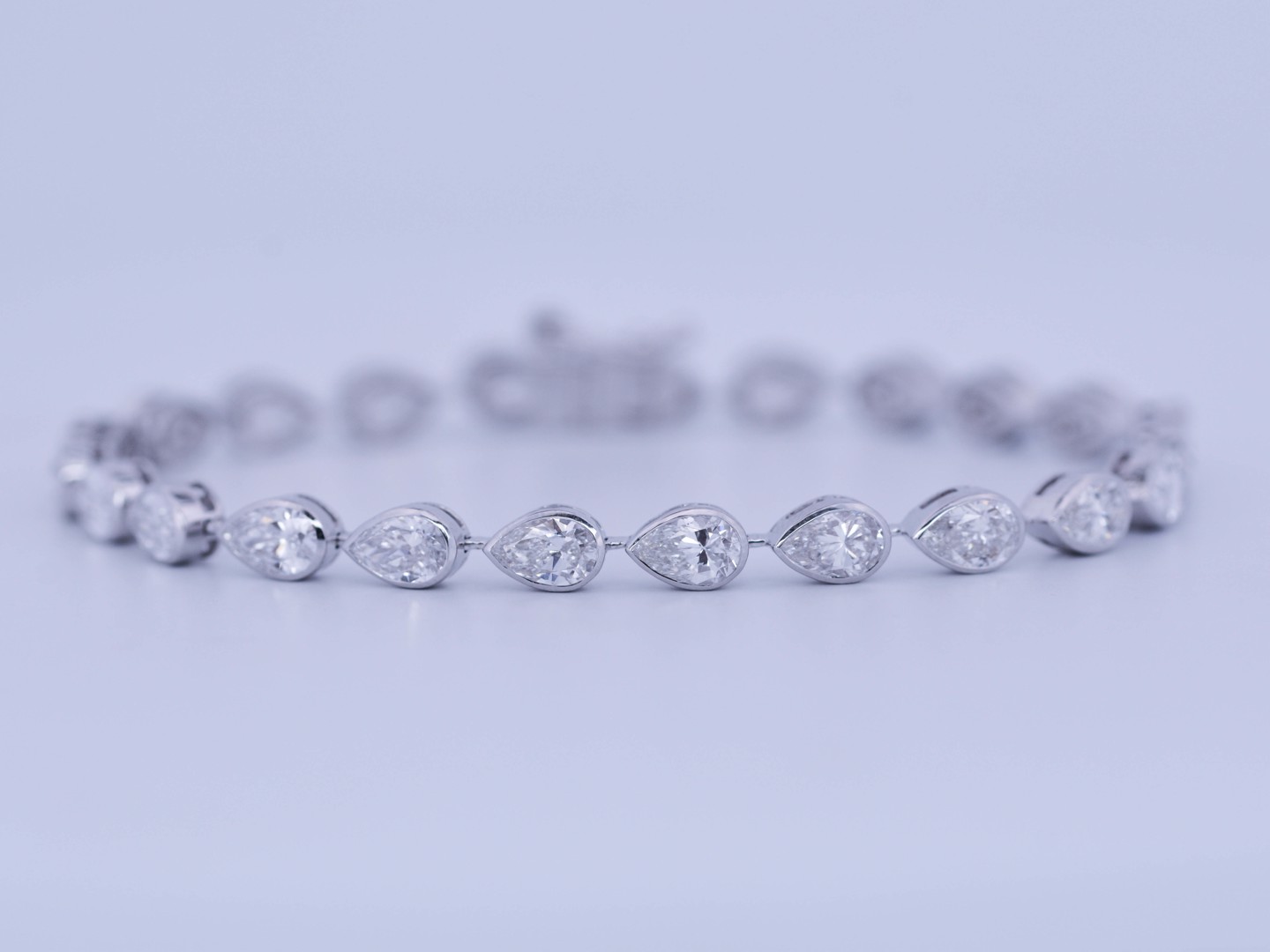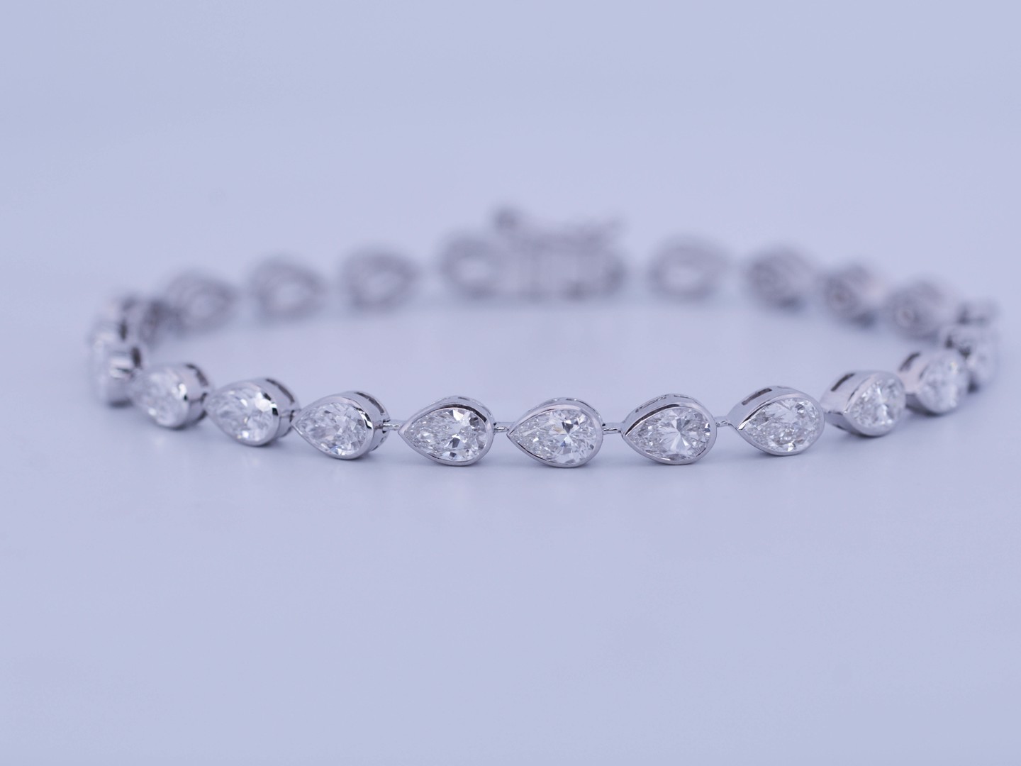 Armband in witgoud (18 kt), uitgevoerd als klassieke rivière, bezet met 23 peer geslepen diamanten met een gezamenlijk gewicht van ca. 9,50 ct, kleur F–G, zuiverheid VS. Lengte: ca. 19 cm.