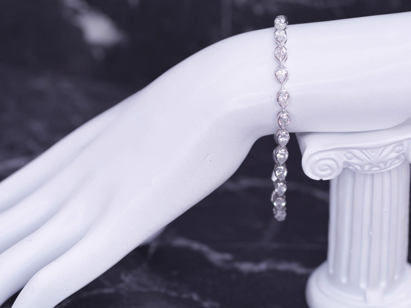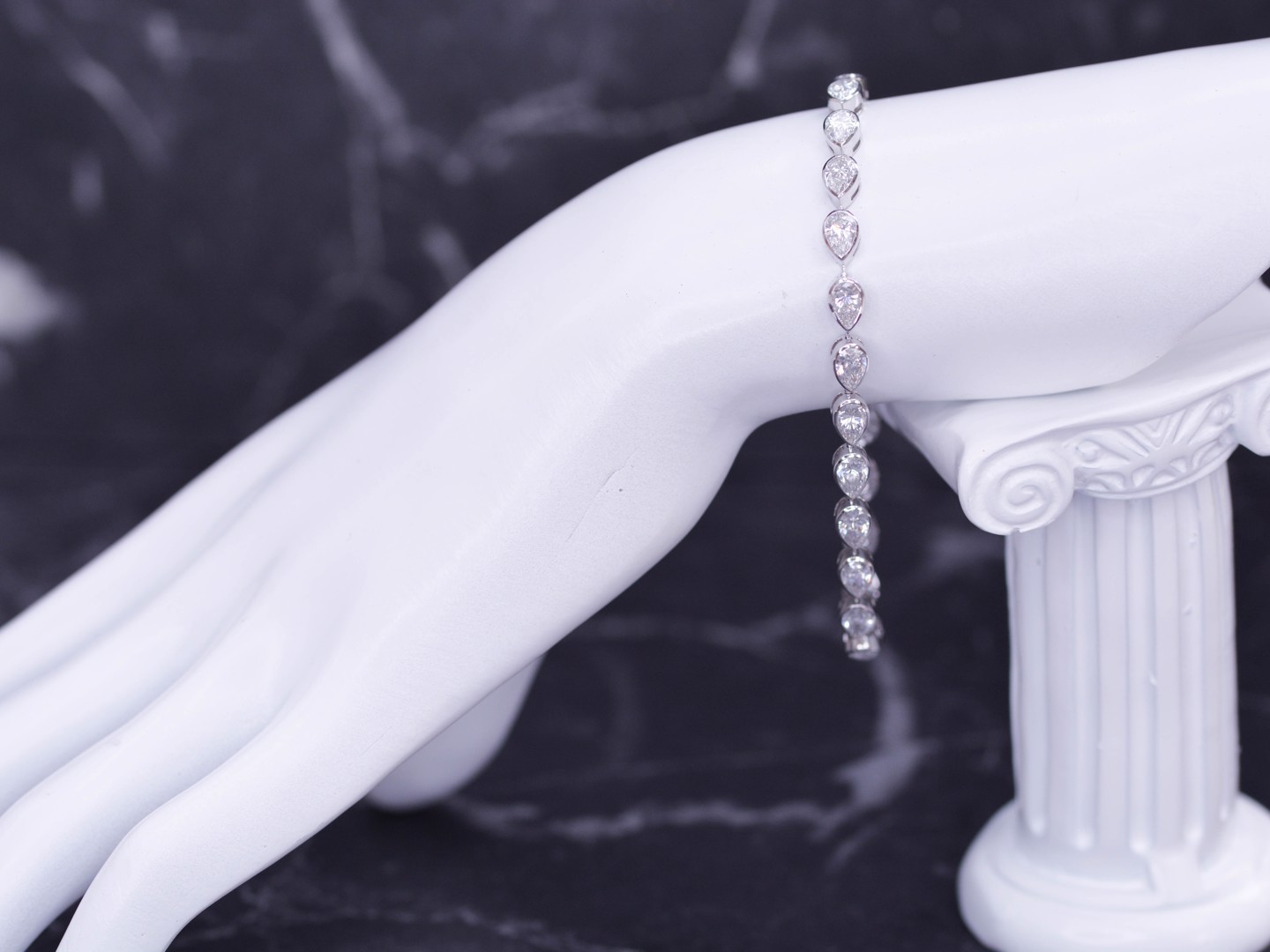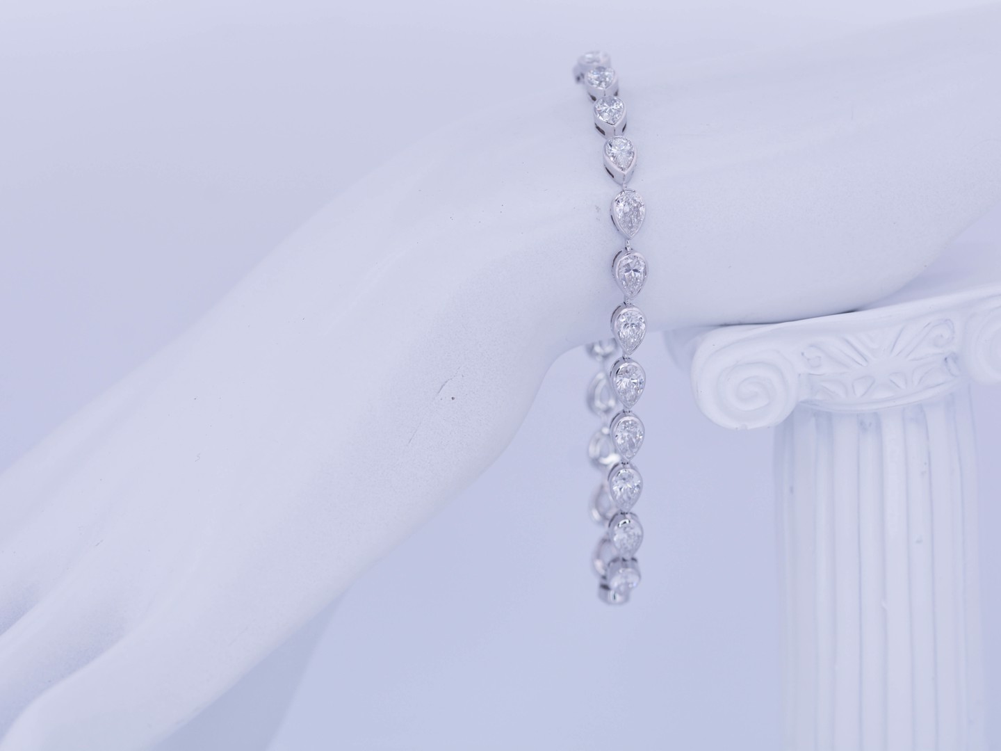 Armband in witgoud (18 kt), uitgevoerd als klassieke rivière, bezet met 23 peer geslepen diamanten met een gezamenlijk gewicht van ca. 9,50 ct, kleur F–G, zuiverheid VS. Lengte: ca. 19 cm.