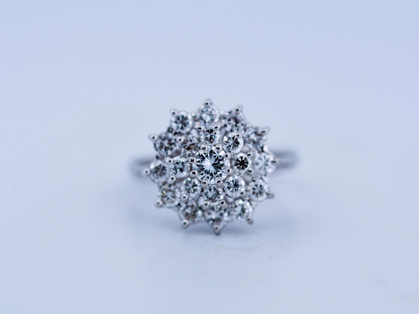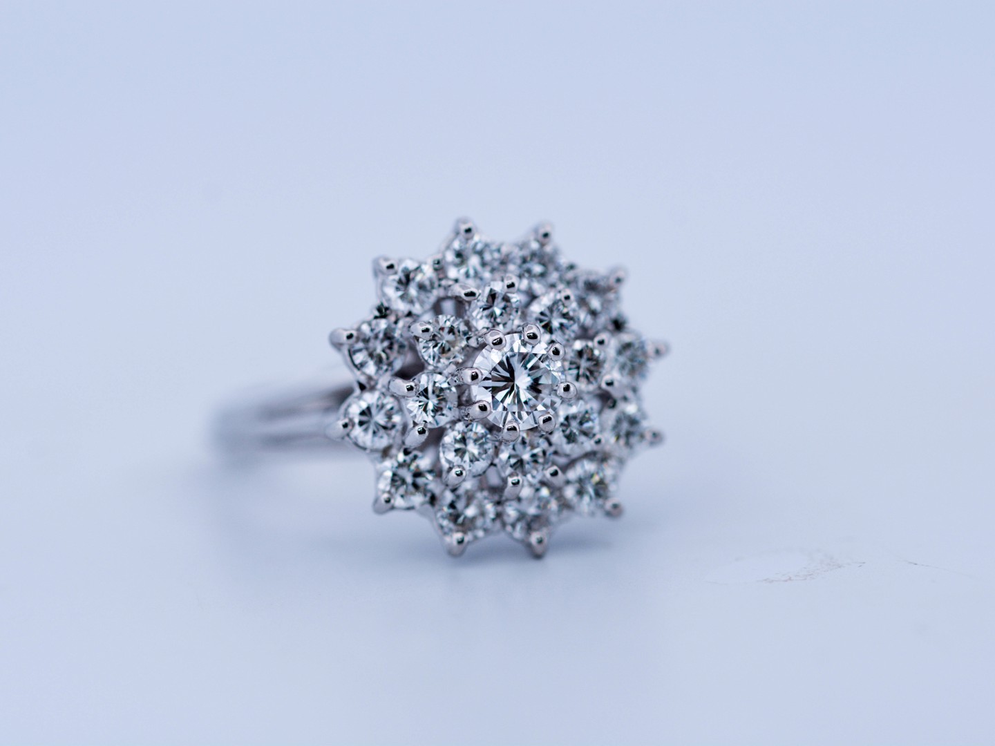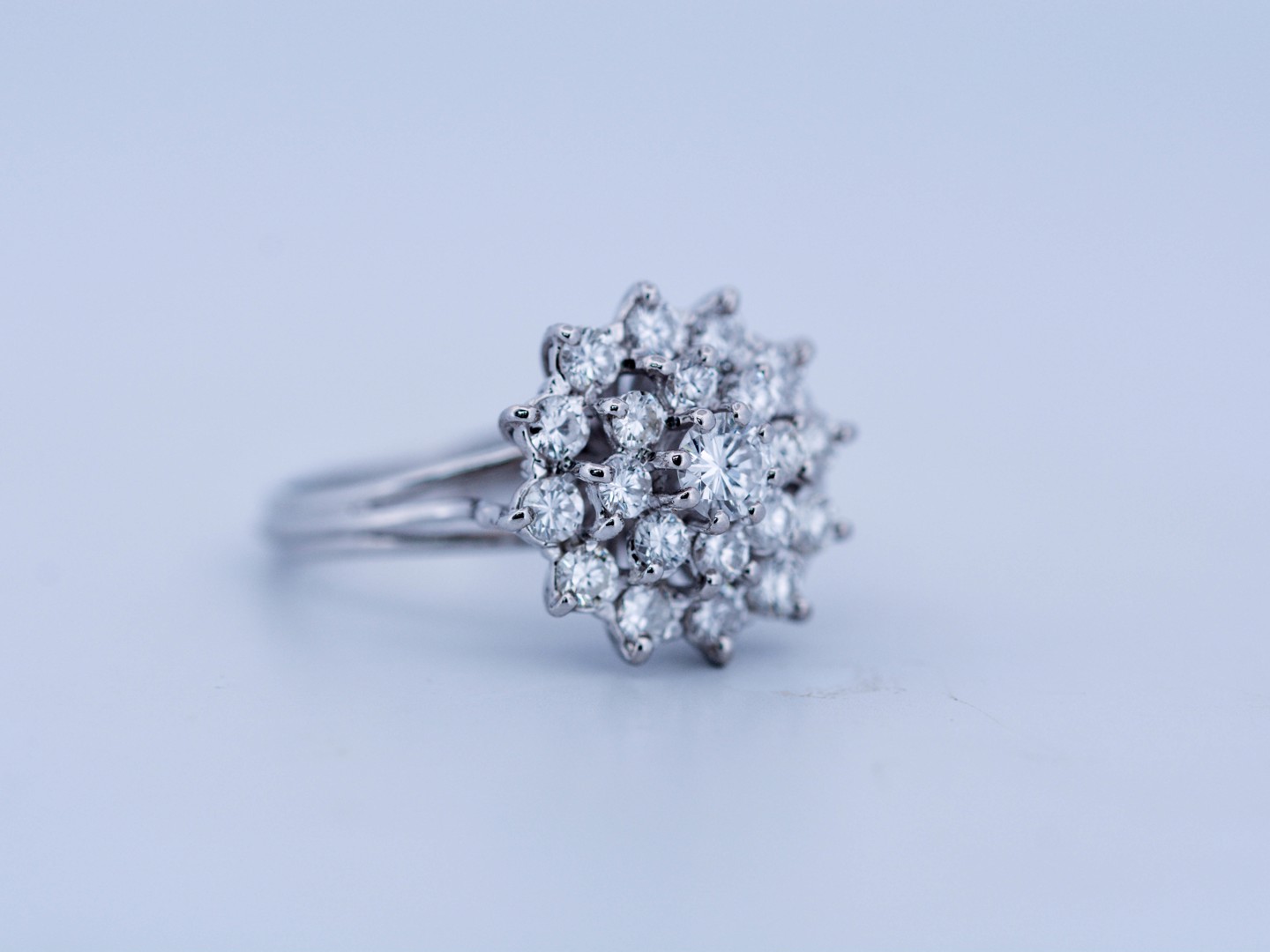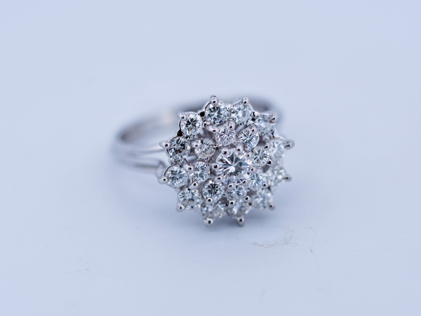 Ring in witgoud (18 kt, gemerkt 750), bezet met 21 briljantgeslepen diamanten met een gezamenlijk gewicht van ca. 3,00 ct, kleur F–G, zuiverheid VS. Ringmaat: 59–61. Diameter: ca. 18 mm.