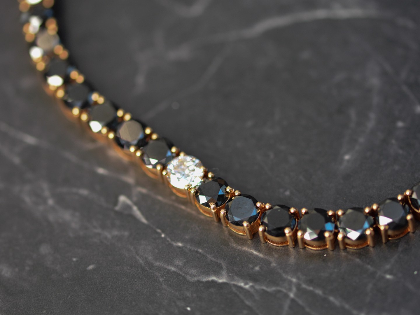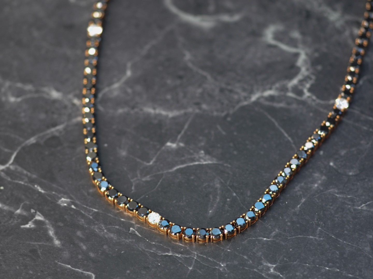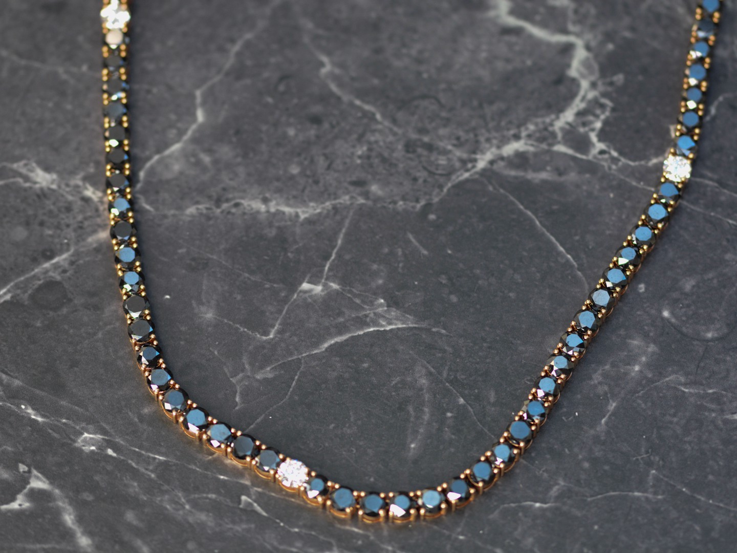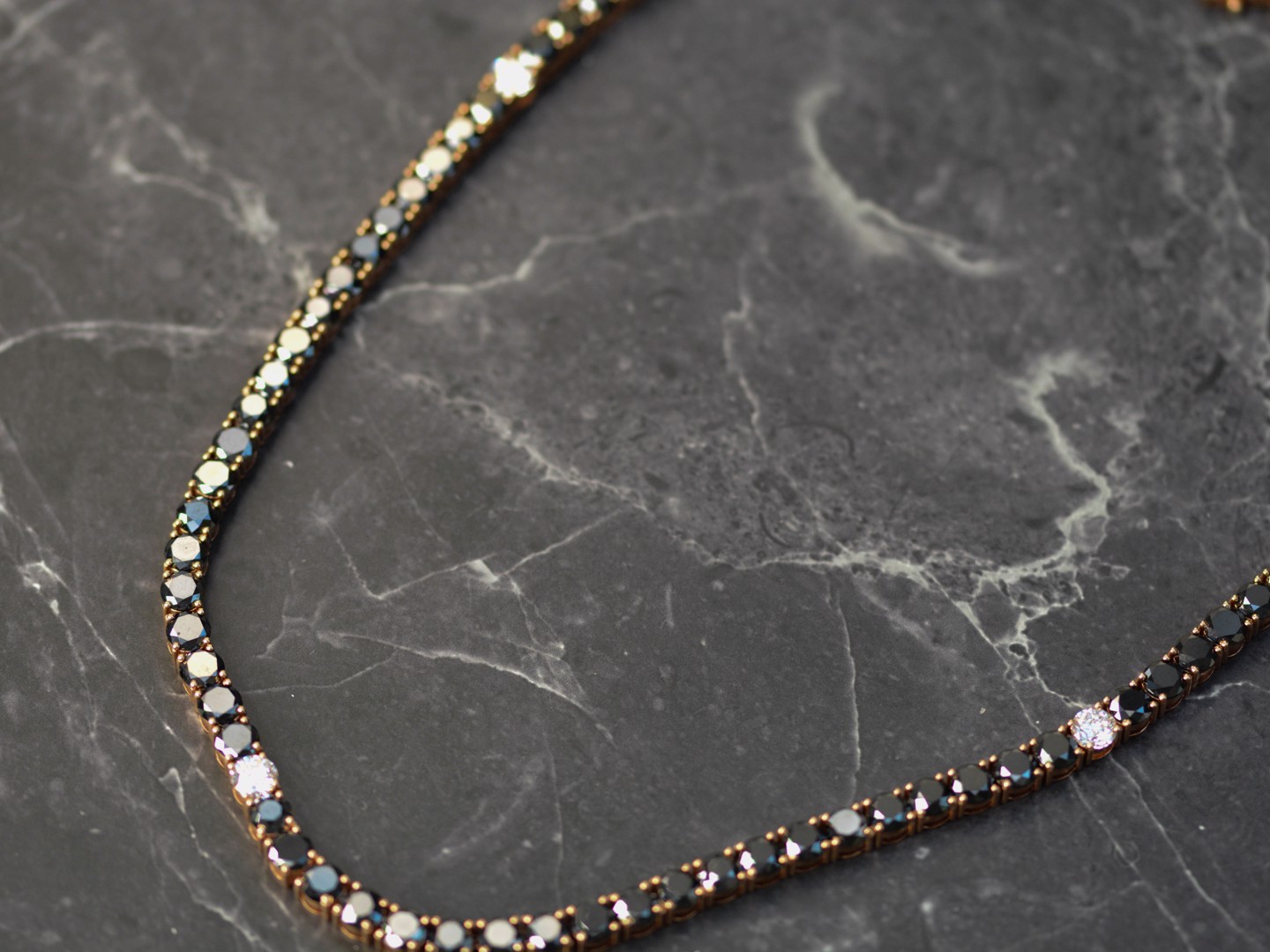 Halsketting in roségoud (18 kt, gemerkt 750), bezet met 46 briljantgeslepen zwarte diamanten van samen ca. 81 ct en 5 briljantgeslepen witte diamanten van ca. 4,50 ct in totaal, kleur D–F (exceptional white), zuiverheid VS. Lengte: ca. 59 cm. Gewicht: 84,19 g.