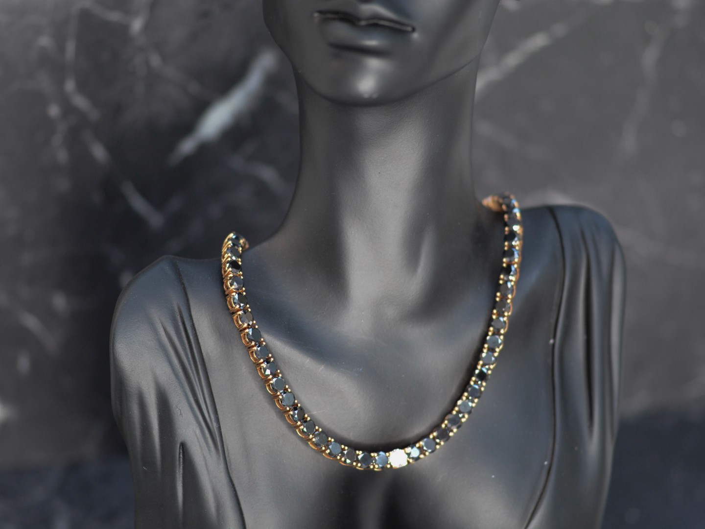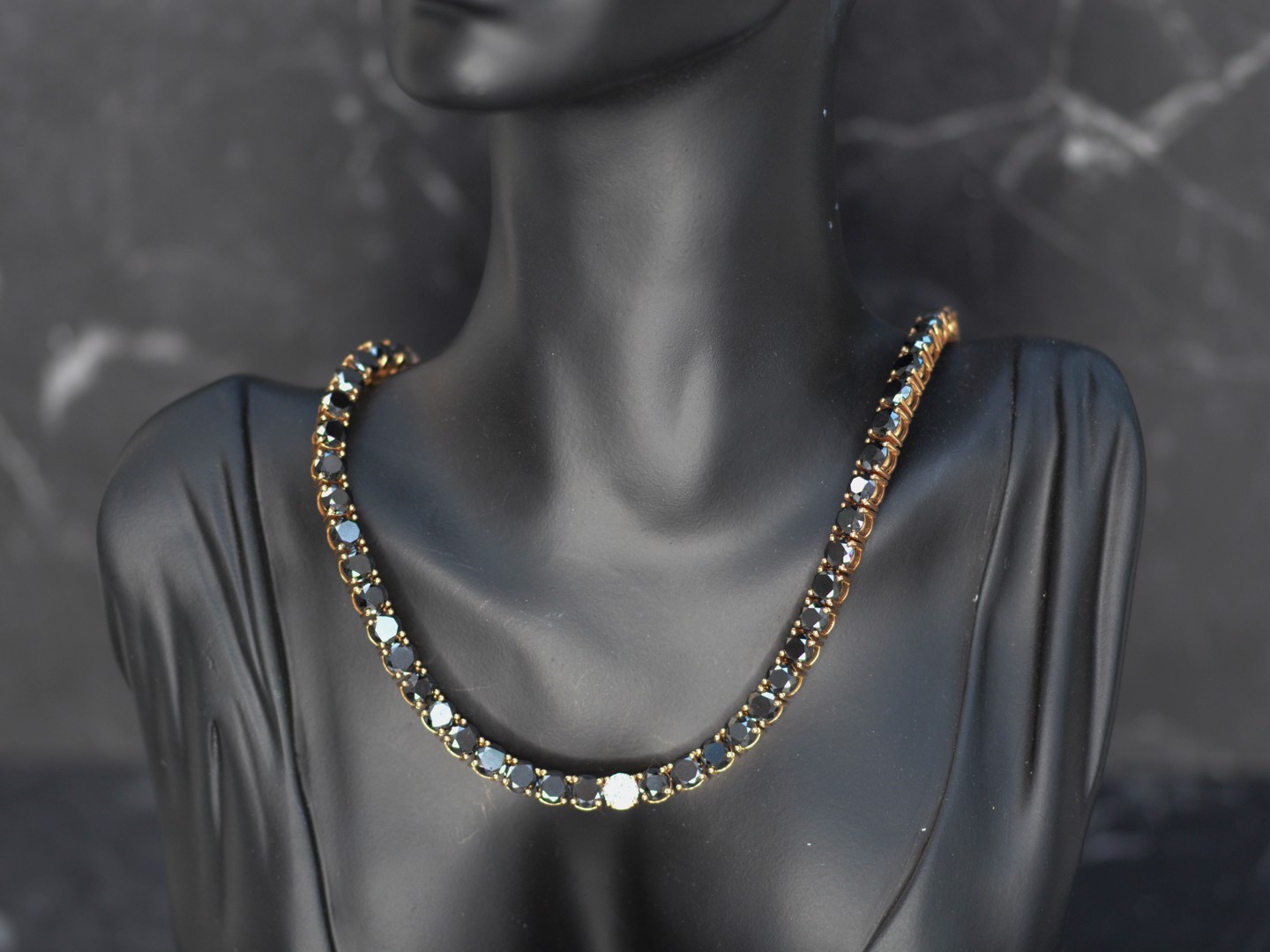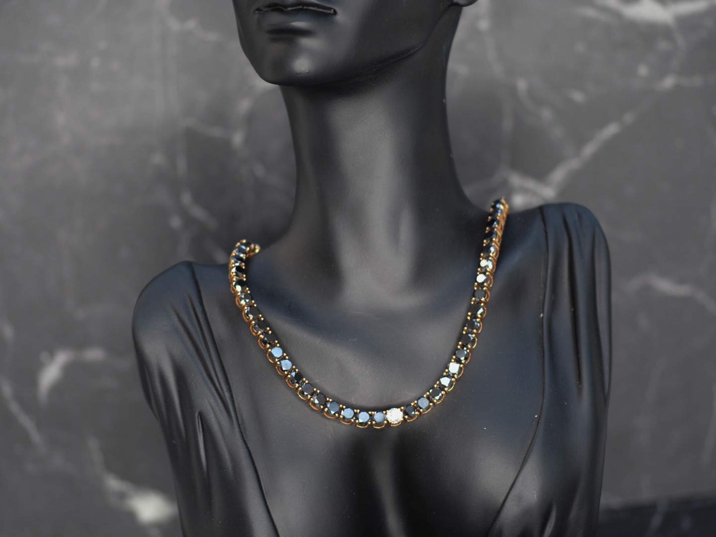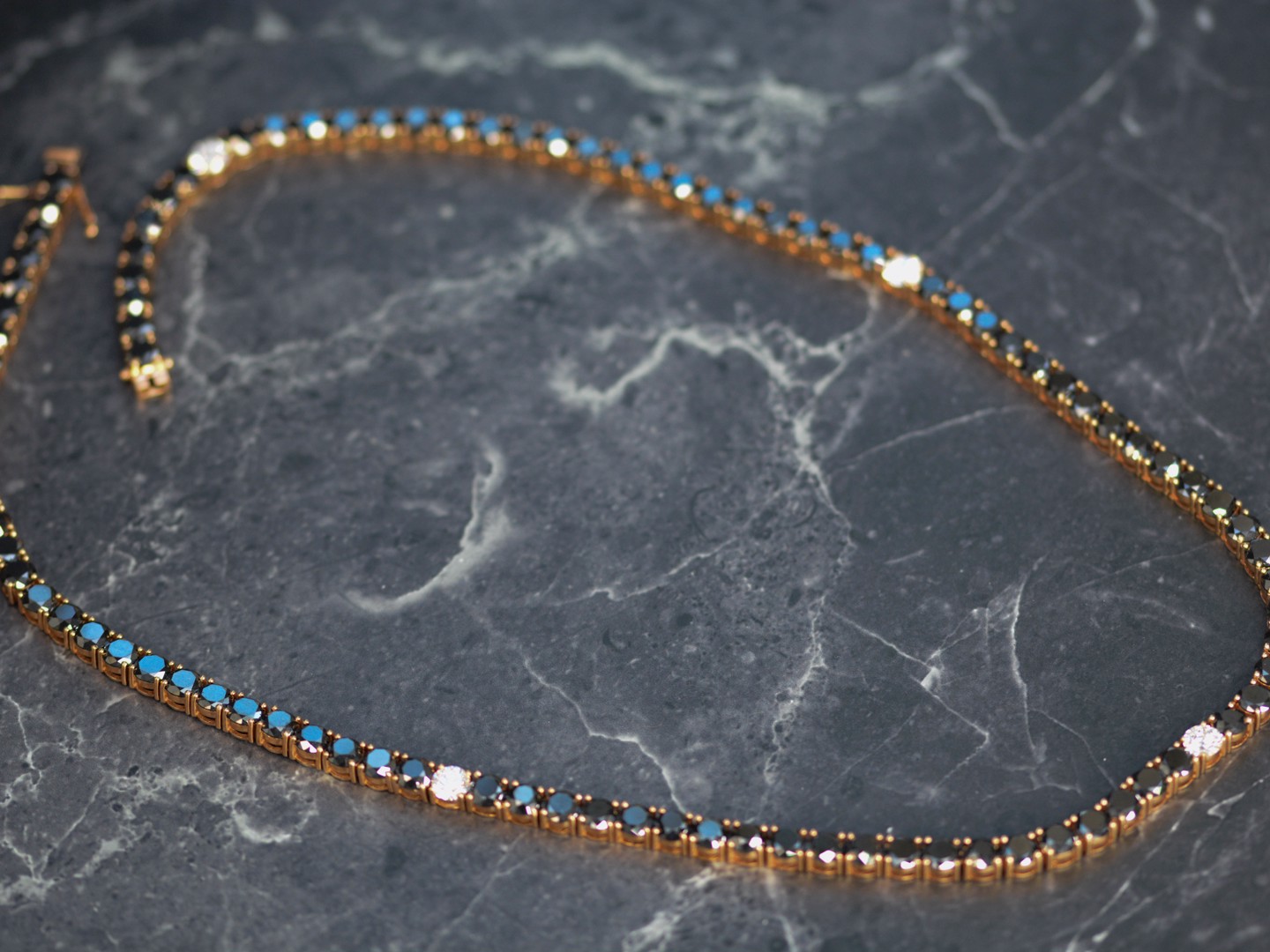 Halsketting in roségoud (18 kt, gemerkt 750), bezet met 46 briljantgeslepen zwarte diamanten van samen ca. 81 ct en 5 briljantgeslepen witte diamanten van ca. 4,50 ct in totaal, kleur D–F (exceptional white), zuiverheid VS. Lengte: ca. 59 cm. Gewicht: 84,19 g.