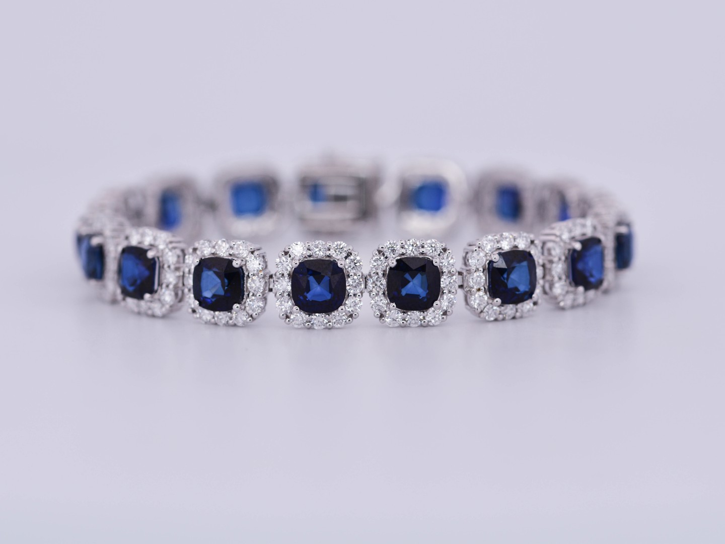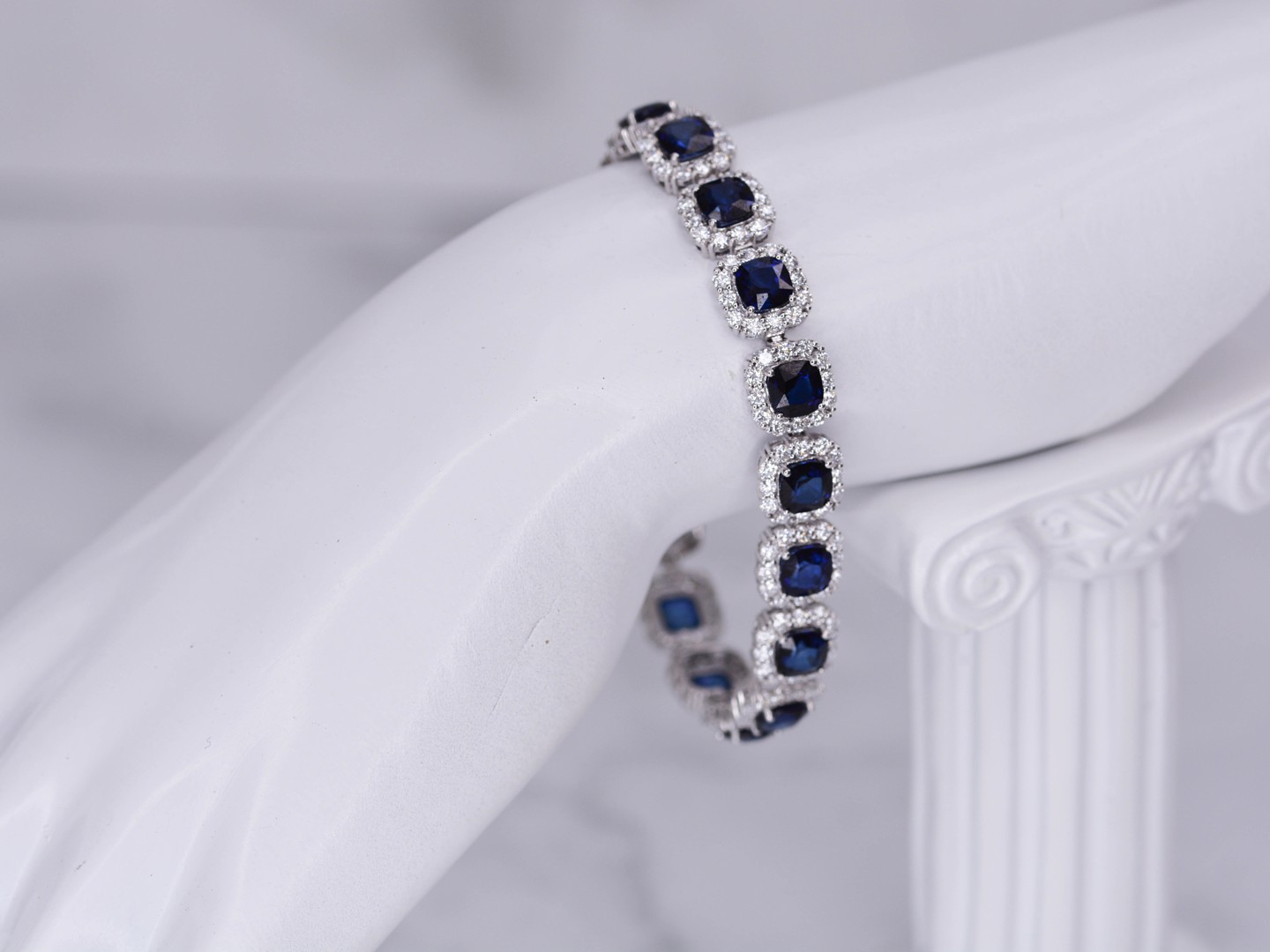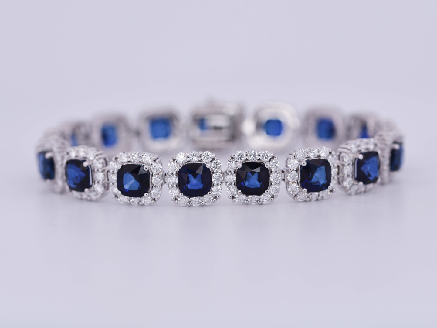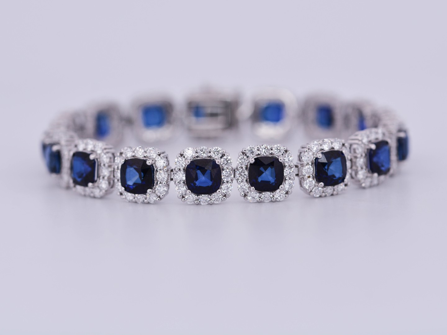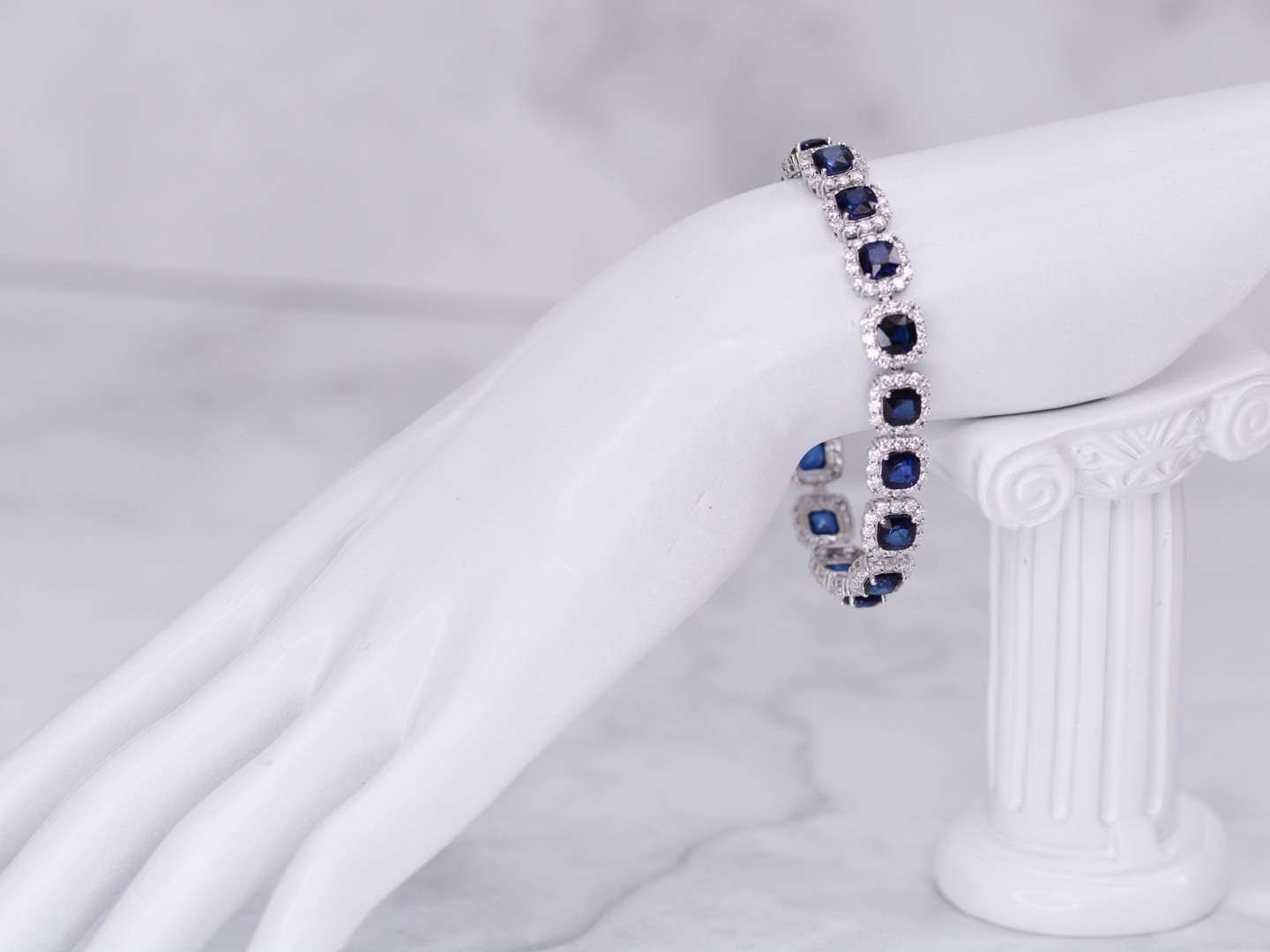 De intense, koninklijke blauwtinten van de saffieren contrasteren prachtig met de fonkelende helderheid van uitzonderlijk witte diamanten. Deze sublieme armband straalt elegantie en exclusiviteit uit, een juweel dat tegelijk verfijnd en majestueus oogt – een echte blikvanger in elke high-end collectie.