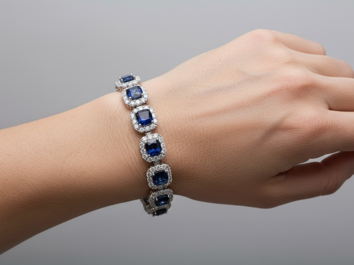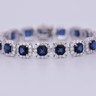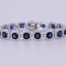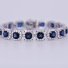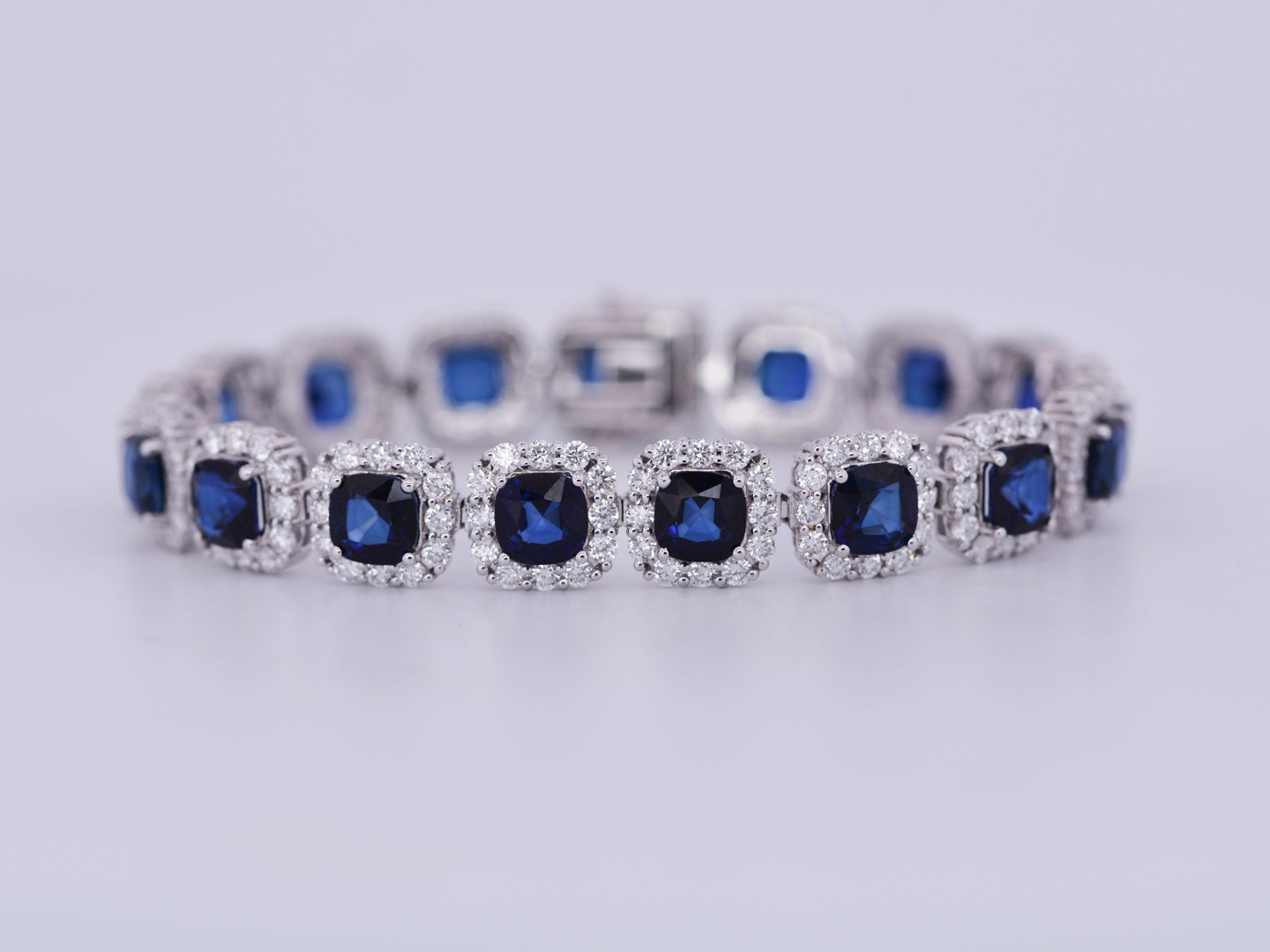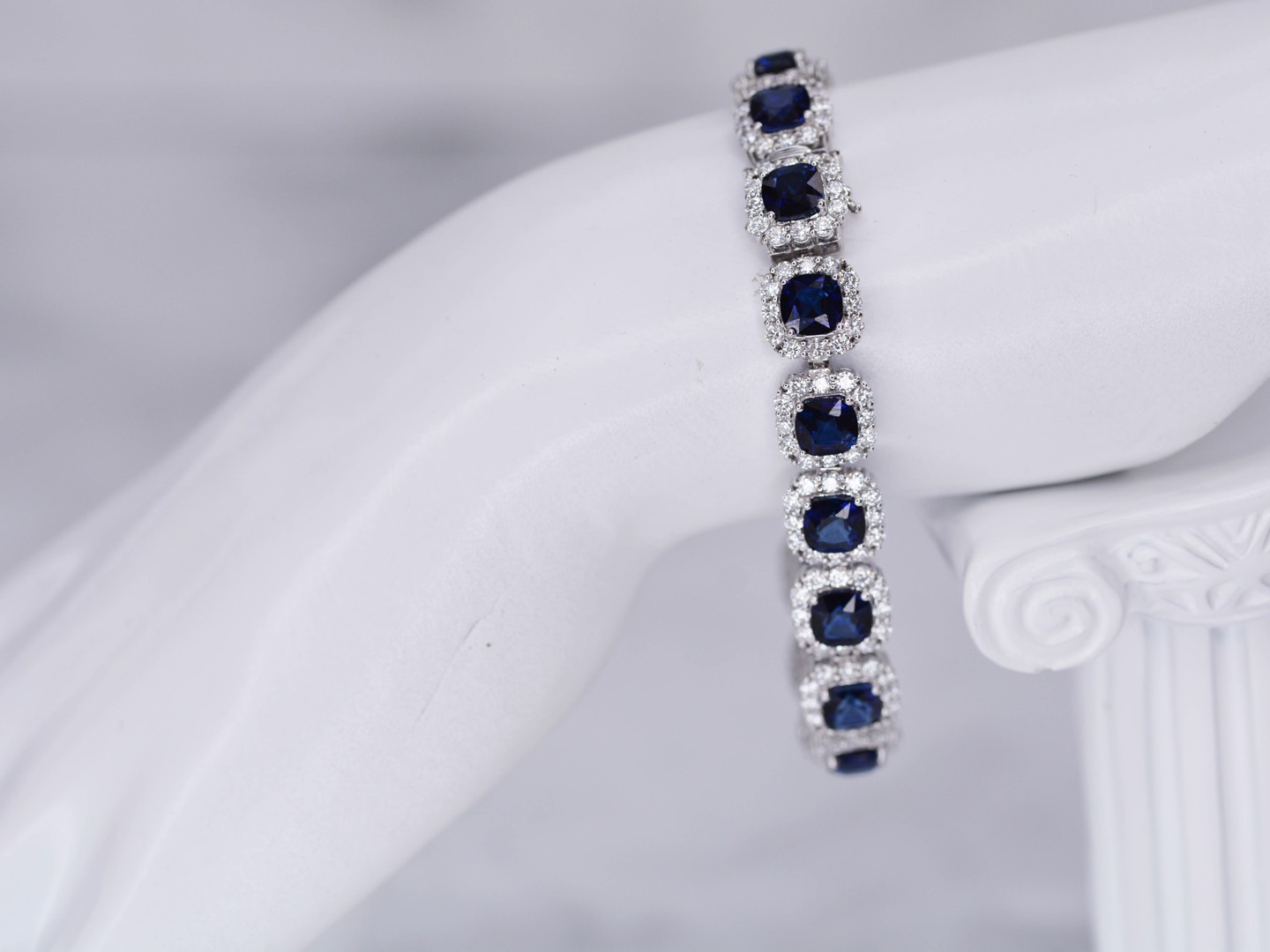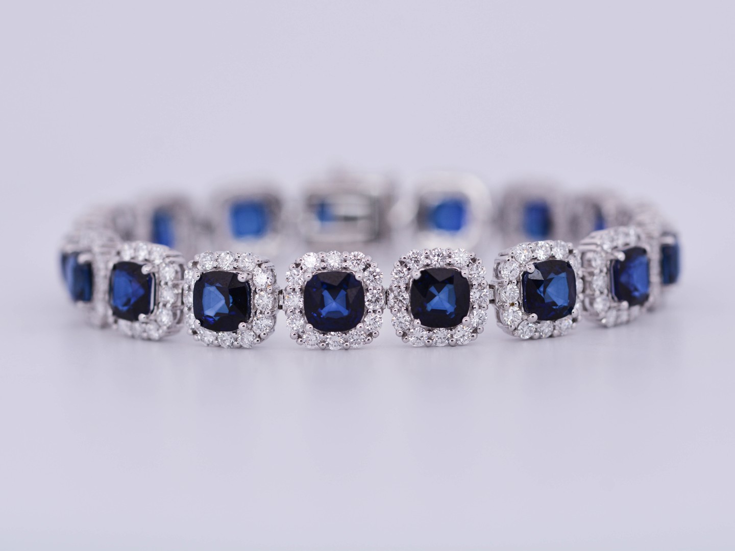 De intense, koninklijke blauwtinten van de saffieren contrasteren prachtig met de fonkelende helderheid van uitzonderlijk witte diamanten. Deze sublieme armband straalt elegantie en exclusiviteit uit, een juweel dat tegelijk verfijnd en majestueus oogt – een echte blikvanger in elke high-end collectie.