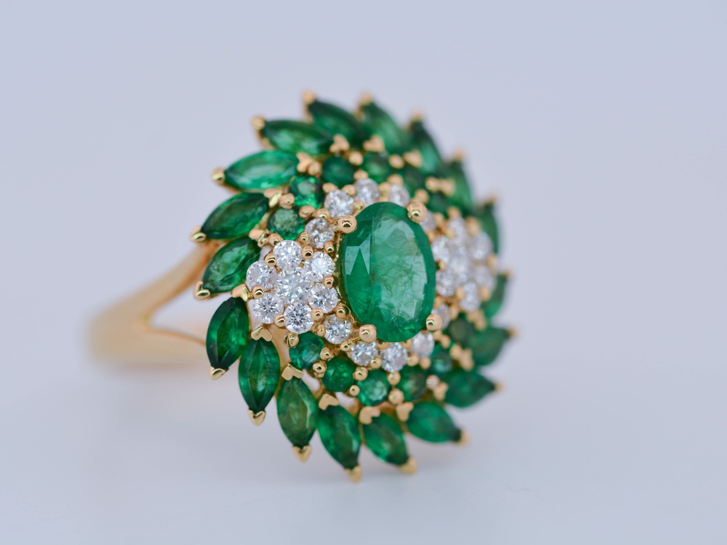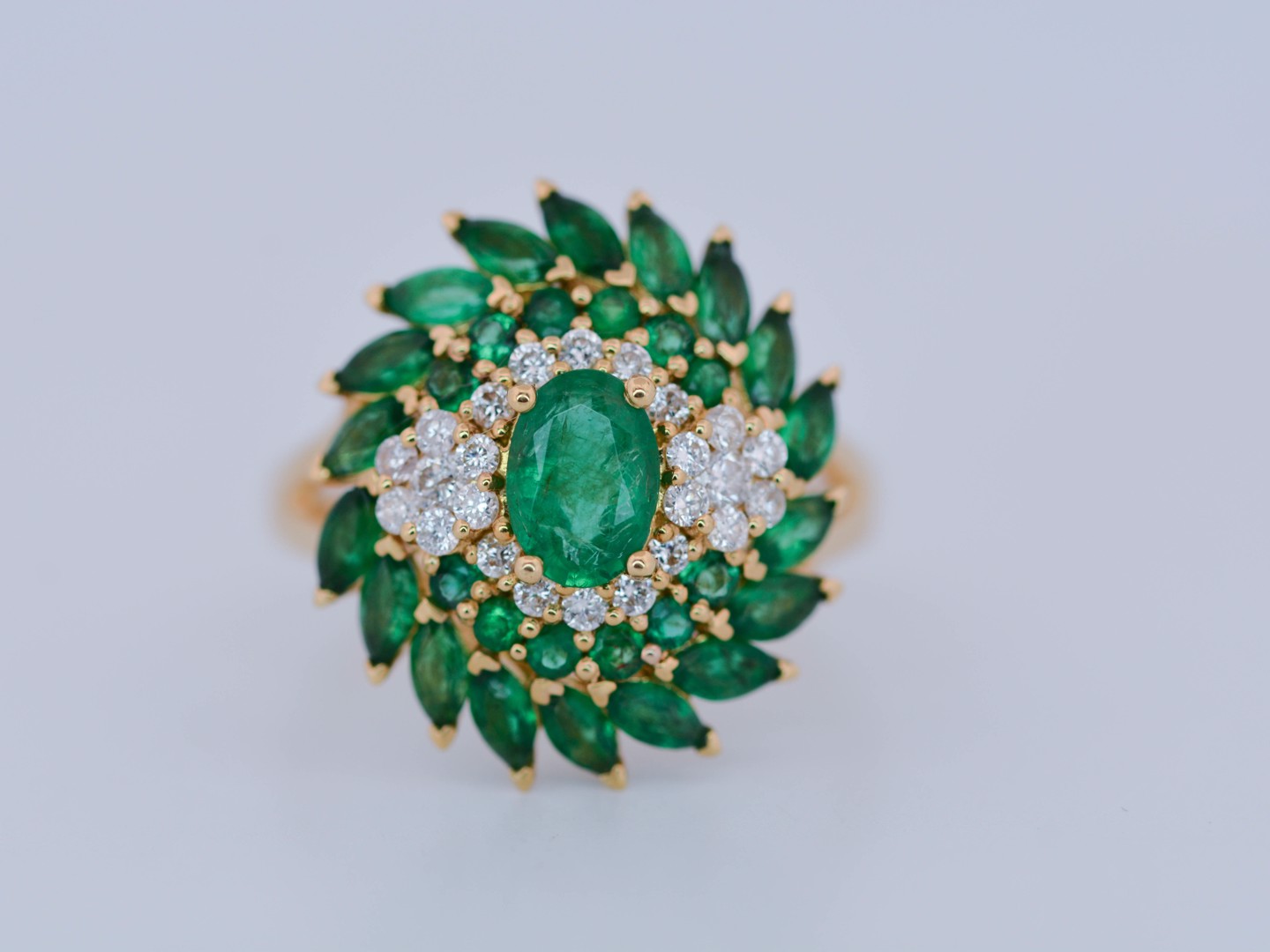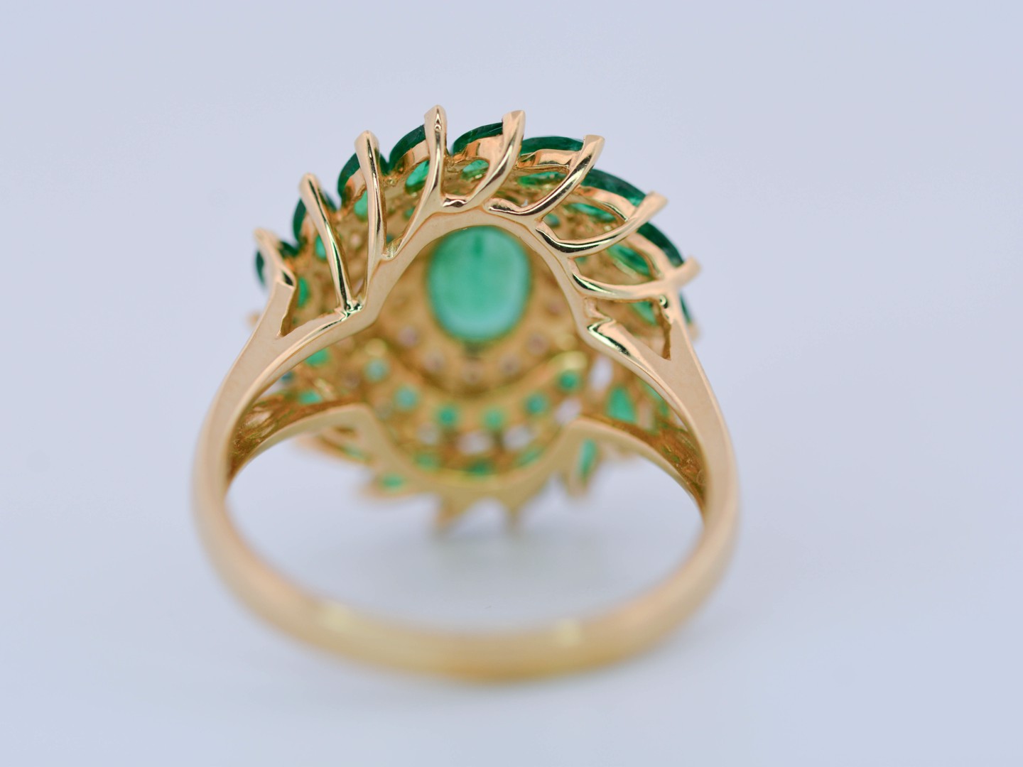 Sublieme ring in 18 karaat geel goud (gemerkt 750), bezet met een prachtige ovaal geslepen smaragd die het stralende middelpunt vormt van deze compositie. Rondom de centrale steen schitteren 18 marquise-geslepen diamanten en 12 briljantgeslepen diamanten, samen goed voor circa 2 karaat, aangevuld met een verfijnde rand van 24 extra briljanten van ongeveer 0,50 karaat. De diamanten hebben een kleur I en een zuiverheid VS tot SI, wat een warme, sprankelende schittering creëert die het diepe groen van de smaragd versterkt.