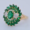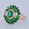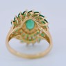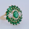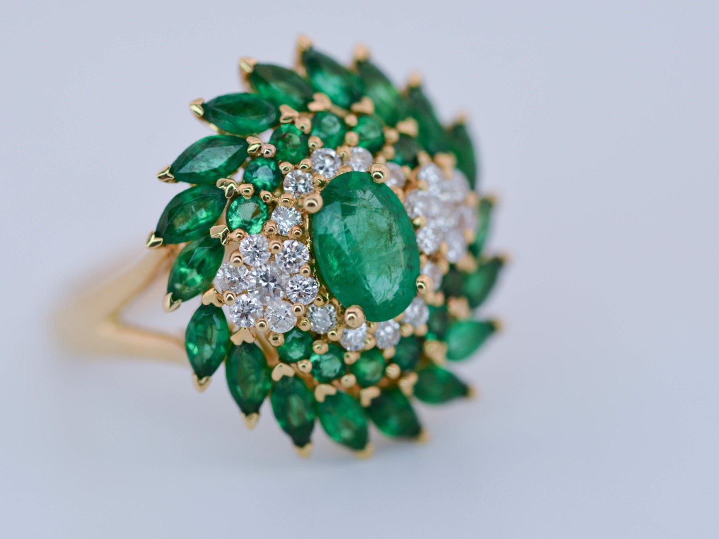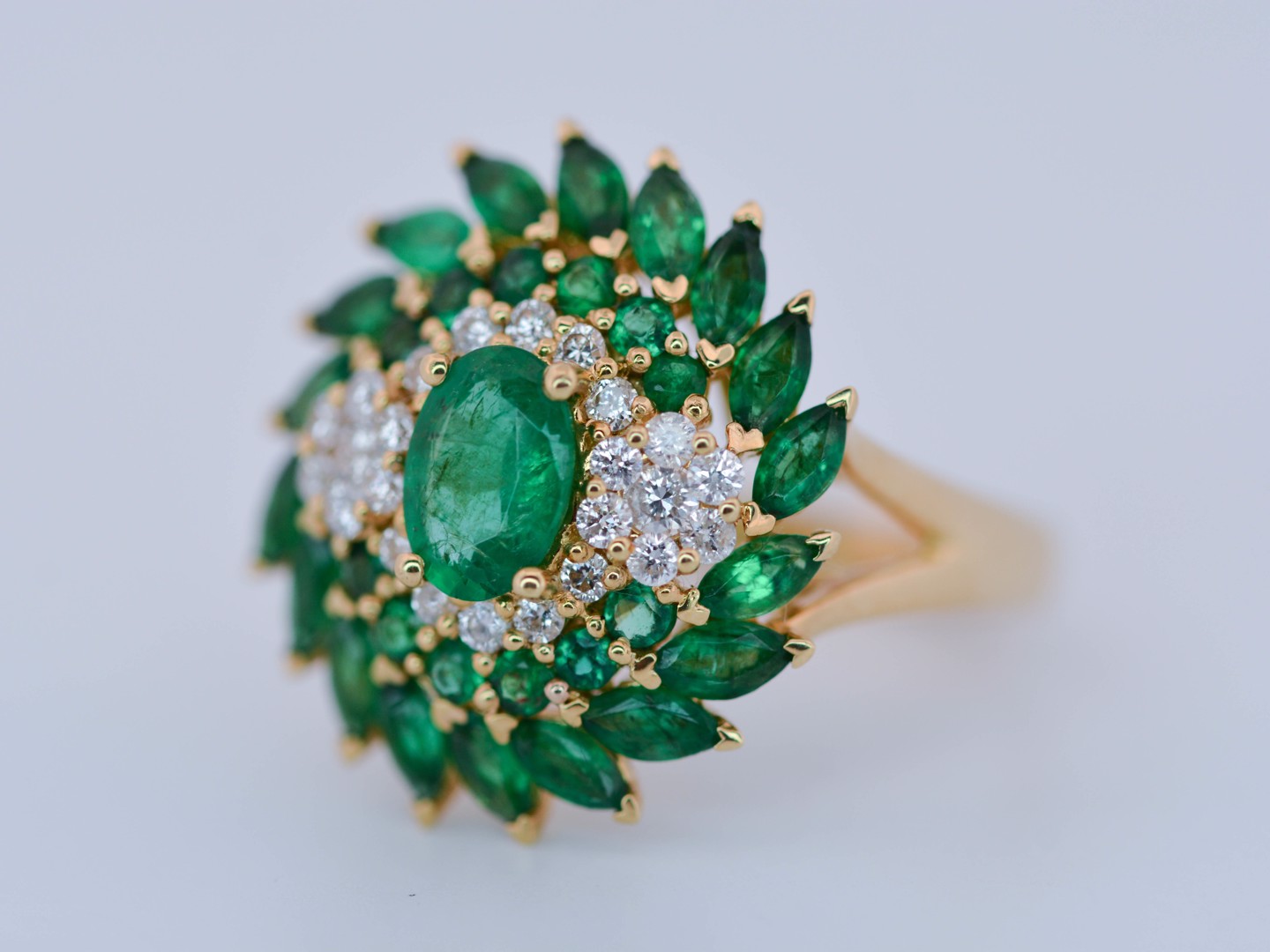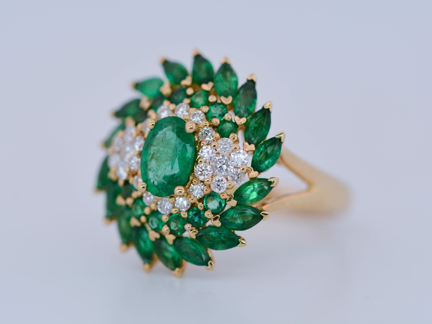 Sublieme ring in 18 karaat geel goud (gemerkt 750), bezet met een prachtige ovaal geslepen smaragd die het stralende middelpunt vormt van deze compositie. Rondom de centrale steen schitteren 18 marquise-geslepen diamanten en 12 briljantgeslepen diamanten, samen goed voor circa 2 karaat, aangevuld met een verfijnde rand van 24 extra briljanten van ongeveer 0,50 karaat. De diamanten hebben een kleur I en een zuiverheid VS tot SI, wat een warme, sprankelende schittering creëert die het diepe groen van de smaragd versterkt.