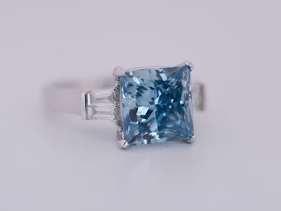 Kwaliteitsring met 4,5 ct Prinsesgeslepen Blauwe Diamant en 0,40 ct Witte Baguette-Diamanten