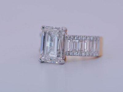 Sublieme Geelgouden Ring met +- 5 ct Smaragdgeslepen Diamant en 1,80 ct Briljant- en Baguettediamanten