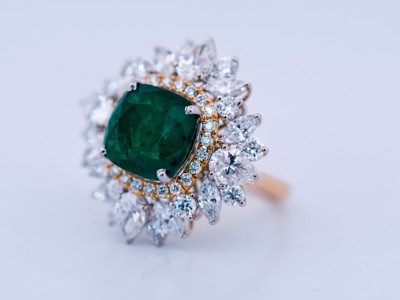 Enige ring met 1 smaragd vivid green, omringd door witte diamanten: peer, marquise en briljant geslepen