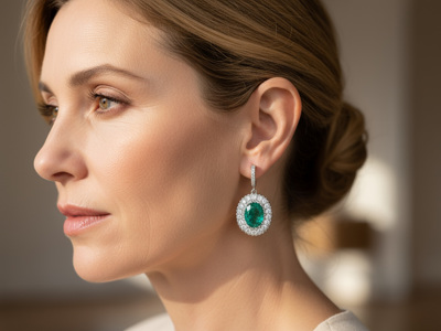 Paar sublieme oorhangers bezet met 2 smaragden vivid green +-14.00CT omringd door 36 grote briljanten: + 14 kleine briljanten: +-3.60CT. Kleur: G-H en zuiverheid: VS.